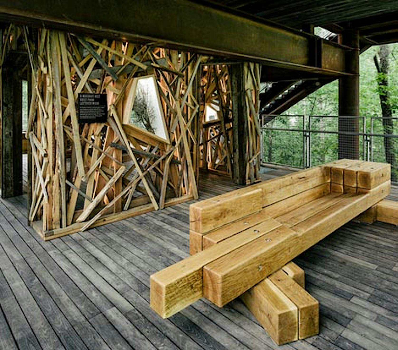 A bench offers a place to rest and take in the surrounding tree canopy. Creating opportunities for contemplation is another key element of the structure's design.