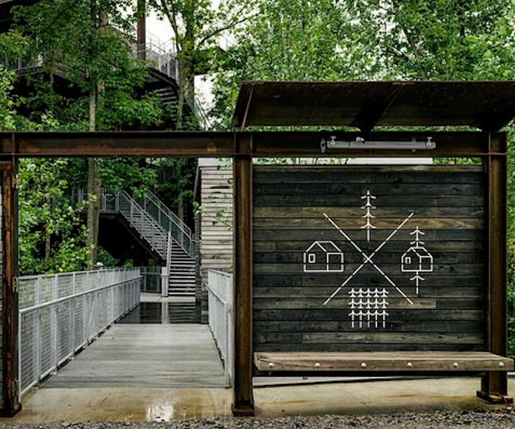The Sustainability tree house is home base for the National Scout Jamboree, a weeklong event that's usually held every four years. The 2013 event was the first held at the new location in the Summit Bechtel Reserve. Seattle-based firm Mithun led the multidisciplinary team that worked on the project. BNIM is the architect of record, Nelson Byrd Woltz masterminded the landscaping, the structural engineering is by by Tipping Mar, and the exhibit design is by Volume, Inc. and Studio Terpeluk.