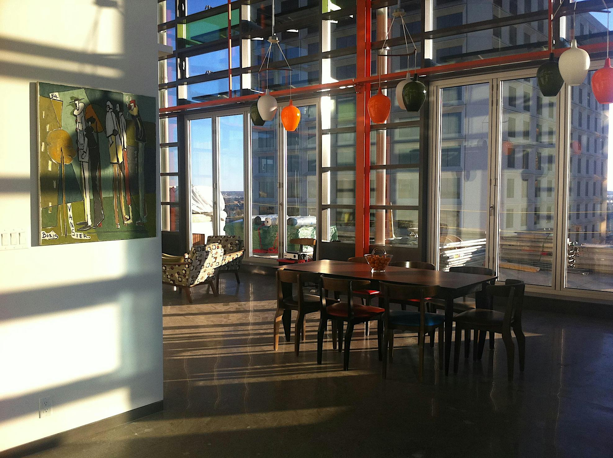 The Cambridge Lofts Penthouse is interesting for a number of reasons. First, it is on the 19th floor of a building in Edmonton with temperatures that reach -10 to -40 C. Second, it is the personal residence of Canadian architect Vivian Manasc. And third, the project is full of sustainable features; Manasc has received awards and recognition for sustainability. Read on to learn more about her colorful and innovative condo in downtown Edmonton. The Cambridge building used to be an office building. However, it sat vacant for years before it was converted into residential condos. The mechanical system from the 1960’s was removed during the renovation, leaving the mechanical room at the top of the building empty. This is exactly where Vivian Manasc built her penthouse residence, using the wasted heat generated by the vintage elevator to heat the space. This is just one of the many sustainable features she incorporated into the design. Another essential component of the design is the expansive vistas from the home perched atop a high-rise. Views that never seem to end. Walls of glass that allow in all sorts of light – from sunrise, to sunset, to the night lights of the city. And a folding wall of glass that opens completely to the rooftop. Manasc is also planning on creating an outdoor rooftop terrace for entertaining, with deck furniture, potted plants, and more.