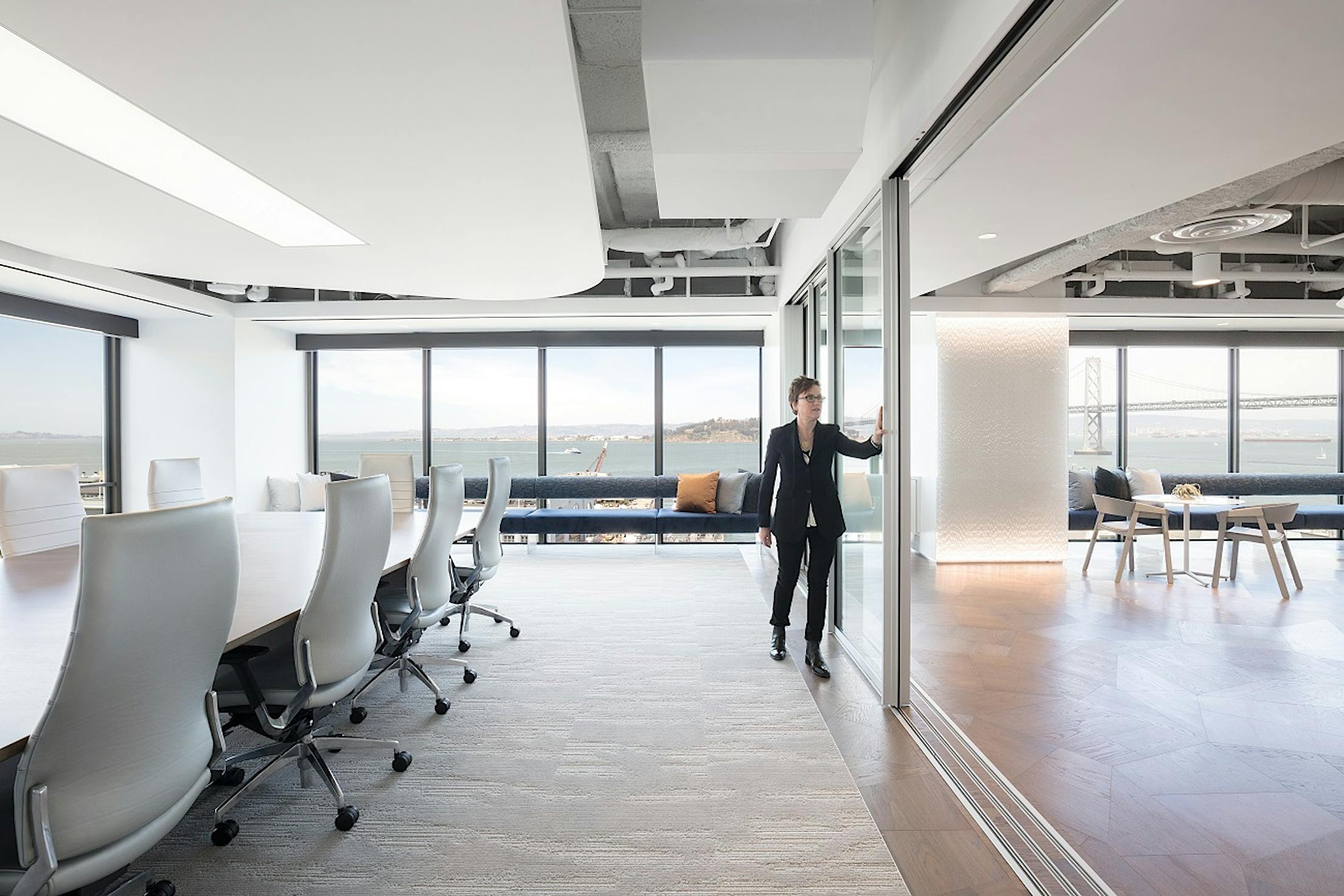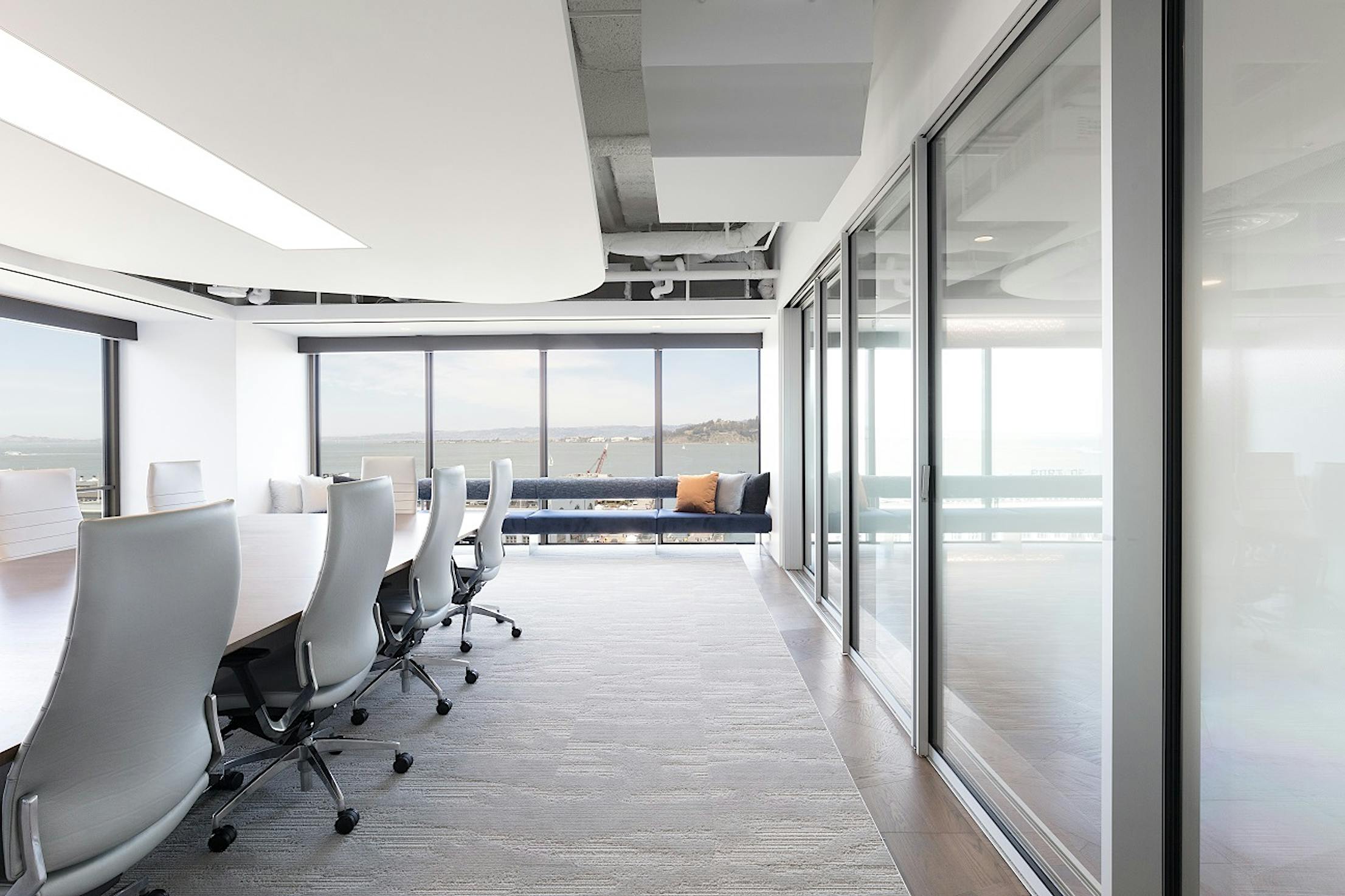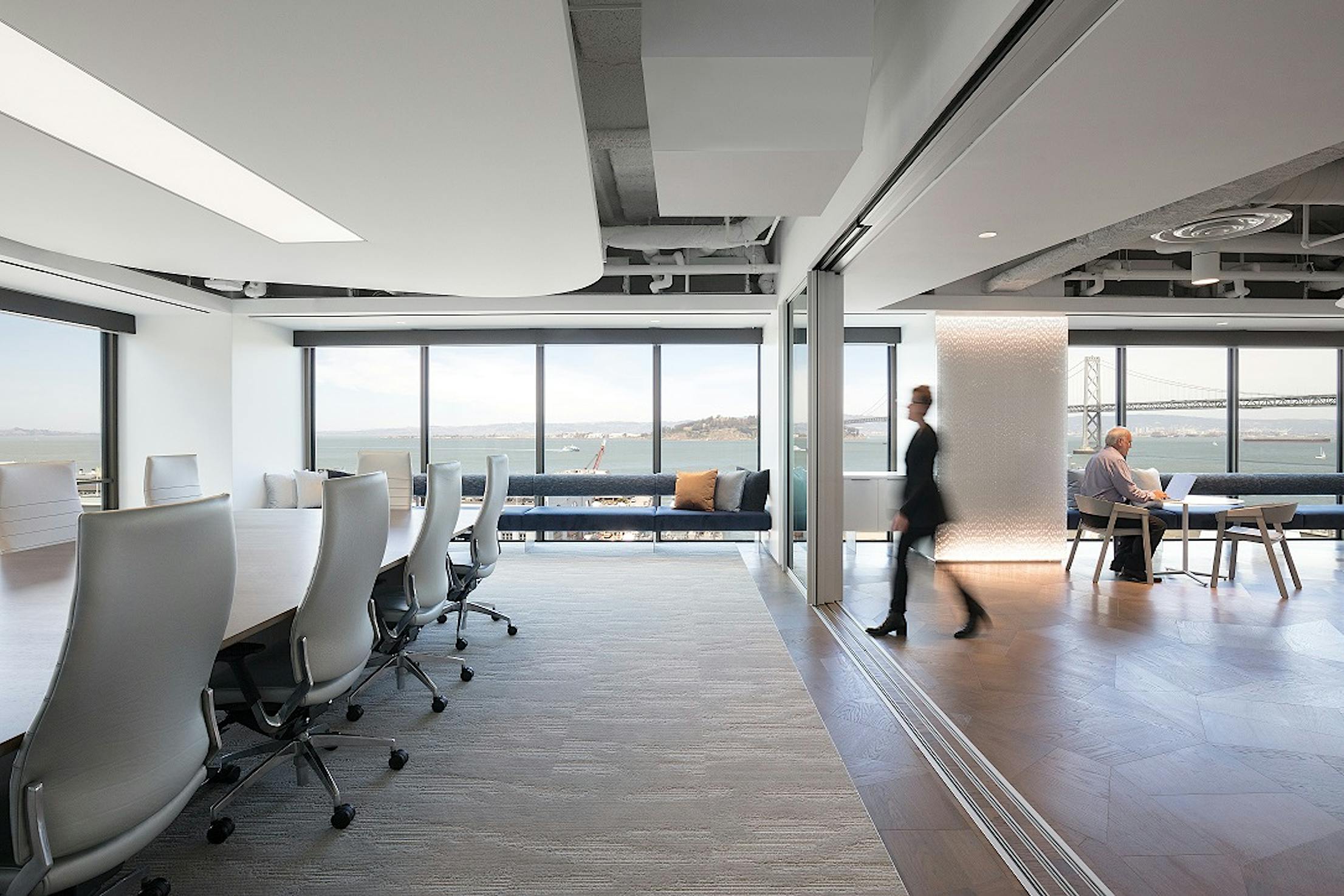 Visa’s new floor of offices is divided into halves. One half of the new floor is overflow office space. The other half is a suite of executive conference rooms, including a large boardroom and two smaller conference rooms that overlook the bay and take advantage of its sweeping views.