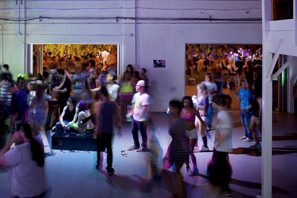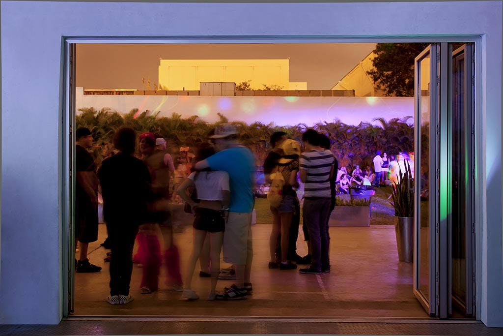 Miami is known for its nightlife, with some of the best party hotels and nightclubs in the world. In midst of all the mayhem is NanaWall – partying it up at Awarehouse, rated the Best Place to Throw a Party 2011. It’s not your typical nightclub or soulless event space. Awarehouse is a unique venue, a place where art fanatics can wander through mazes of art exhibits, graffiti artists create pieces live on the patio, and indie-electro music fans bang their heads all night long. It’s a blank canvas to bring any avant-garde idea to life. Our photographer, Lawrence Anderson, visited Awarehouse to shoot the NanaWall accordion doors during a party. But what he didn’t expect was to find himself in the middle of a Rave, with 1500-2500 people in attendance! All of a sudden he was surrounded by glow sticks and house music, while doing a professional photo shoot. But he managed to stay focused, and captured the amazing shots pictured below.
