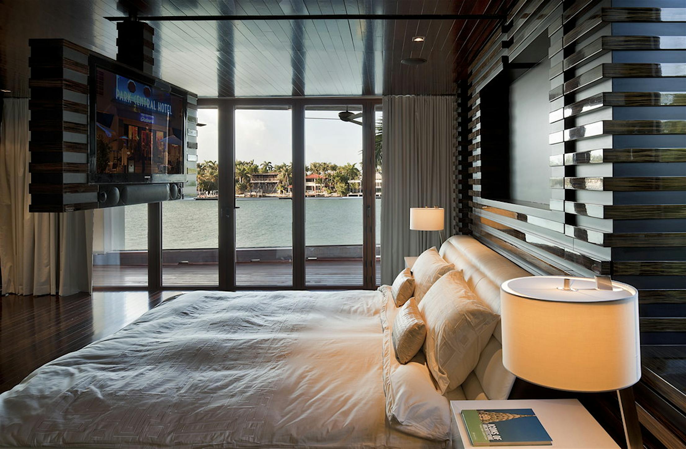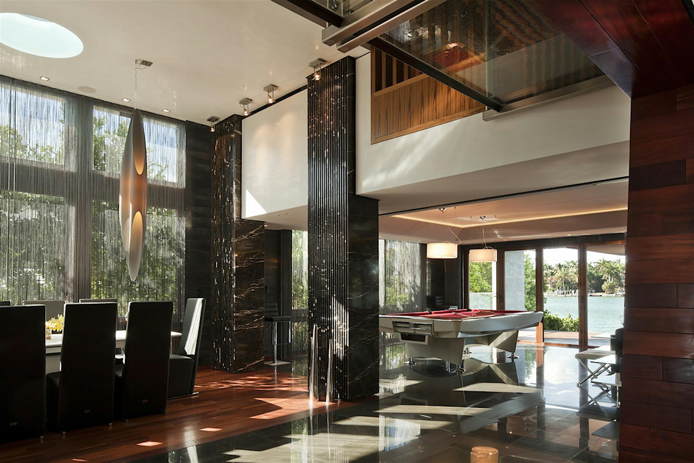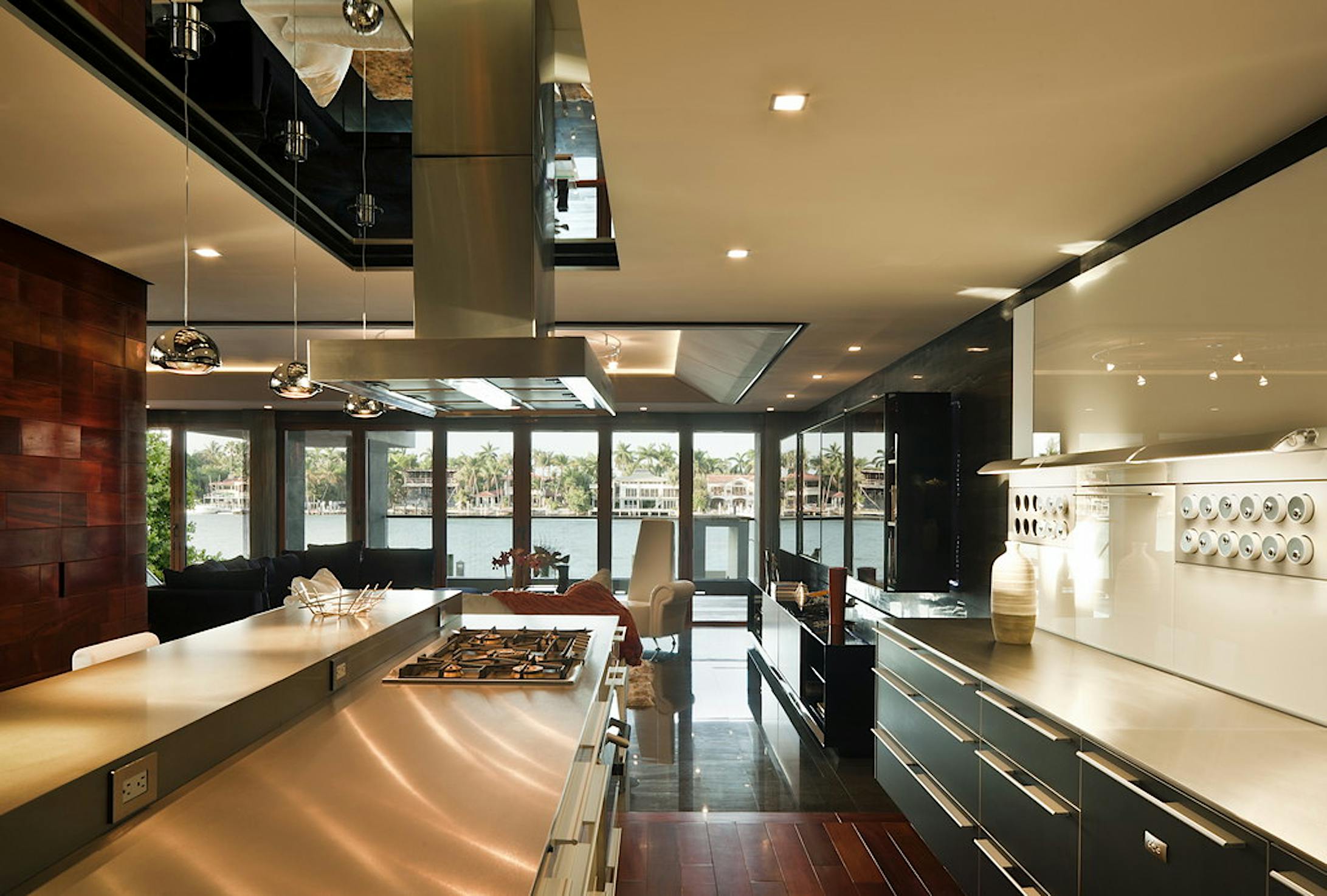 Folding glass NanaWall doors in the living room and master bedroom, where a 20’ wall spans the width of the entire home, offer breathtaking views of Biscayne Bay.