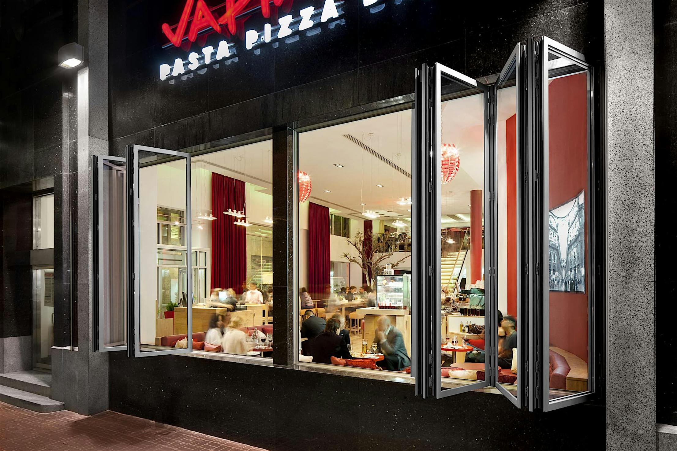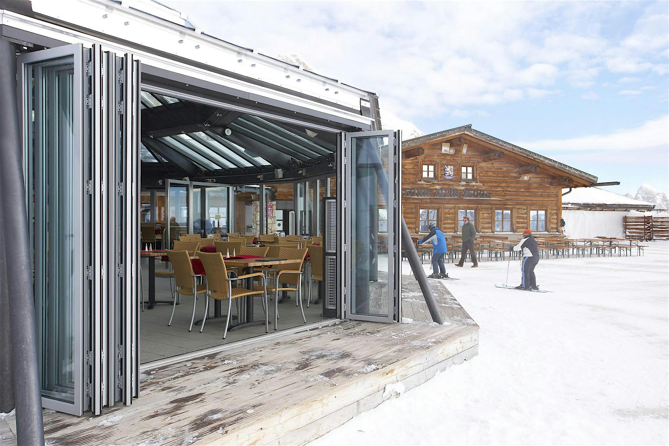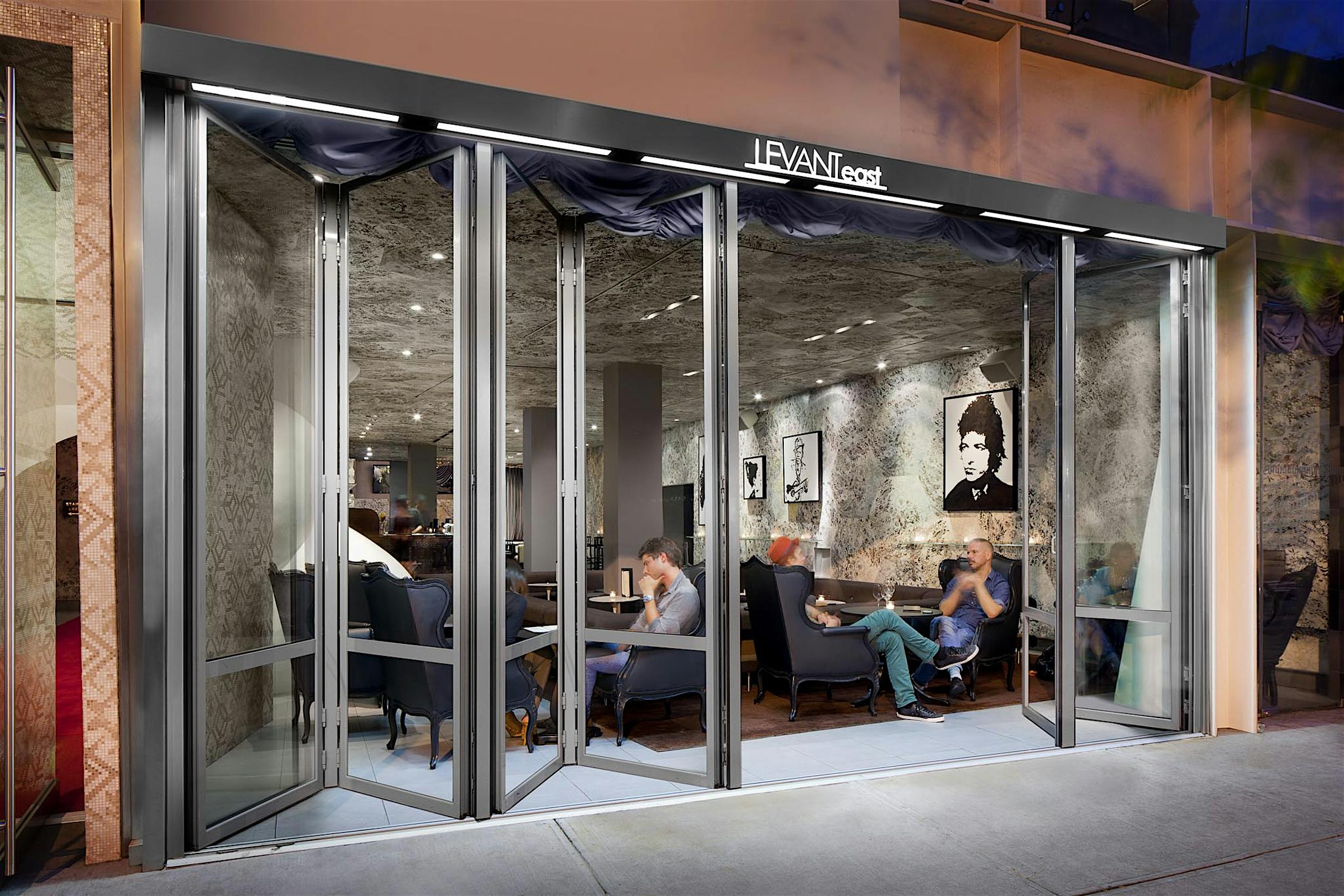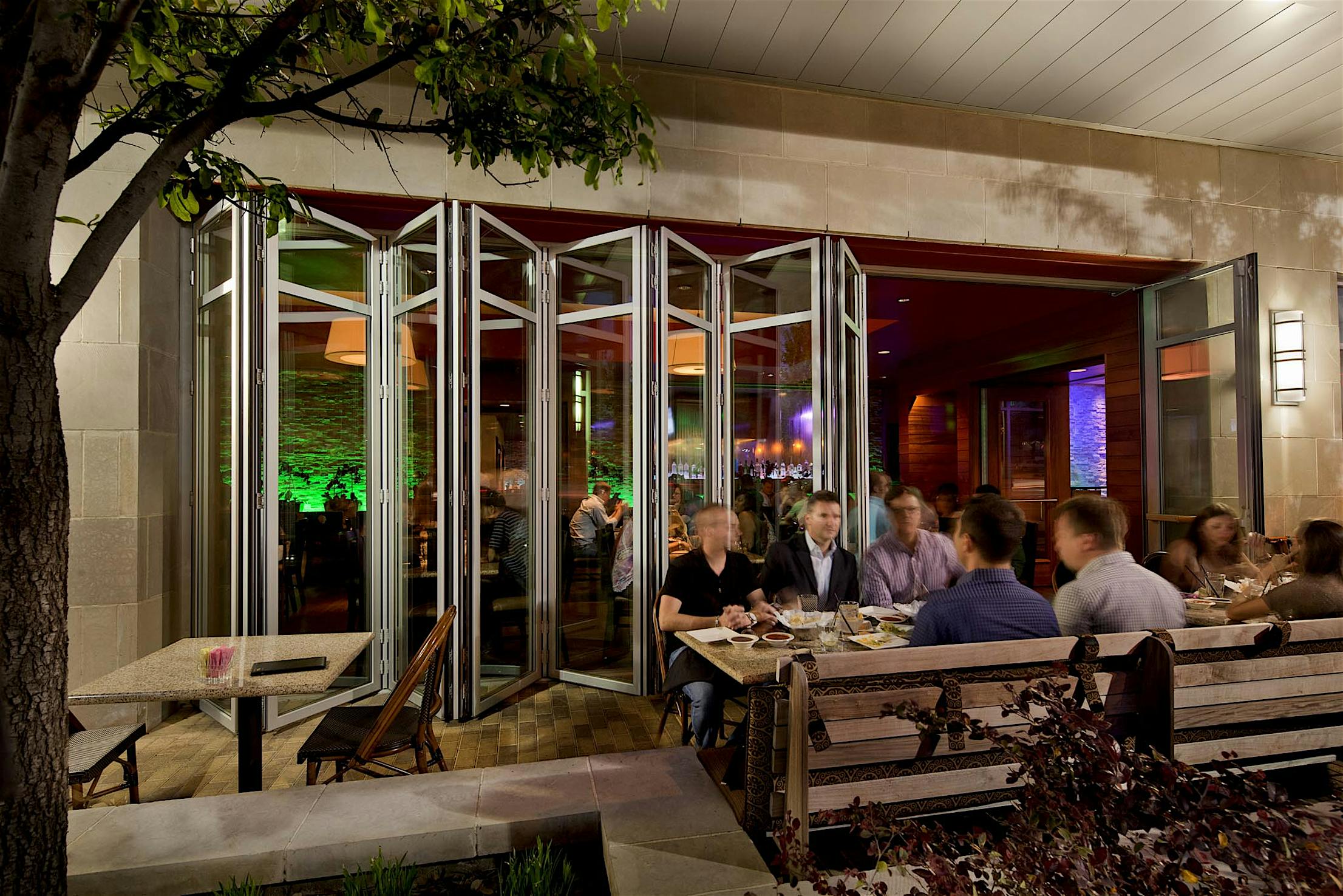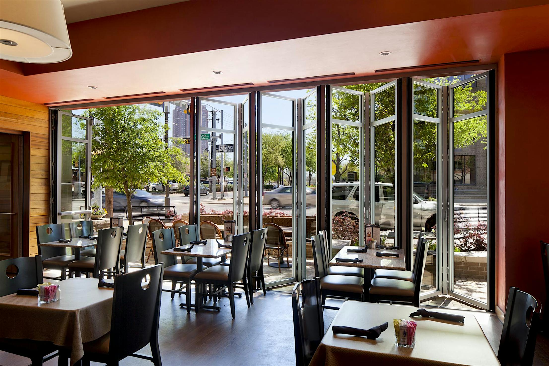 A wide-open entrance created by commercial patio door systems removes the barrier between street and restaurant to allow a free flow of customer traffic. Passersby easily see the food and immediately enjoy the restaurant’s ambience and entertainment.