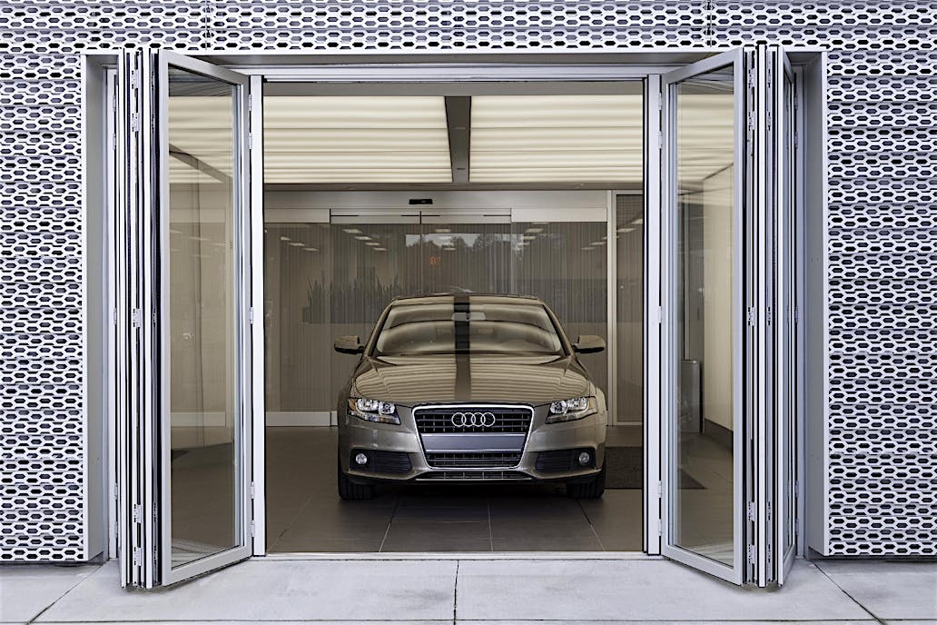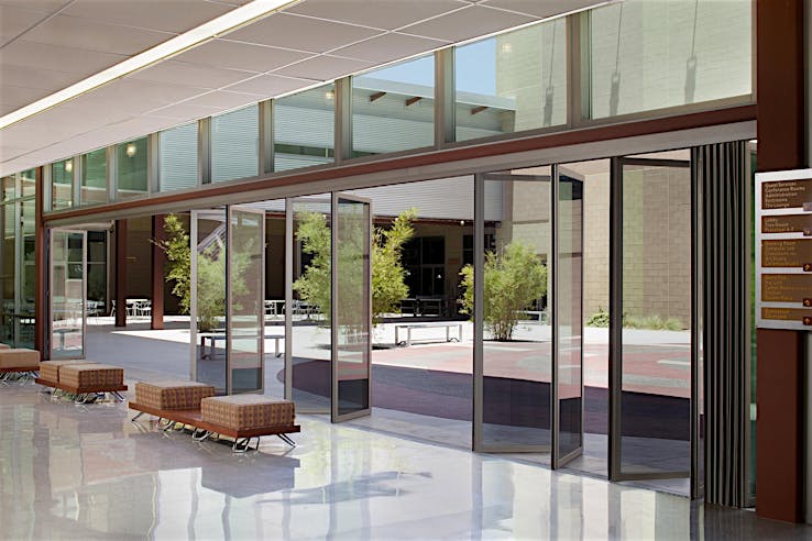 Aluminum framed folding glass door providing value for up to STC 34 acoustical ratings. Also designed to solve specific architectural challenges including segmented curves, 180° stacking panels, and inward or outward folding panels in the same opening.