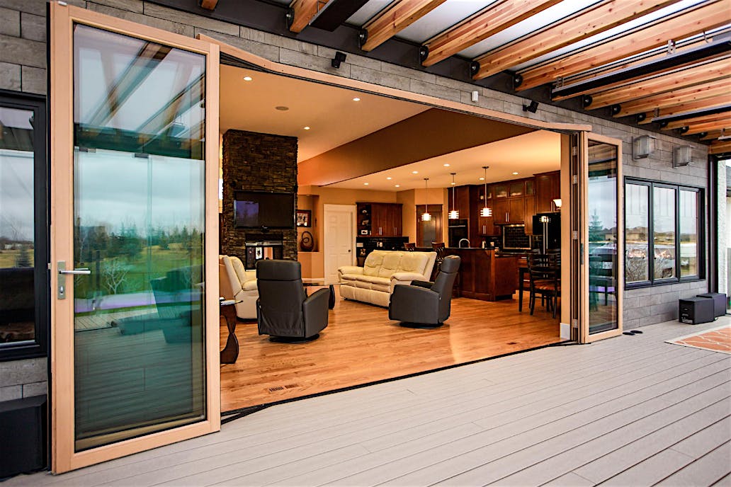 Transform your space with the clean-lined aesthetics of our folding glass doors — available in aluminum, wood, aluminum clad, or frameless.