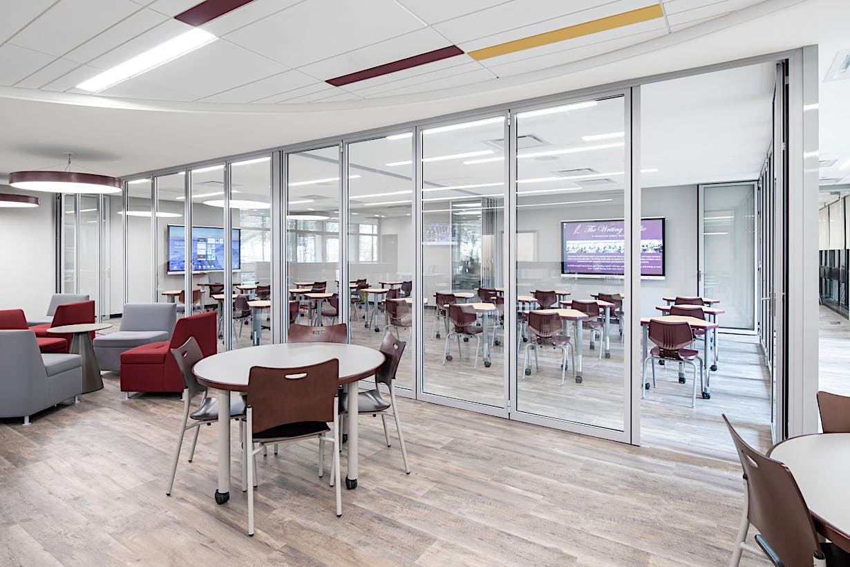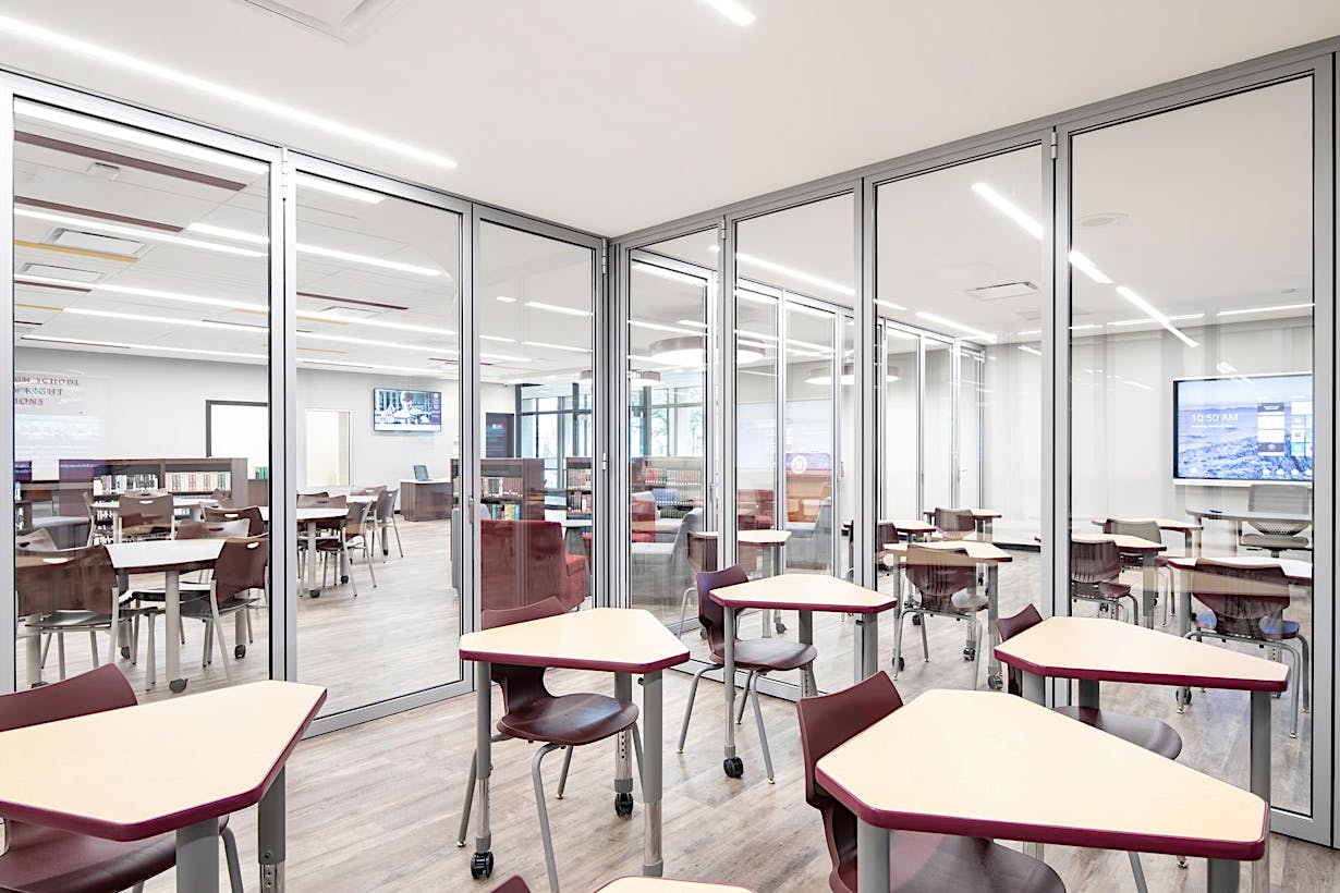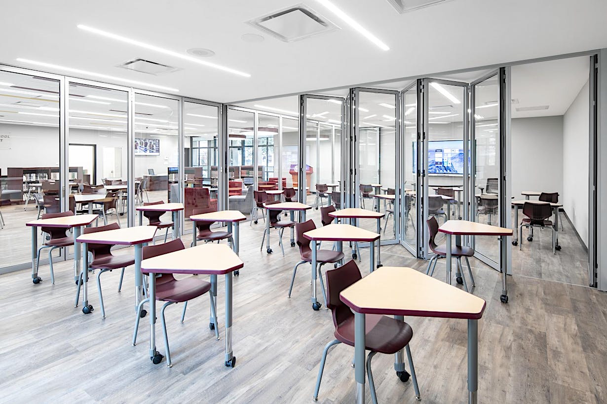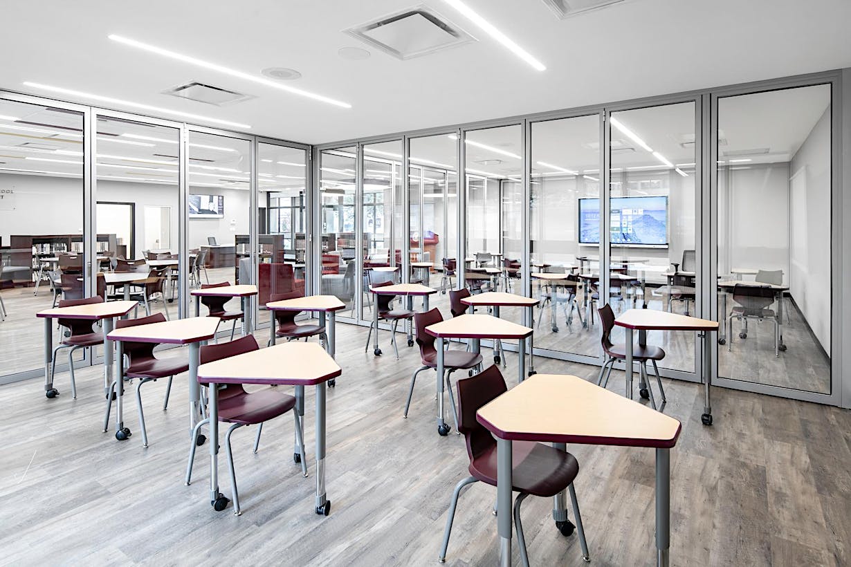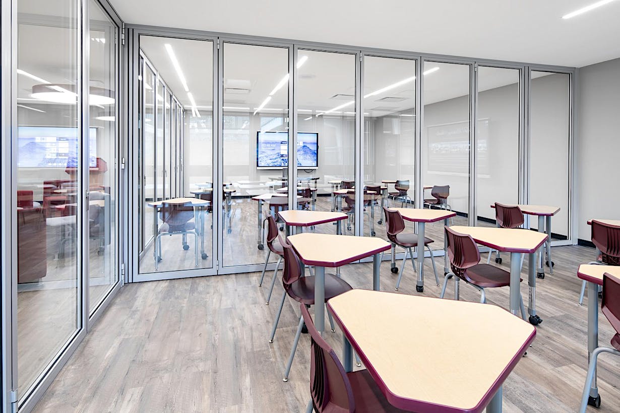 Although the school’s original vision included fixed metal and glass walls that would form two separate classrooms, the architect proposed a more dynamic design with acoustic glass wall systems to provide maximum flexibility of space.