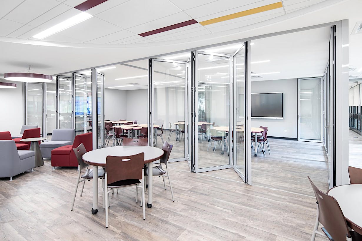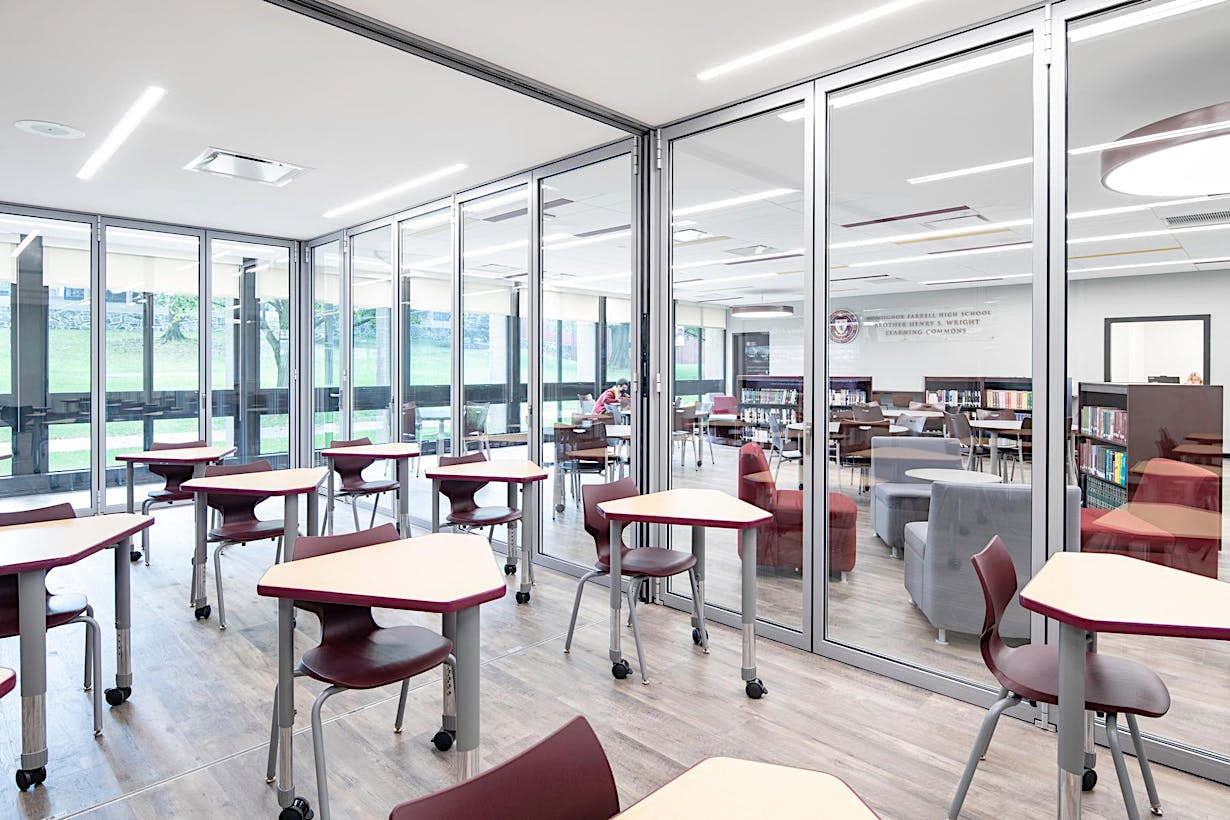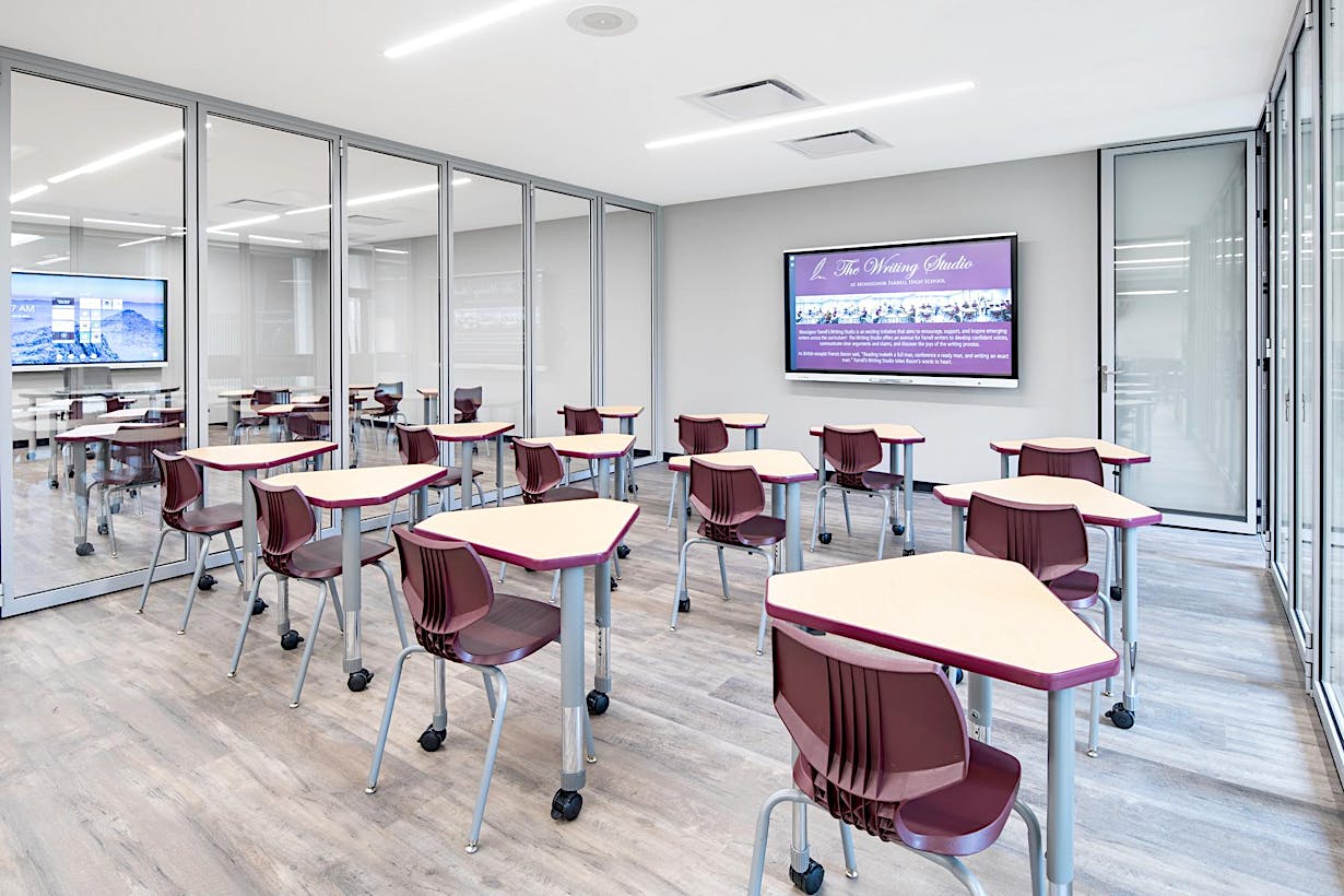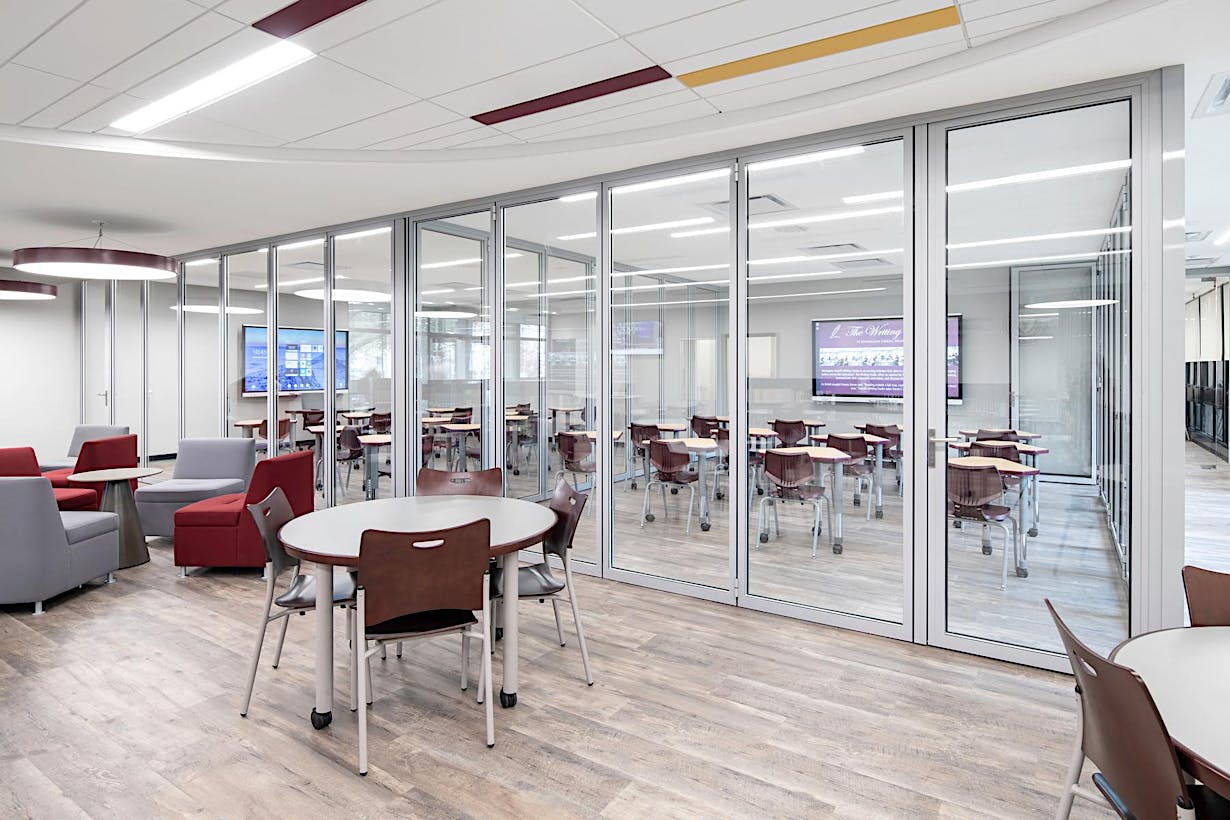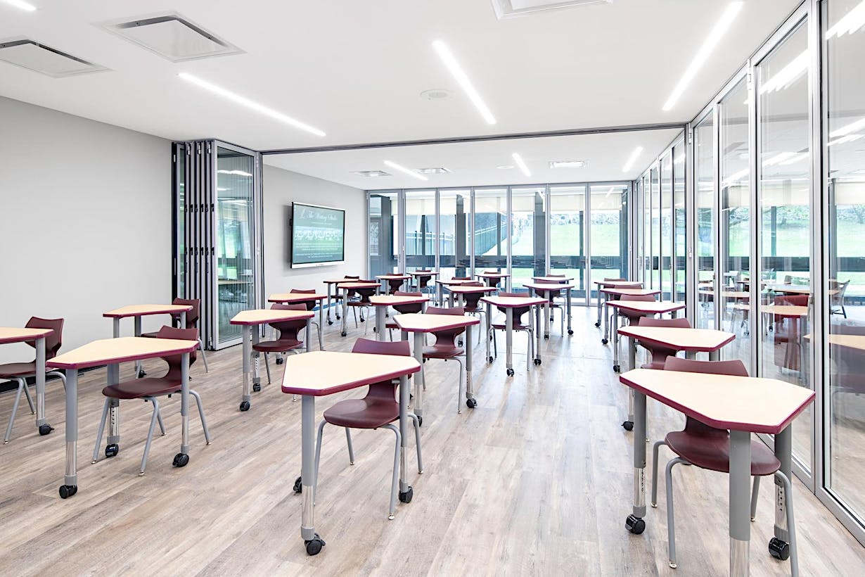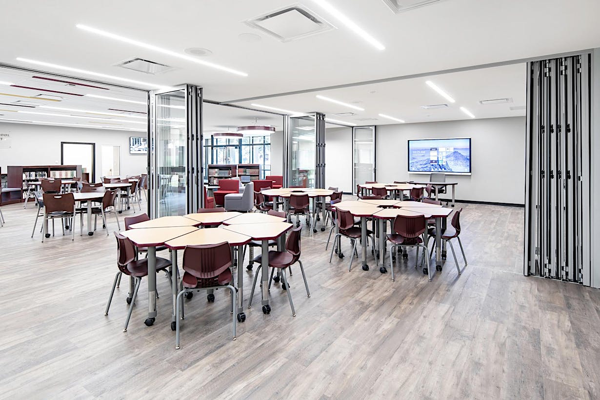 Although the school’s original vision included fixed metal and glass walls that would form two separate classrooms, the architect proposed a more dynamic design with acoustic glass wall systems to provide maximum flexibility of space.