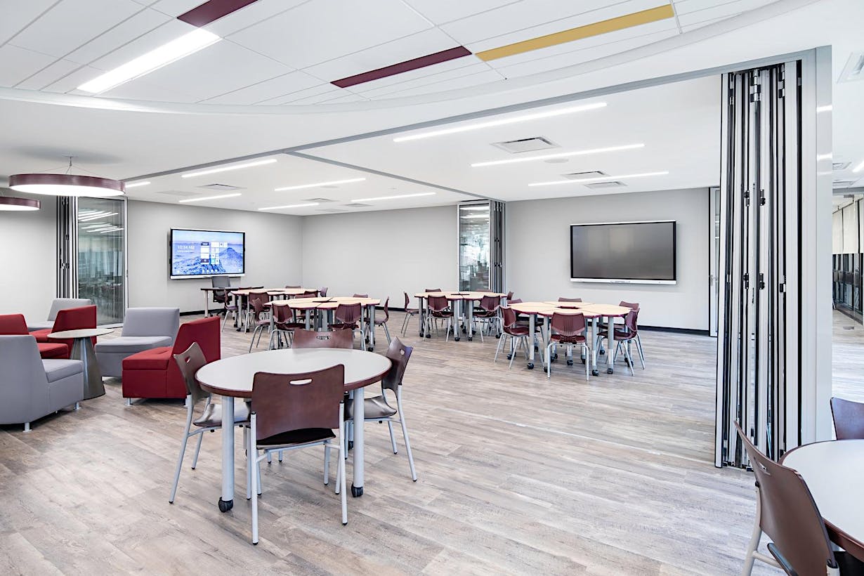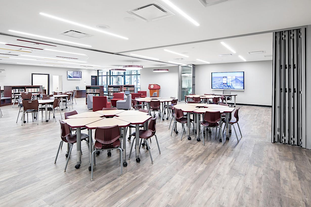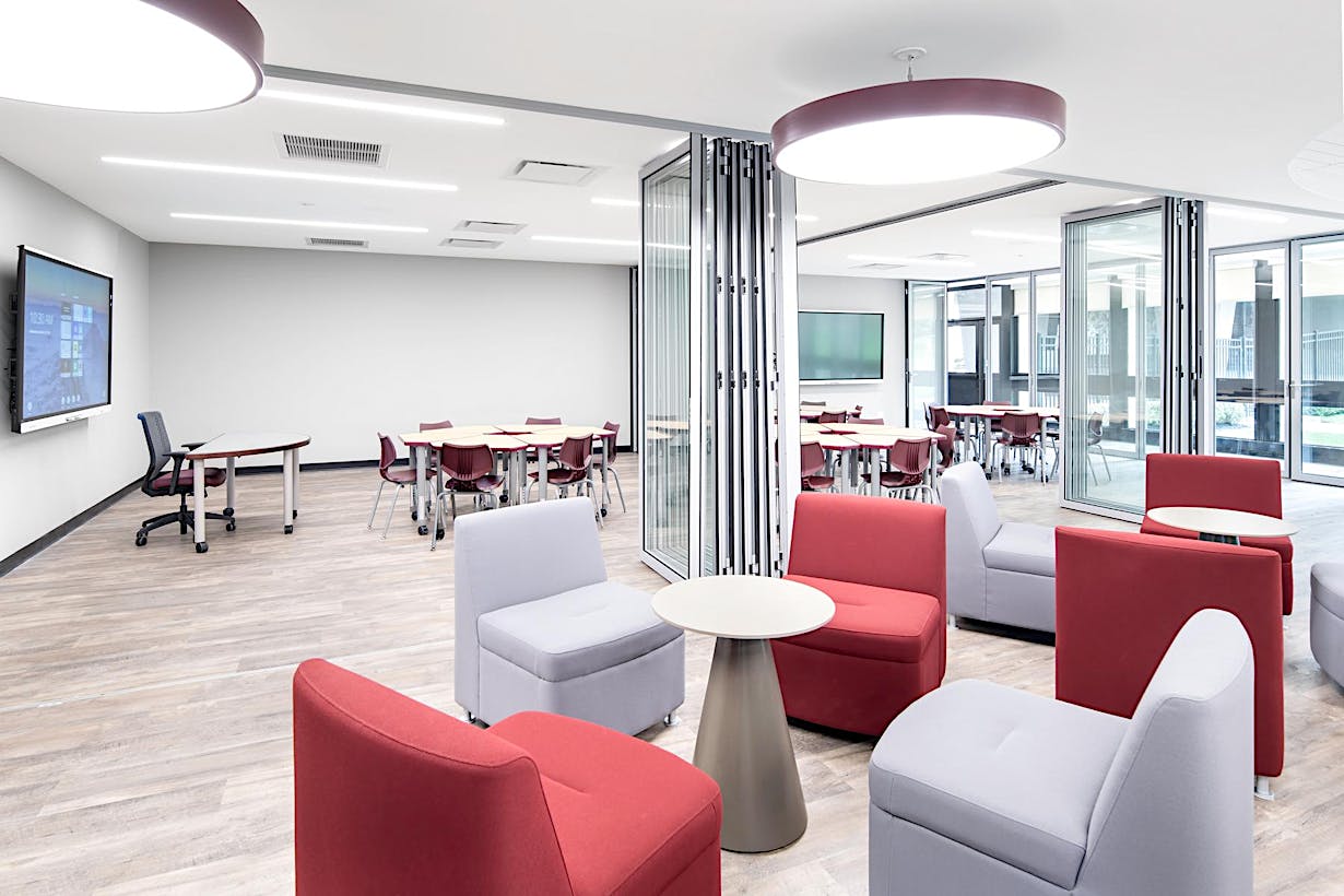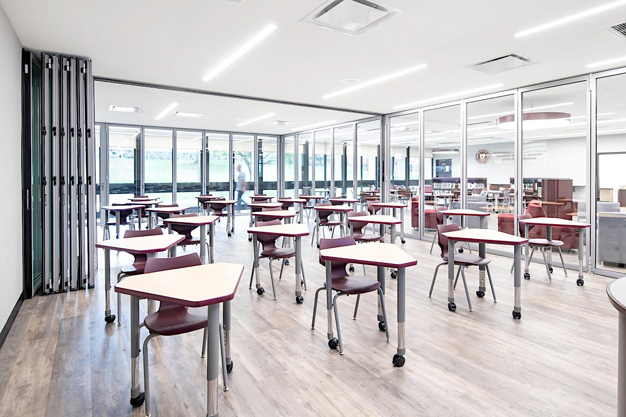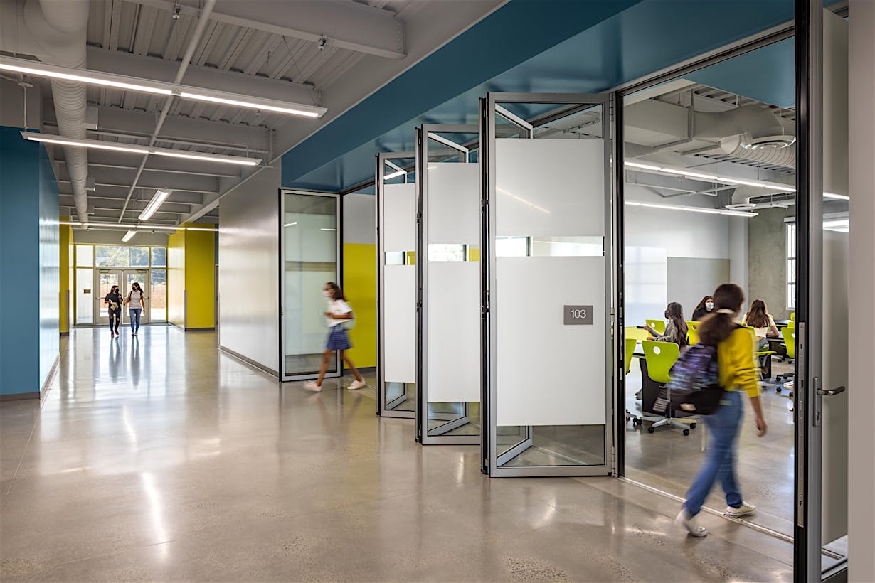 Although the school’s original vision included fixed metal and glass walls that would form two separate classrooms, the architect proposed a more dynamic design with acoustic glass wall systems to provide maximum flexibility of space.