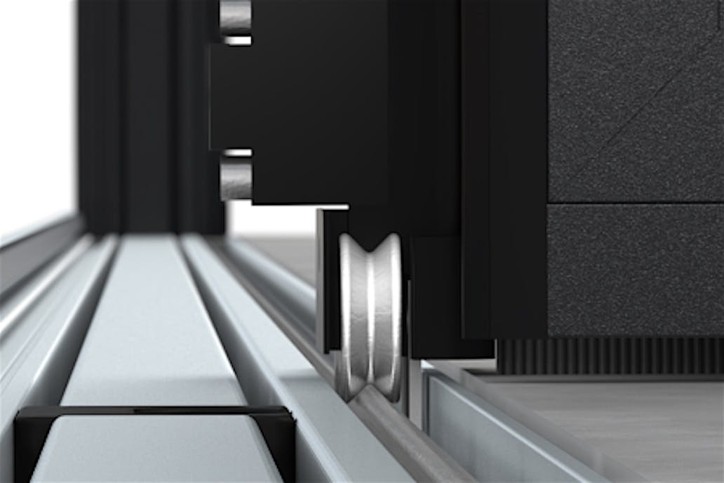 The running carriage rolls above the water table on two stainless steel wheels with a unique Gothic arch design supported by a double row of ball bearings. With a 2-point contact of each wheel to the floor track, the system glides quietly and smoothly with less friction by providing an equal distribution of weight on the stainless steel track.