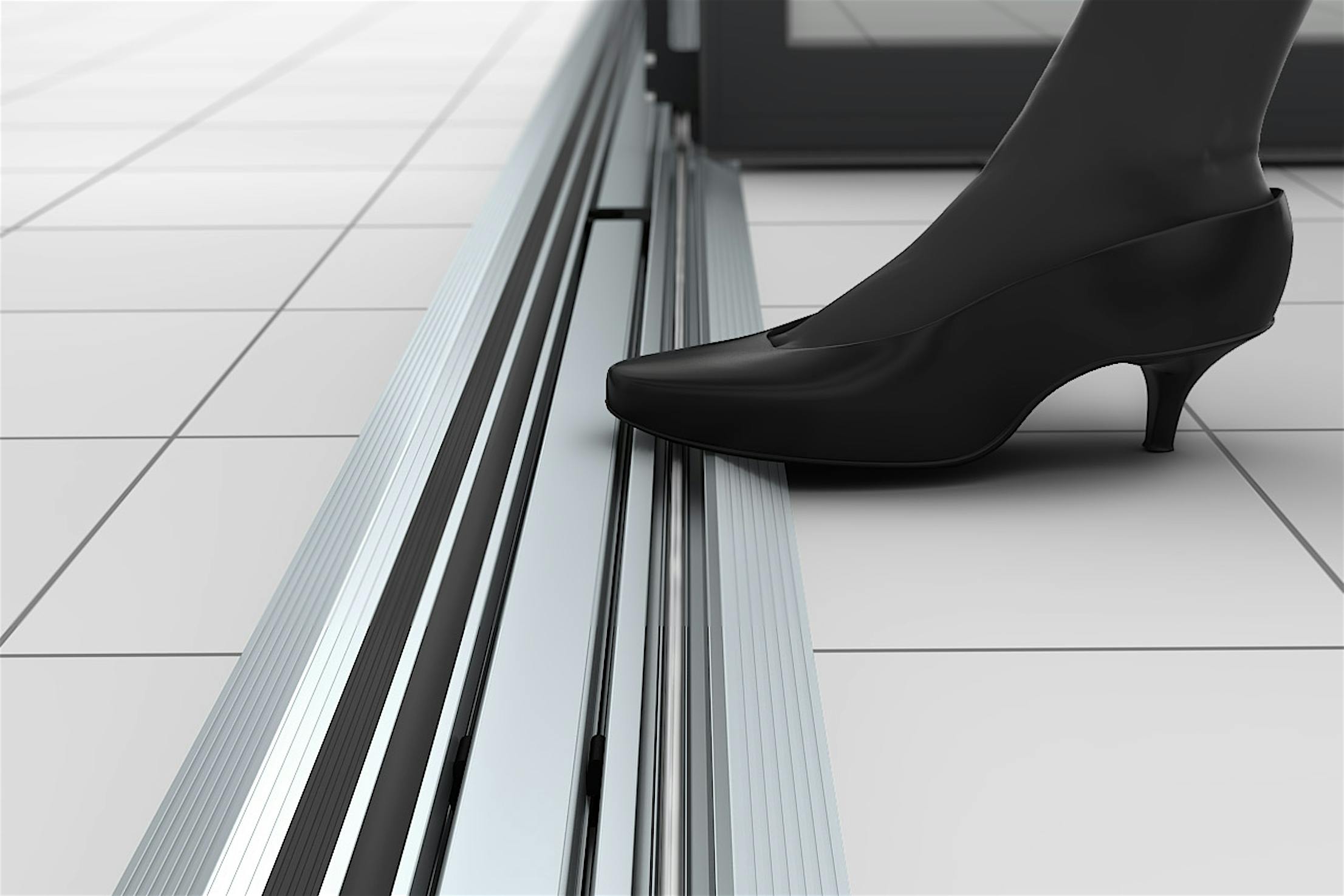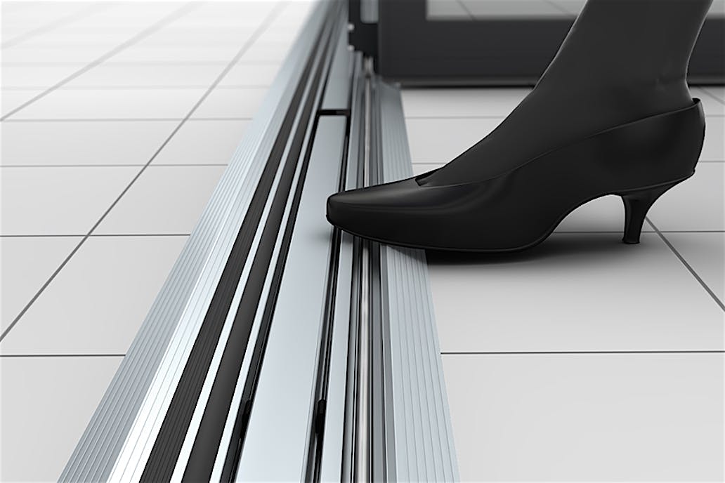 - Creates barefoot and heel friendly transitions while protecting from debris accumulation in floor track