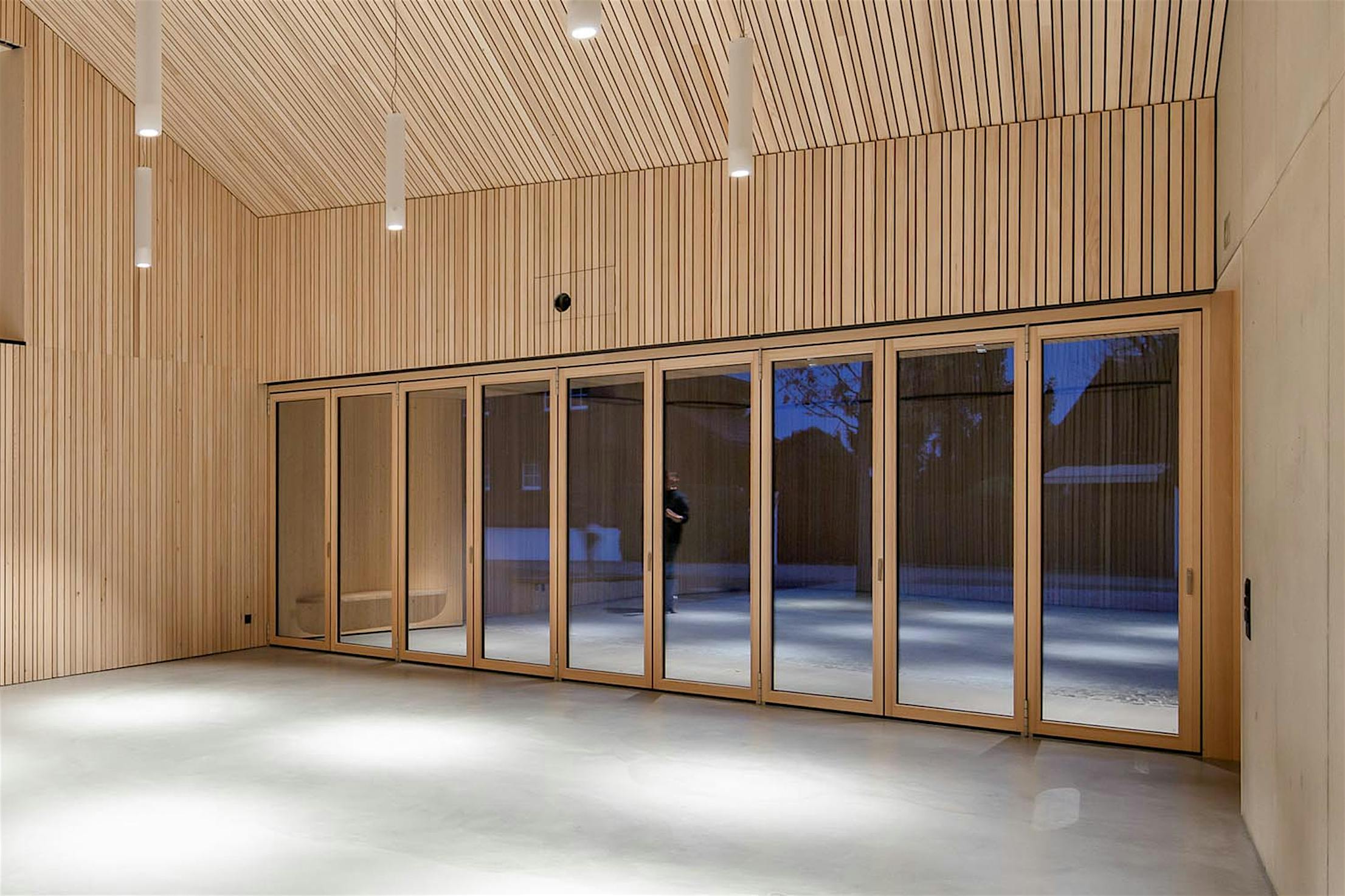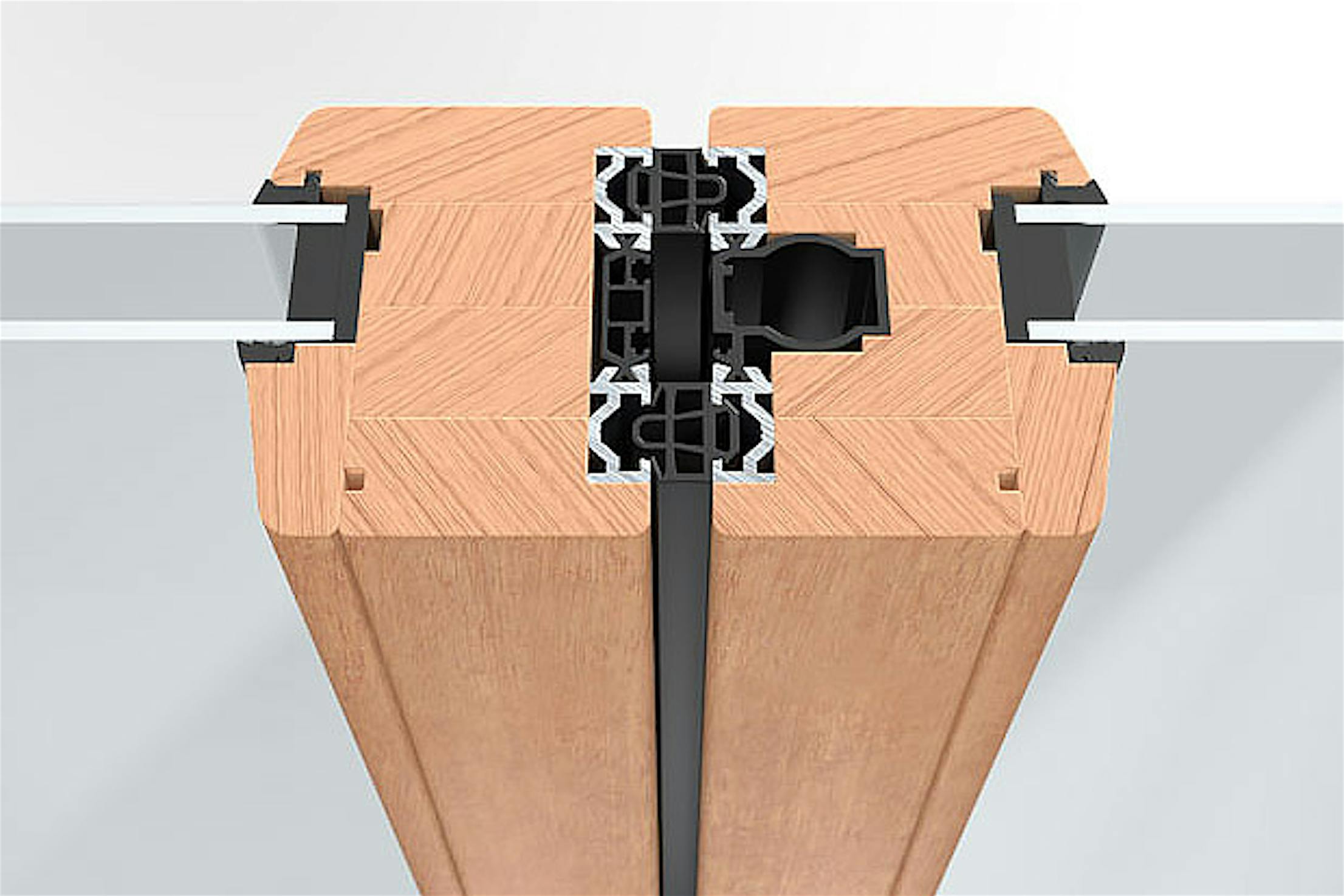 NW Wood 540 provides the slimmest wood frame in the folding door industry. With a quadruple laminated cross-grained wood frame profile styled in a subtly rounded design, the intersection of two folding panels is a mere 5 11/16" (144 mm). This floor supported system offers an extremely streamlined appearance with minimal exposed hardware, creating a new level of aesthetics.