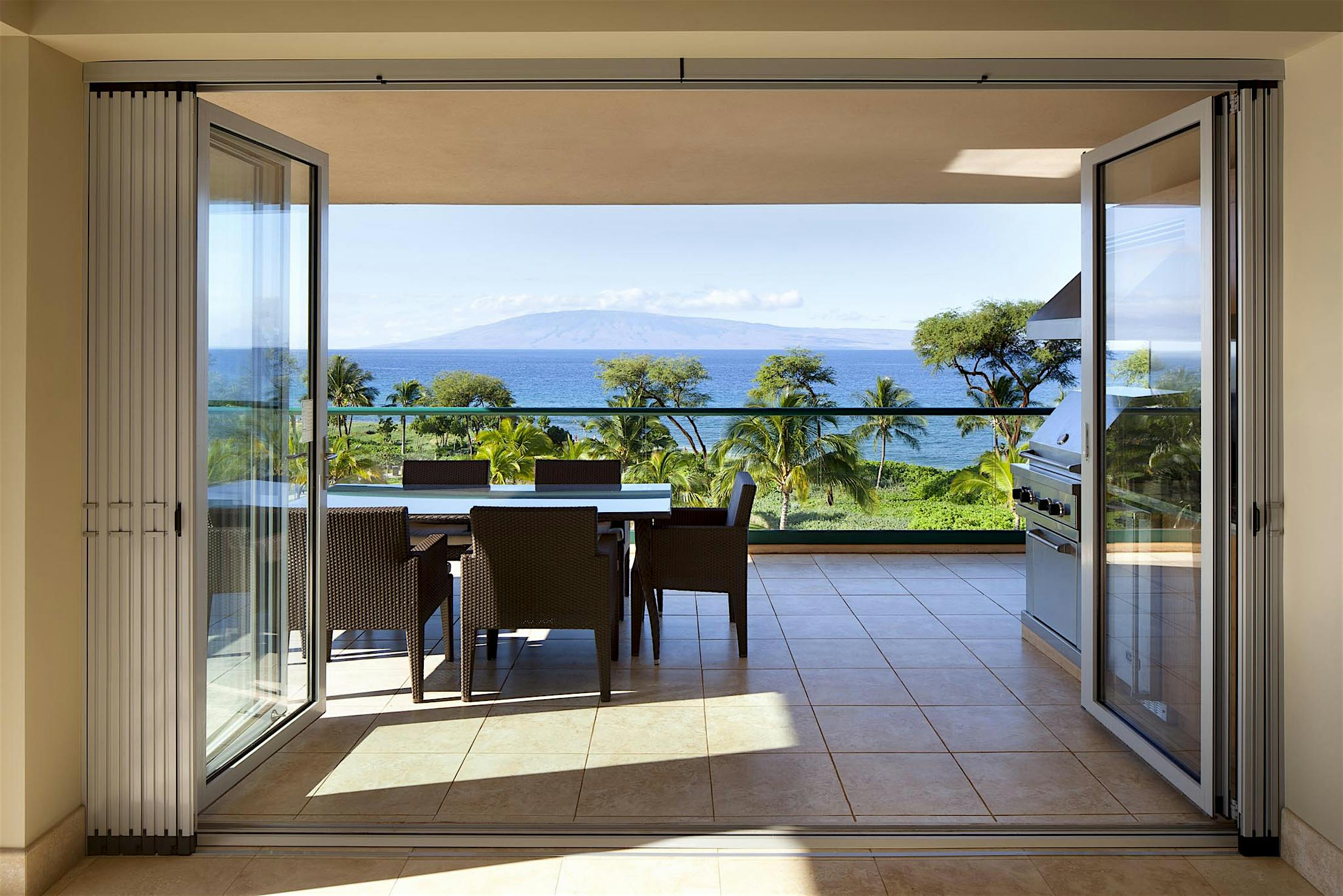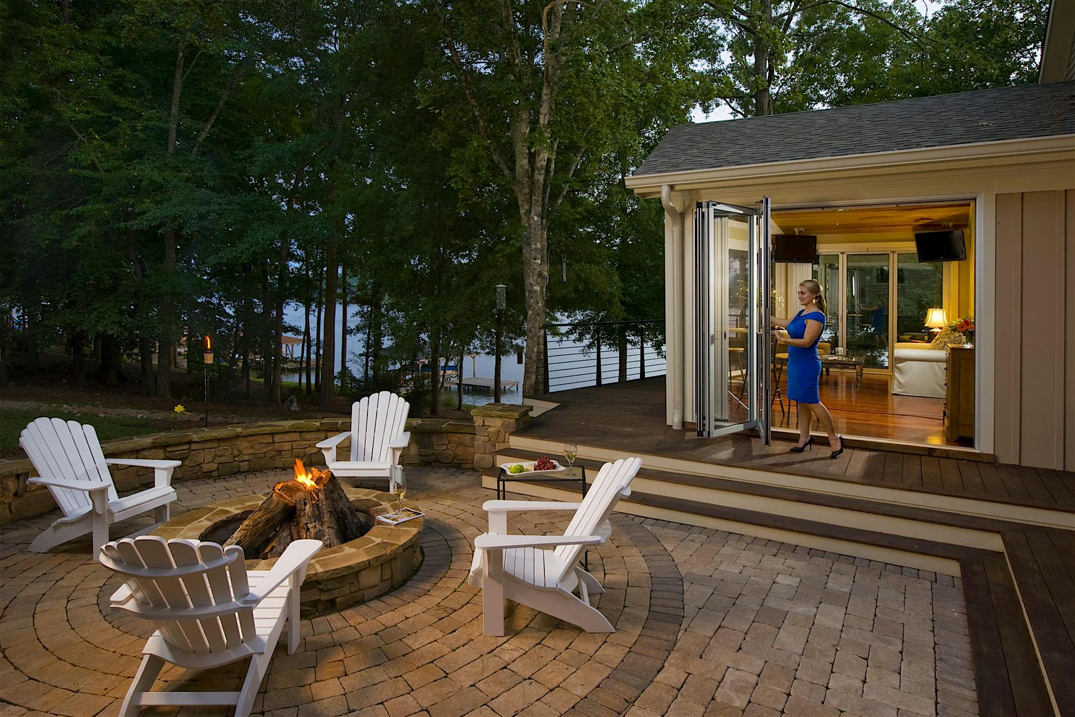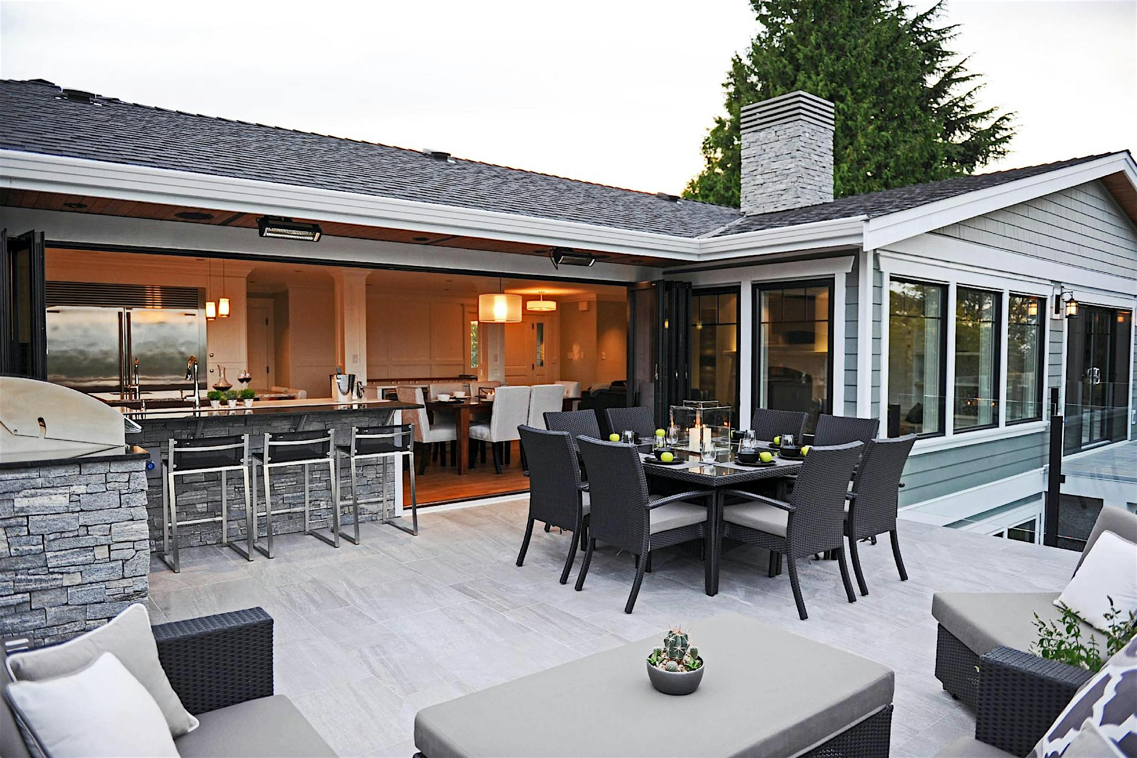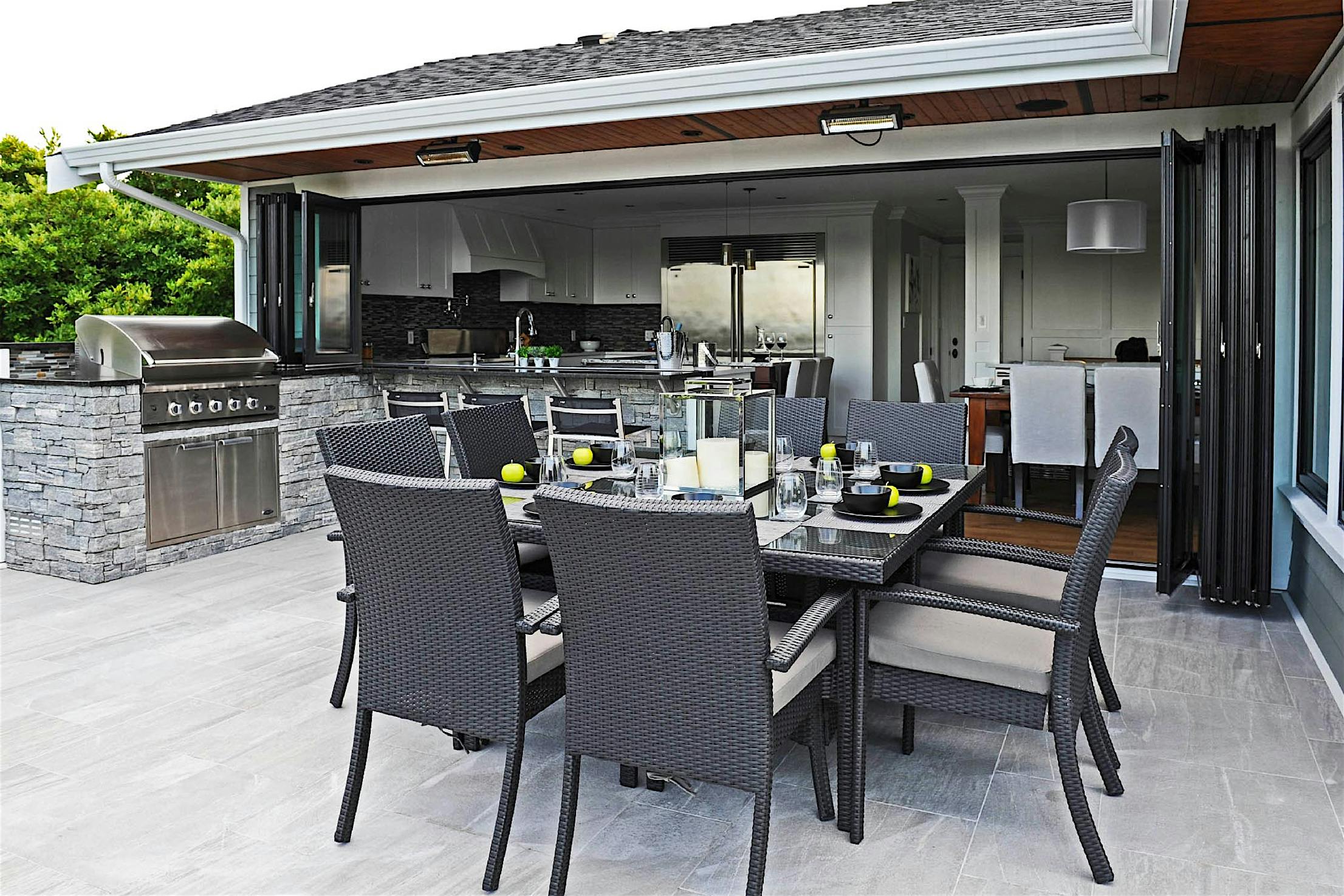 The two 15-foot-wide folding patio doors, each featuring five panels with a convenient swing door, allow entertaining to spill into the covered patio and poolside.