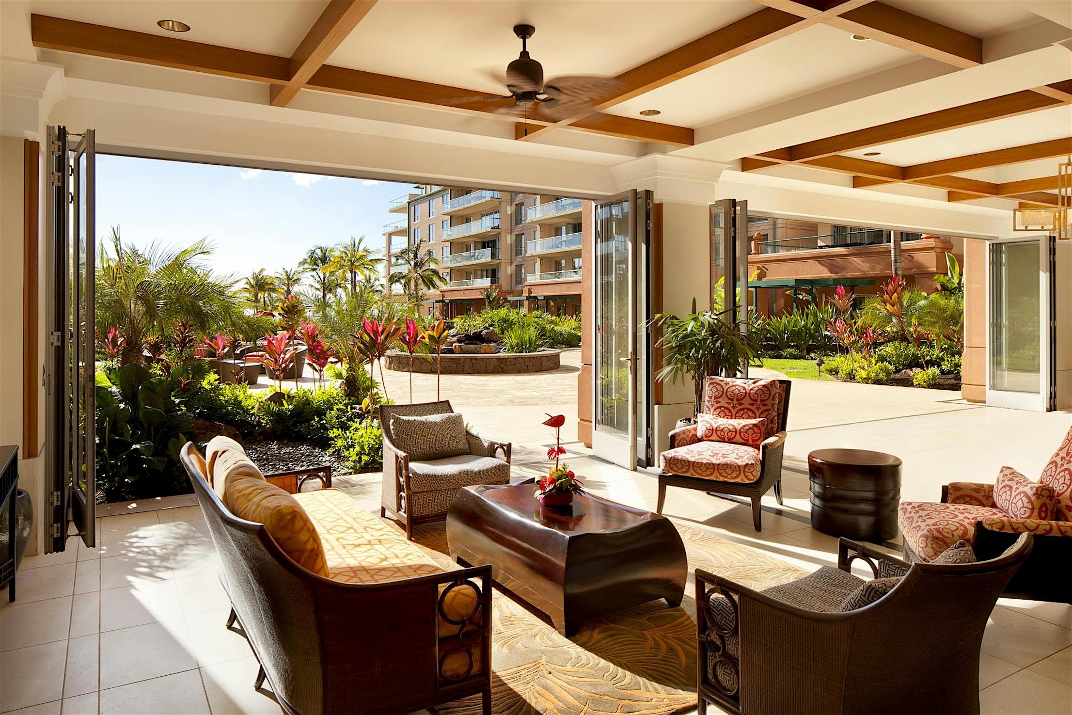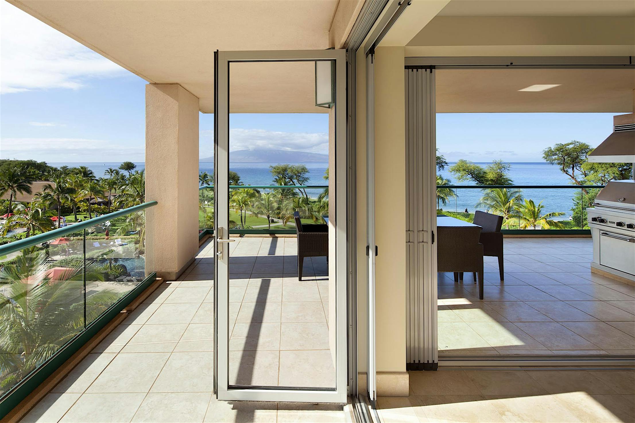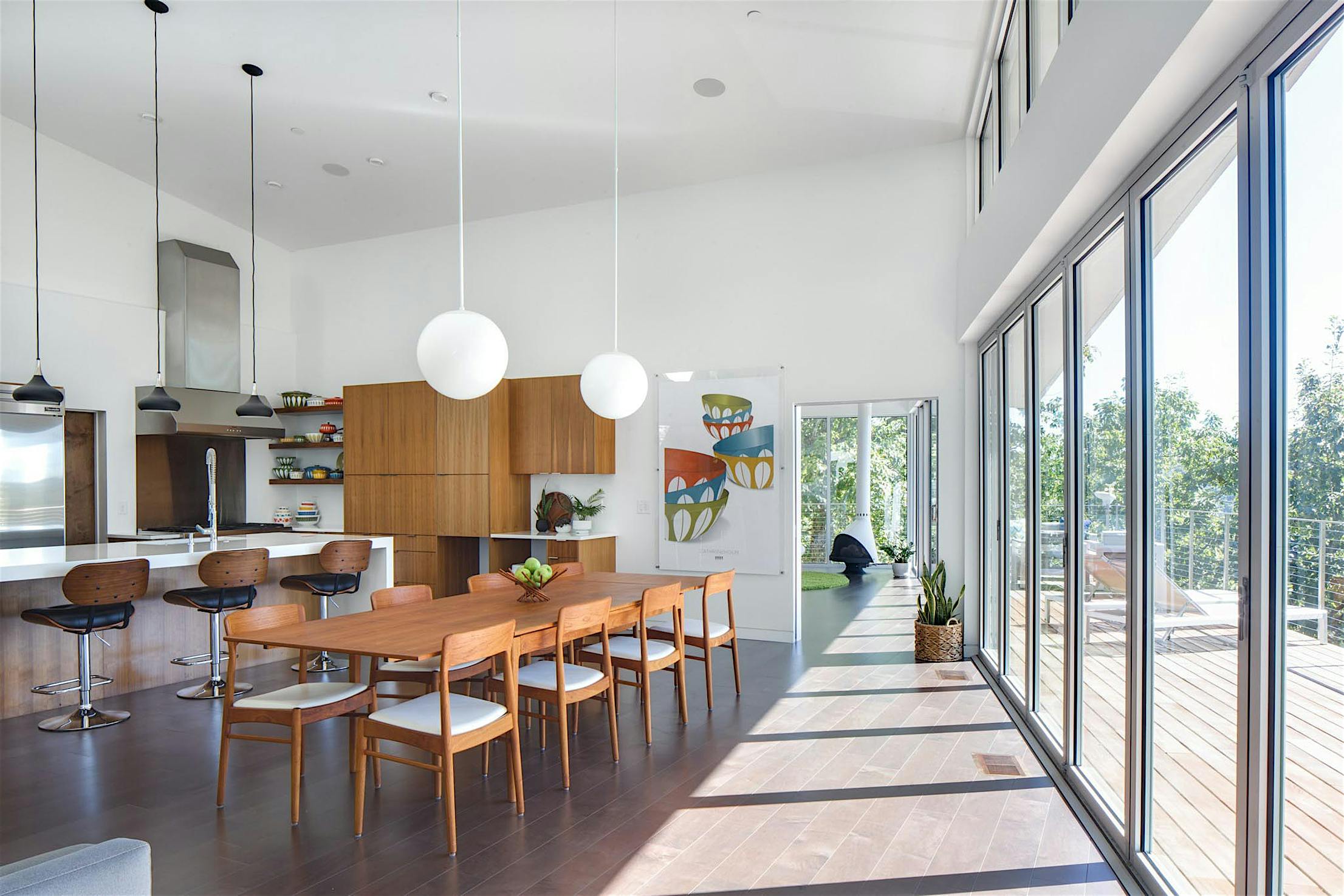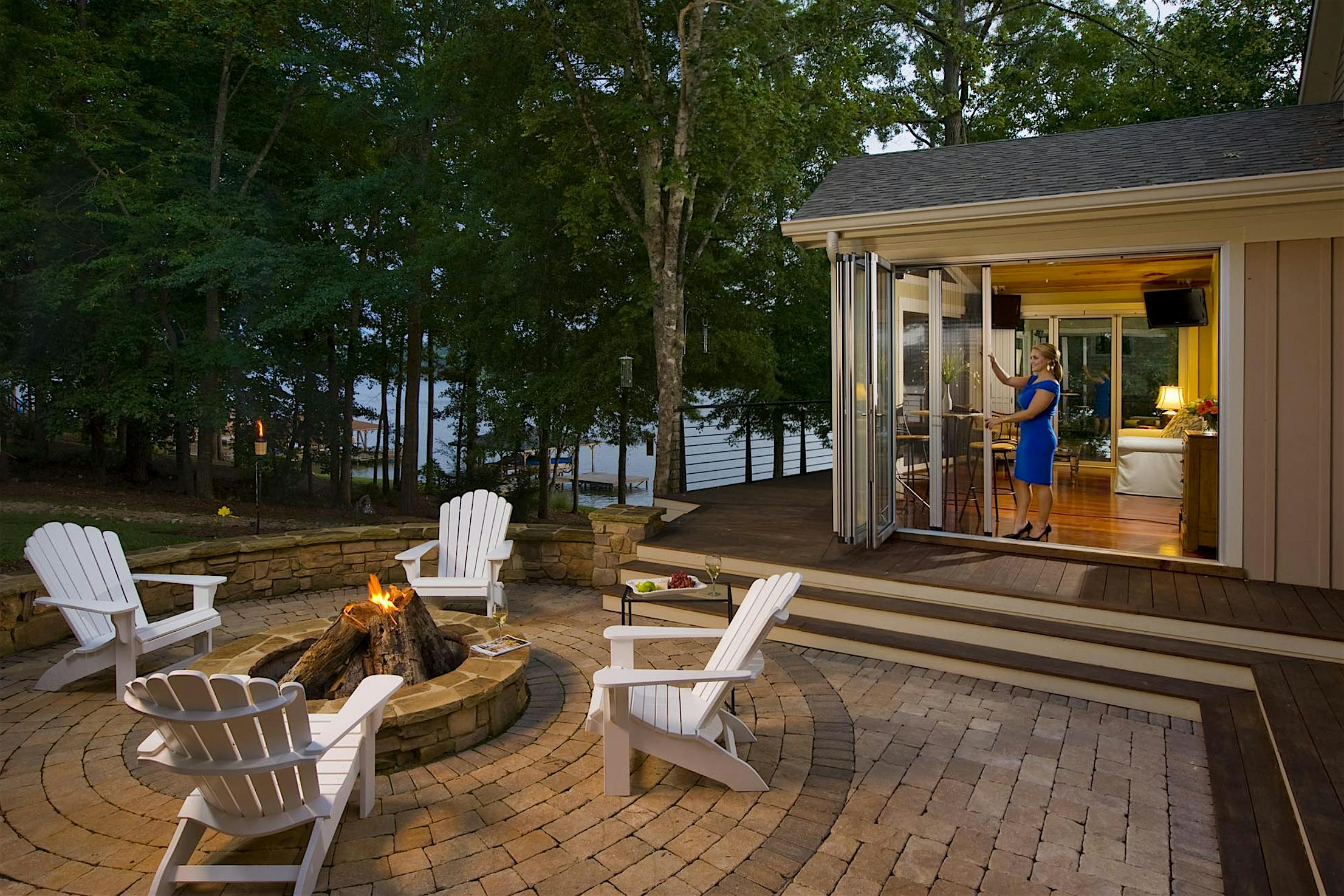 The two 15-foot-wide folding patio doors, each featuring five panels with a convenient swing door, allow entertaining to spill into the covered patio and poolside.