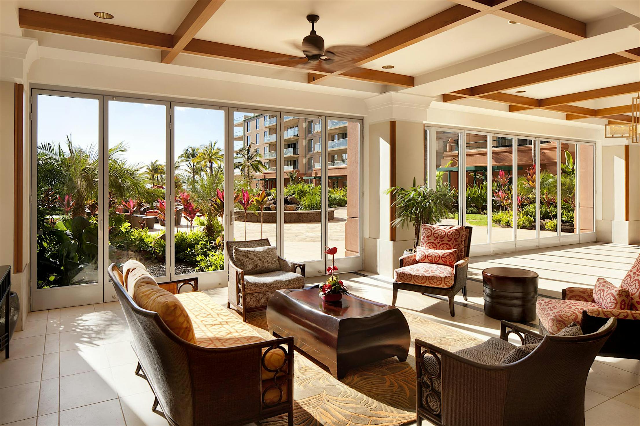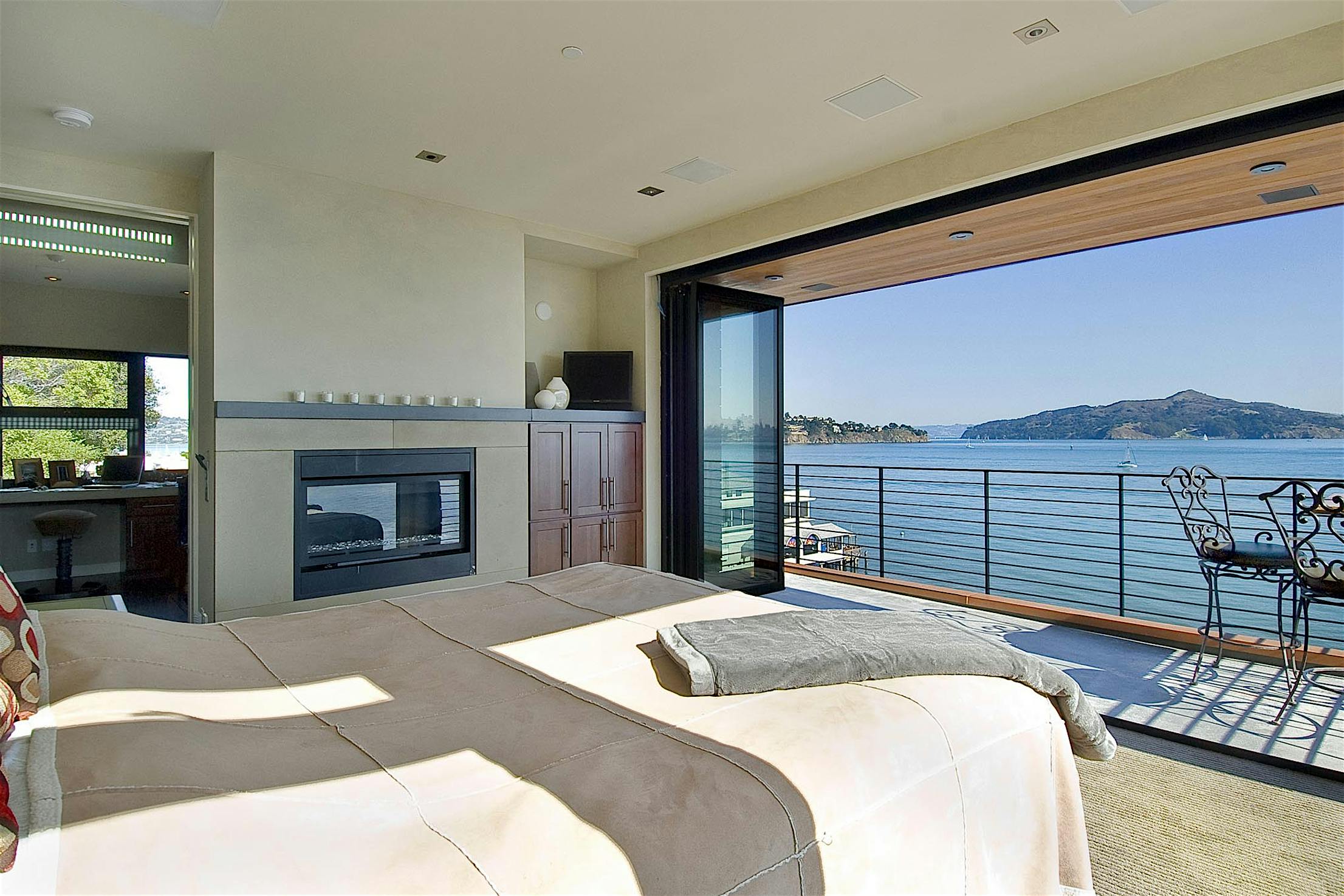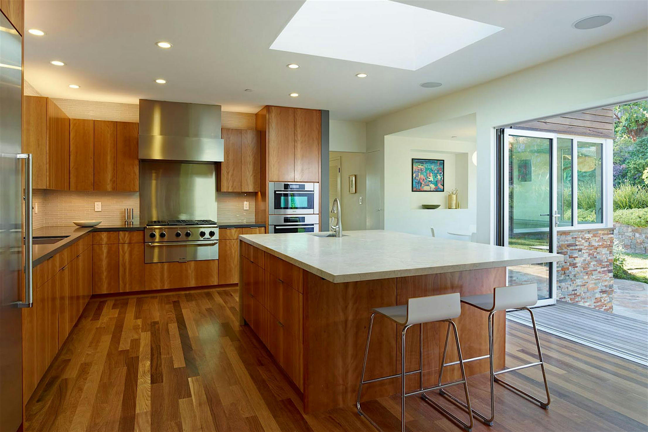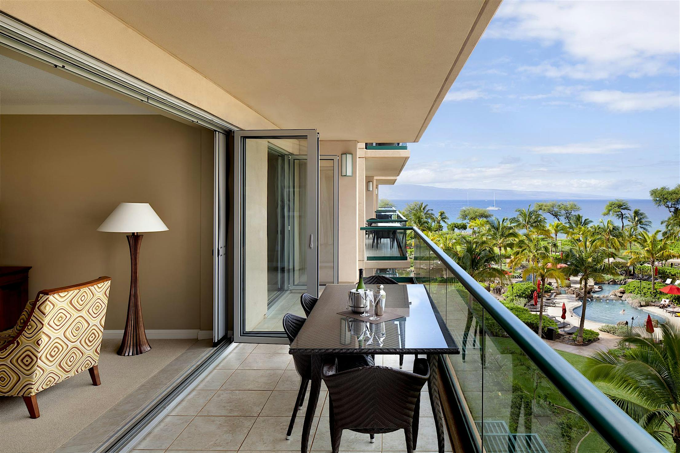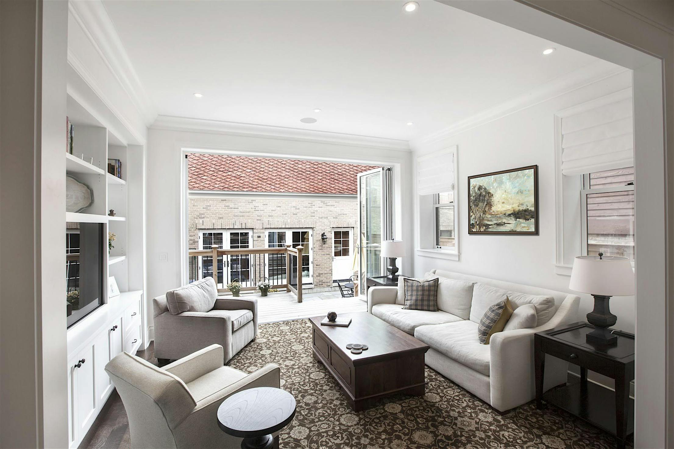 The two 15-foot-wide folding patio doors, each featuring five panels with a convenient swing door, allow entertaining to spill into the covered patio and poolside.