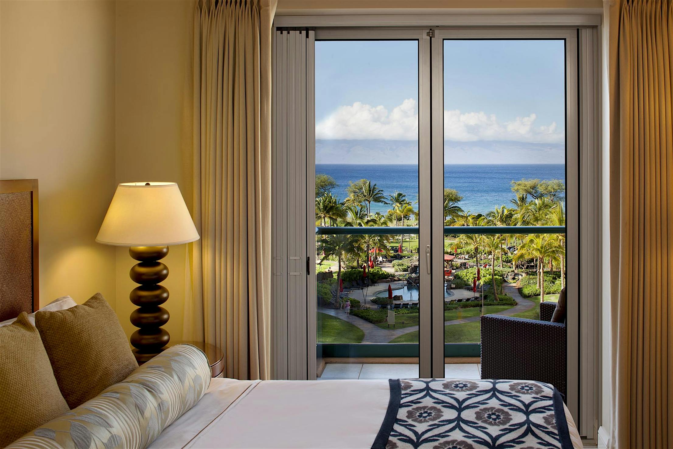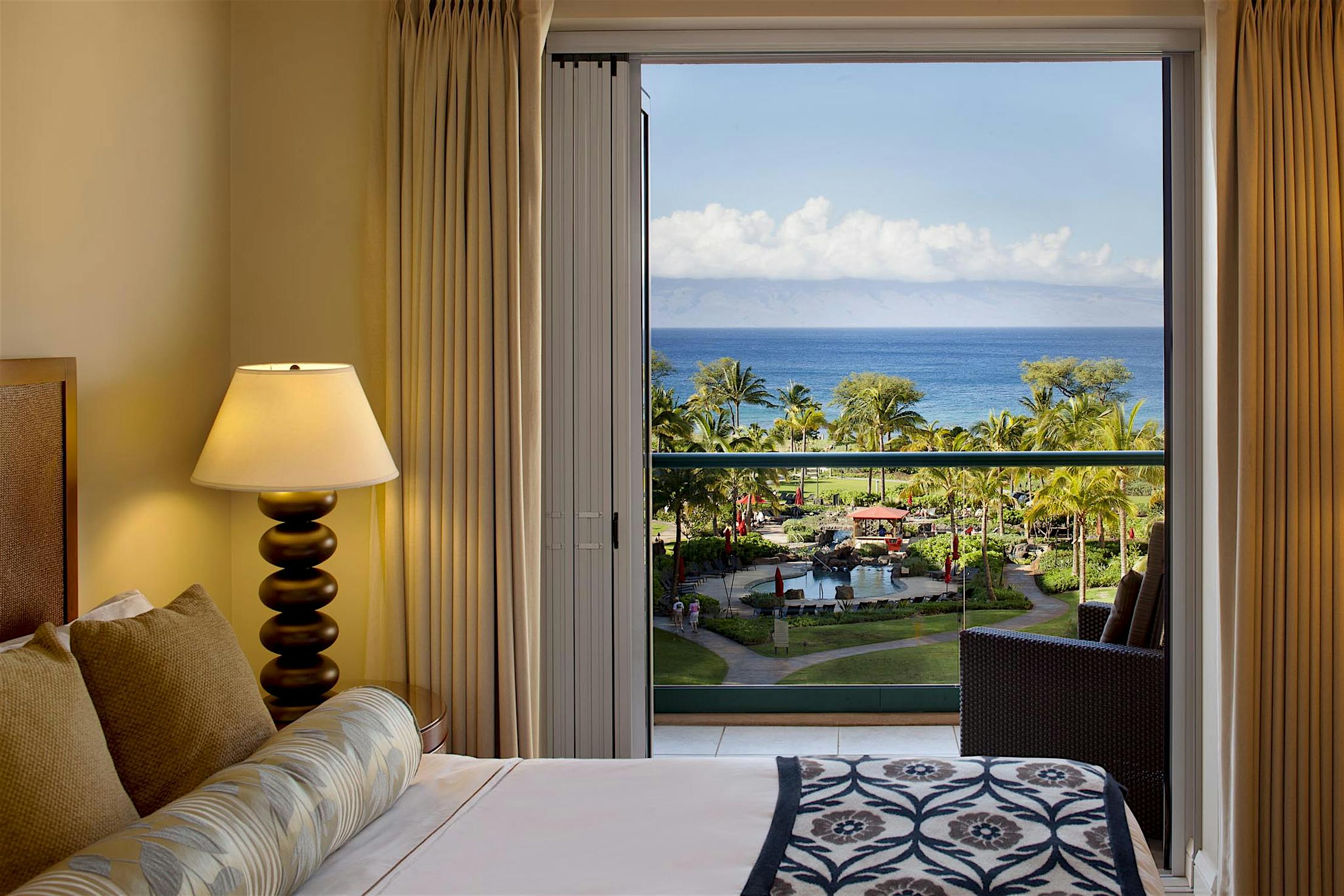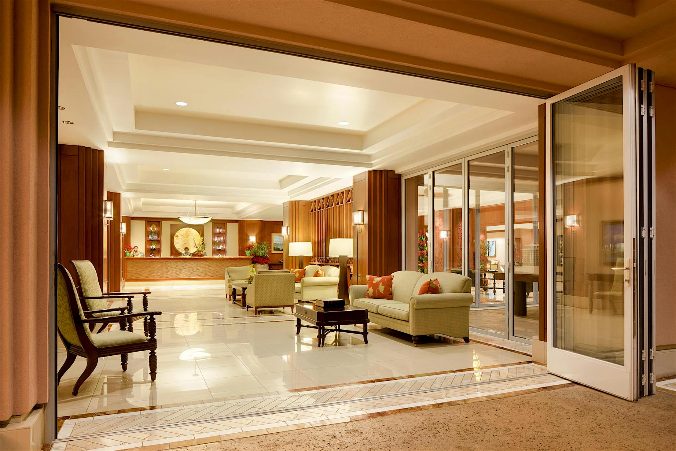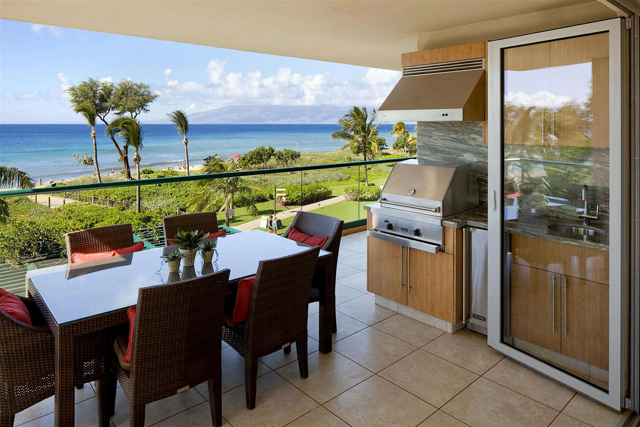 The two 15-foot-wide folding patio doors, each featuring five panels with a convenient swing door, allow entertaining to spill into the covered patio and poolside.