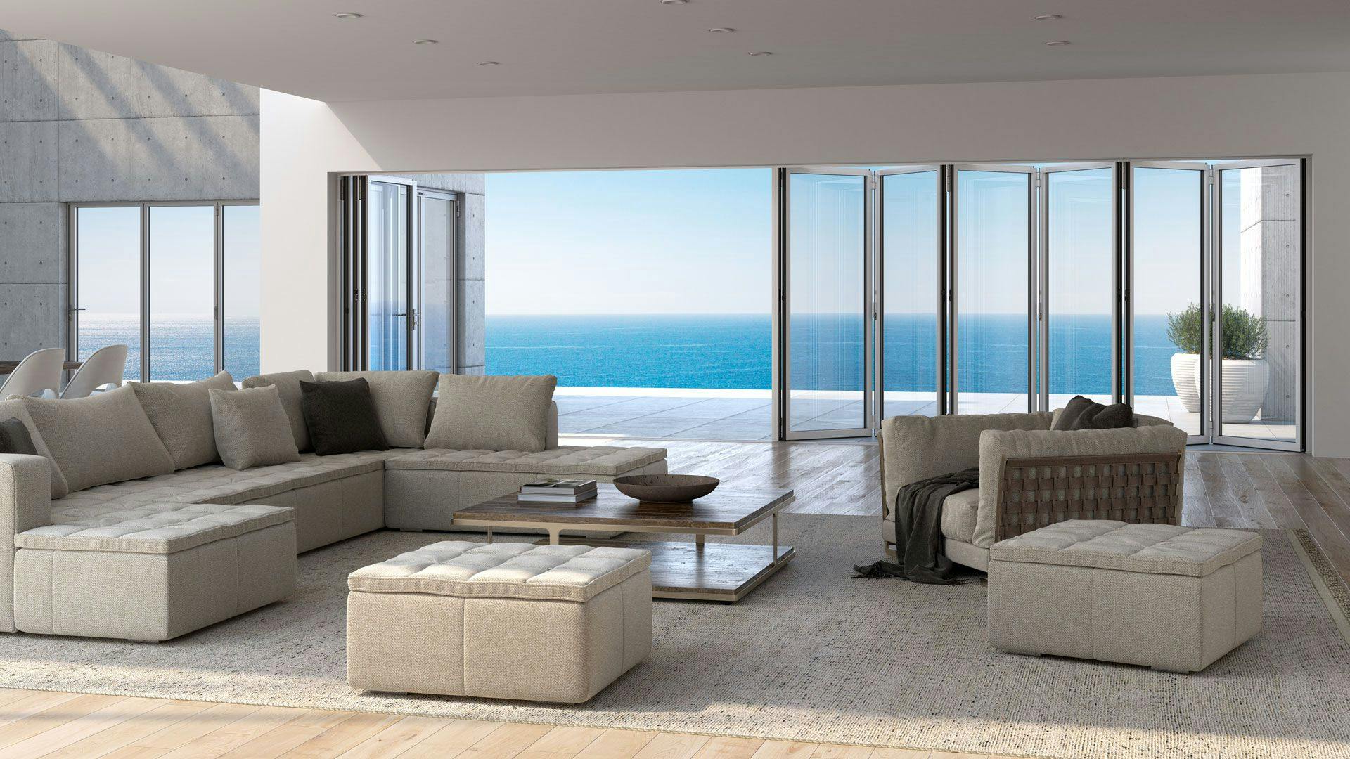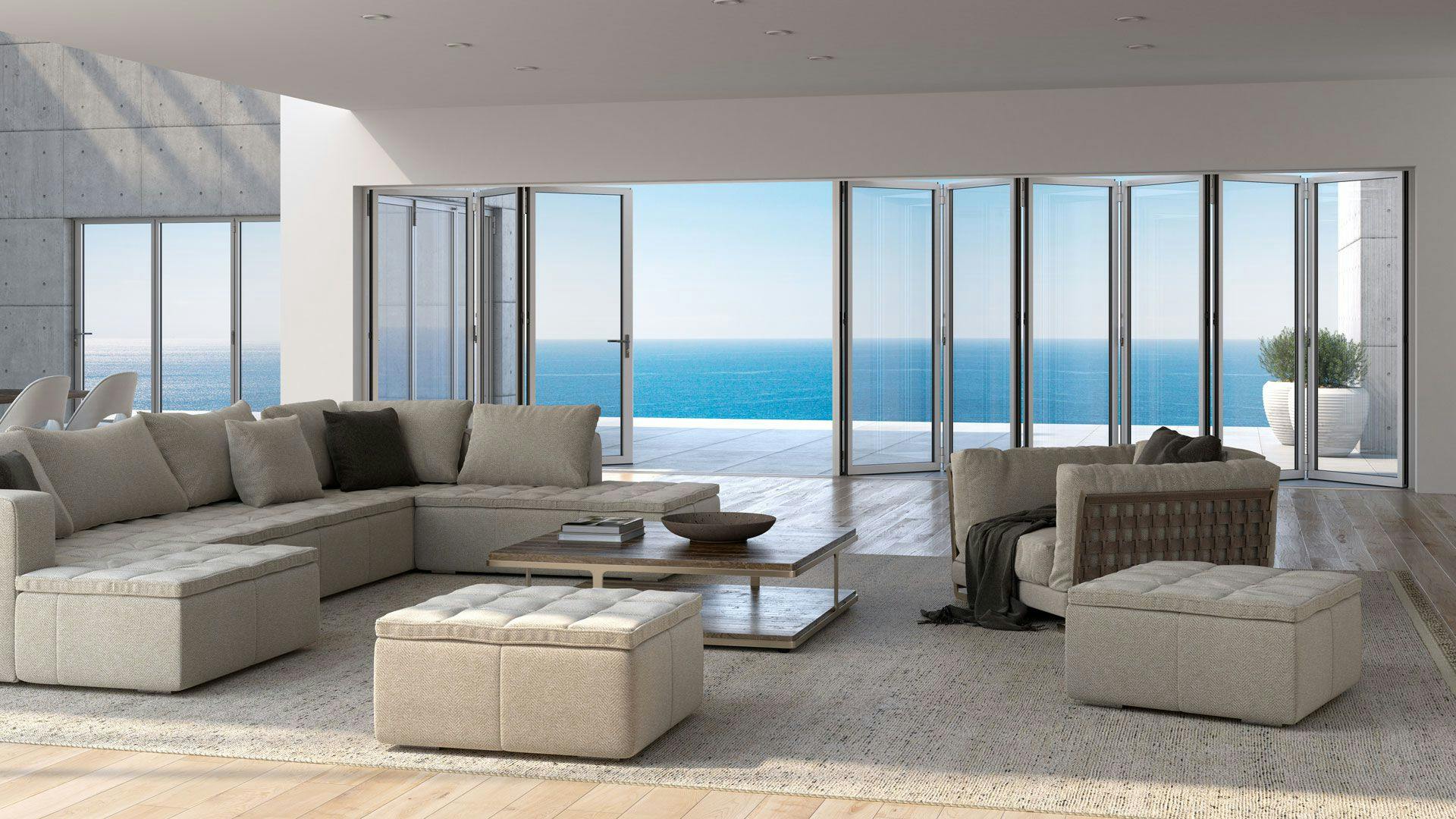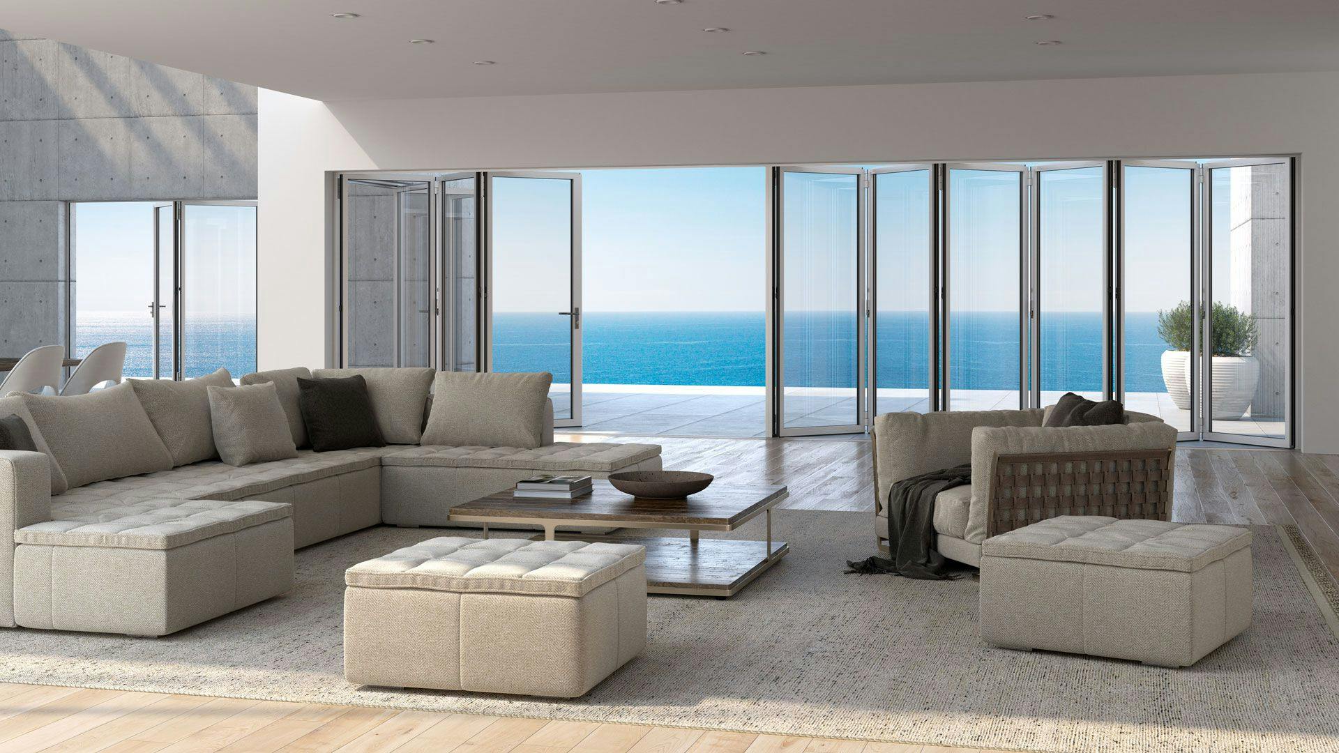 NanaWall makes folding glass doors that solve these issues in a beautiful, eye-catching product. Our systems are prized for their elegant simplicity in look and operation - but from an engineering perspective, they solve multiple complex problems few other products can. They can resist hurricanes, offer field-tested security, and can stack and fold flat with ease for unmatched views