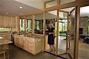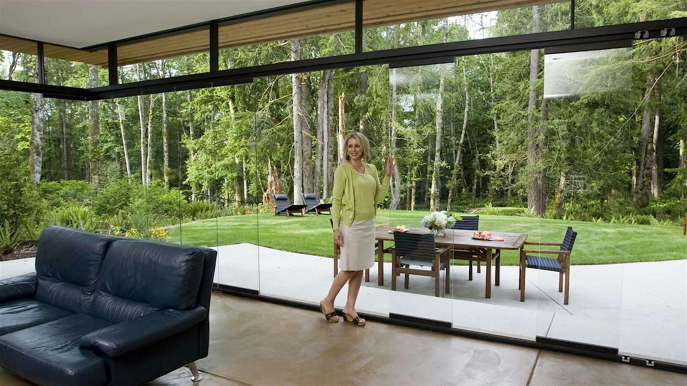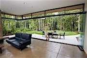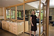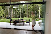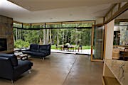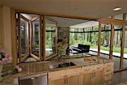The architect wrapped an ample indoor/outdoor patio with a fully opening NanaWall frameless SL25 system. At one end of the patio, a wood-framed folding WD65 window/door combination opens to the kitchen. With seasonable year-round temperatures – and radiant heat underfloor – the family often keeps all the walls open with practically half of their house open to nature.