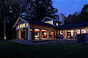 The result is a retreat on the lake that minimizes the separation between indoors and outdoors, but doesn't neglect the considerations of rough Great Lakes weather, as well as environmental needs and occupant comfort. The NanaWall system specified for the protruding screened-in porch is well-suited to the task.