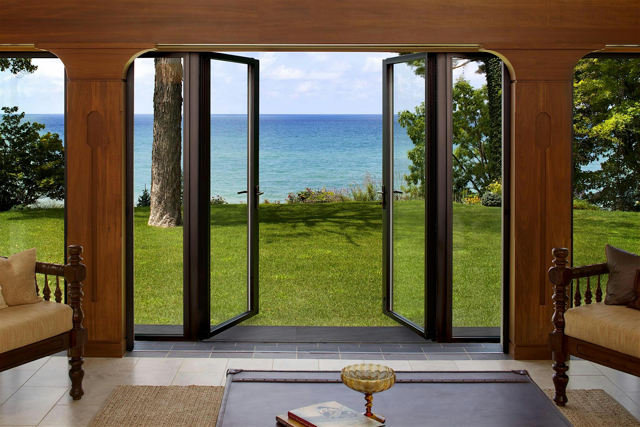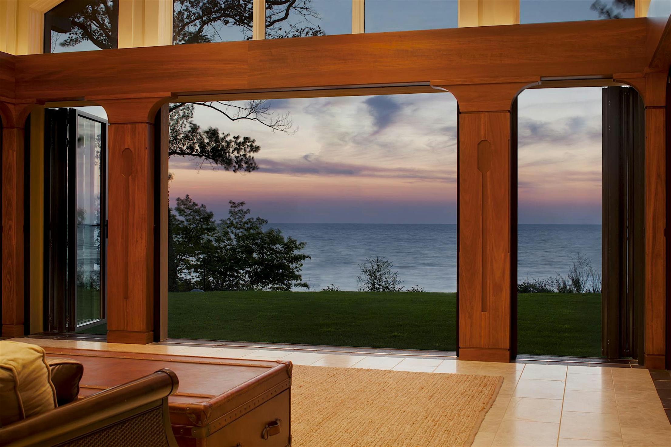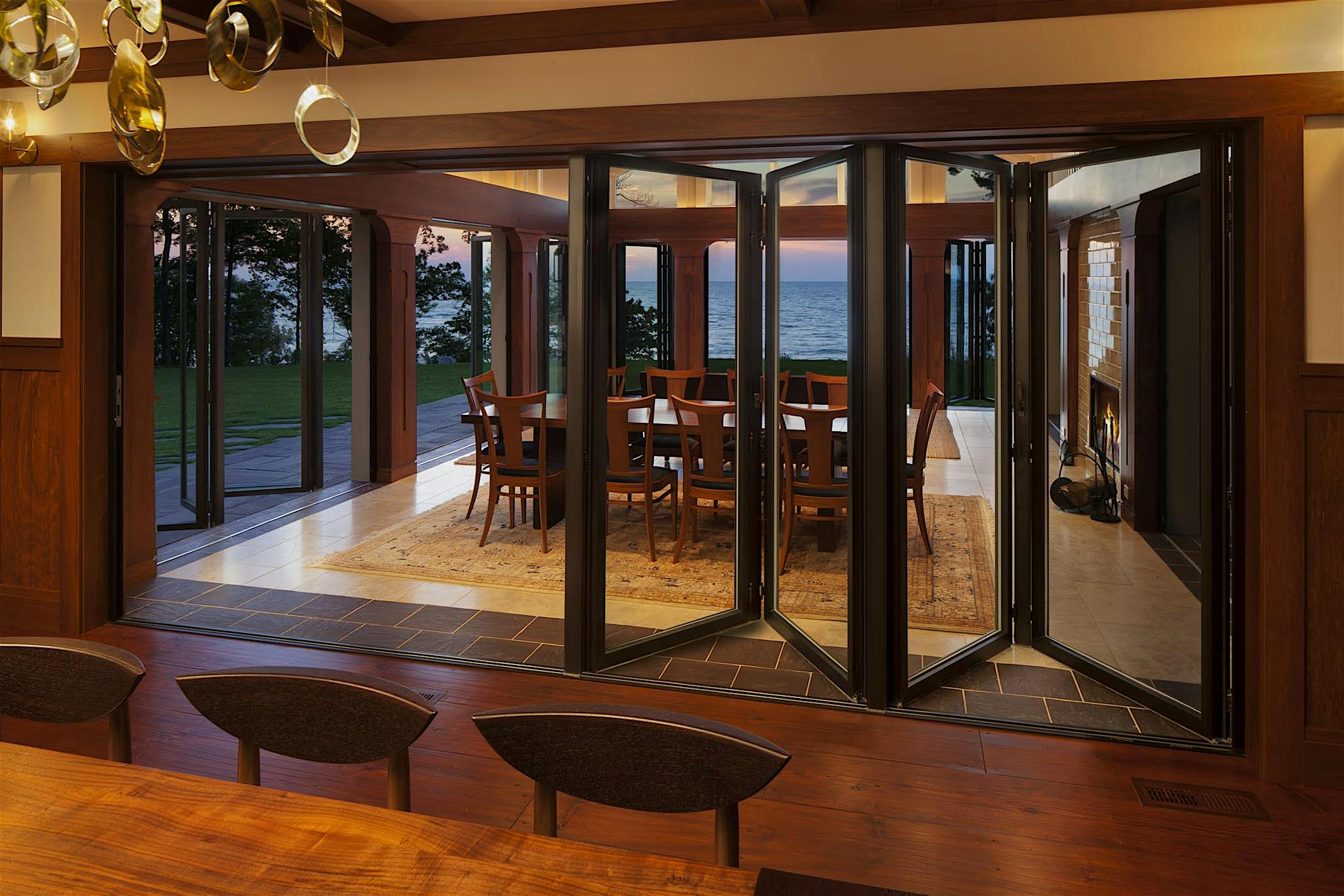 “After much research,” says Ogden, "we found NanaWall to be our only choice. The design for the room required that occupants could appreciate the shoreline panorama and, weather permitting, open the walls to enjoy the sounds and breezes. The walls also had to withstand the high winds and driving rain, sleet and snow common to a northern lake front setting.”