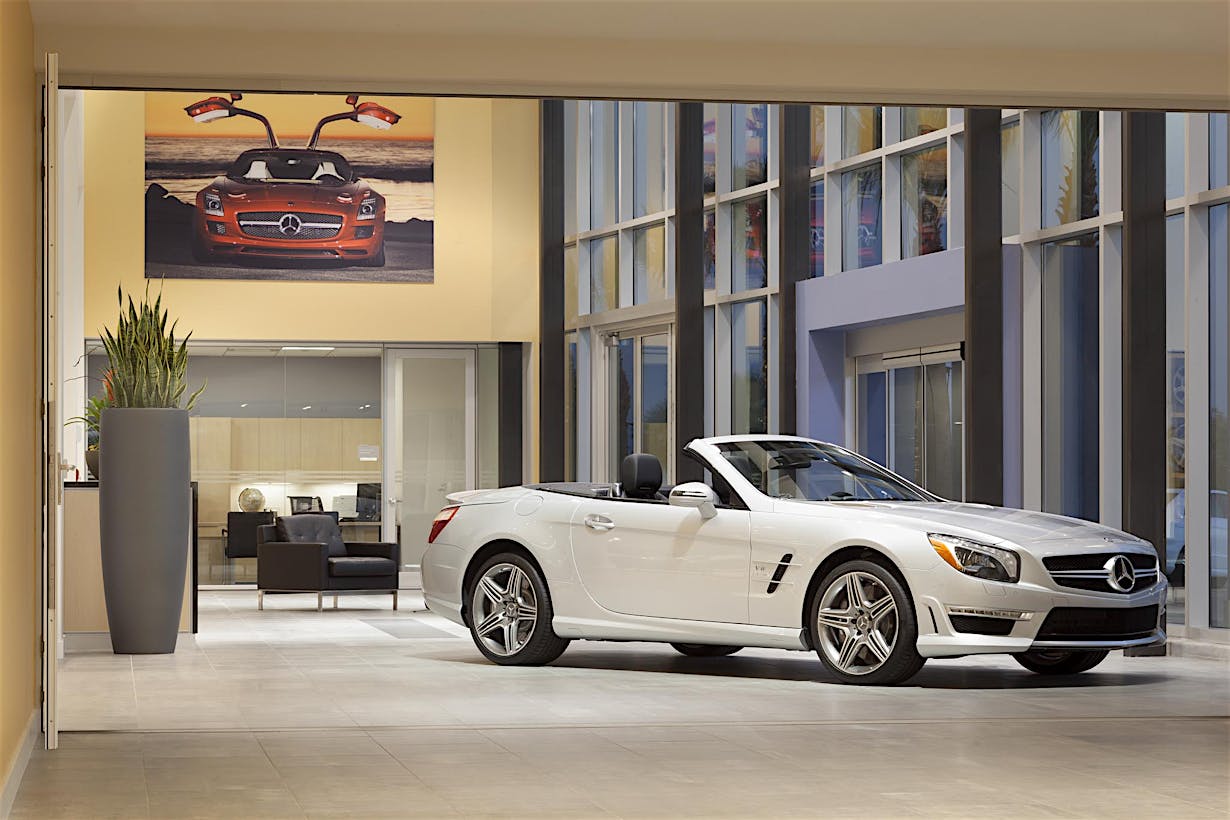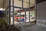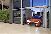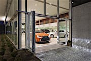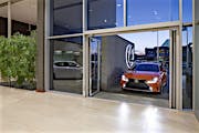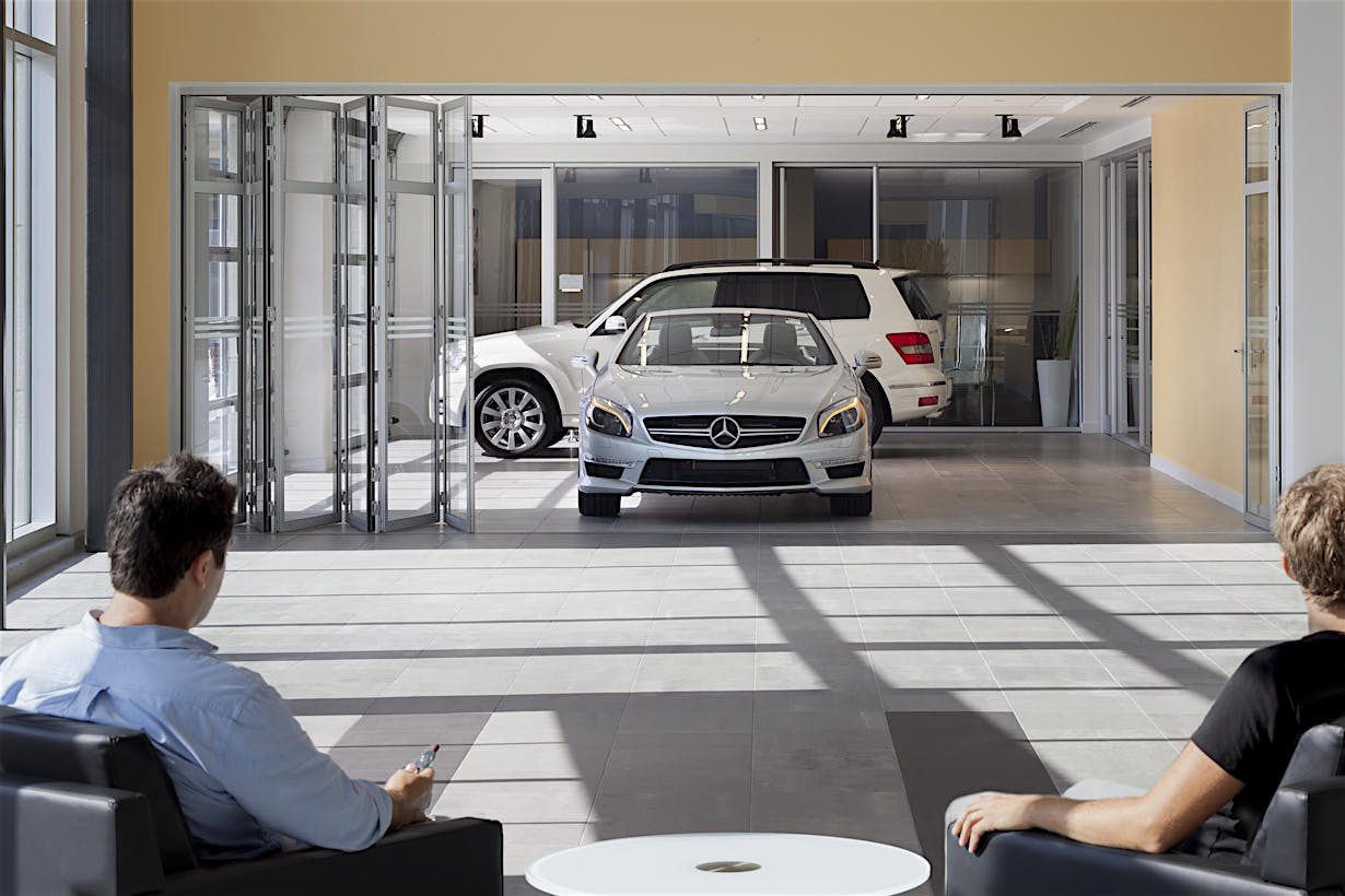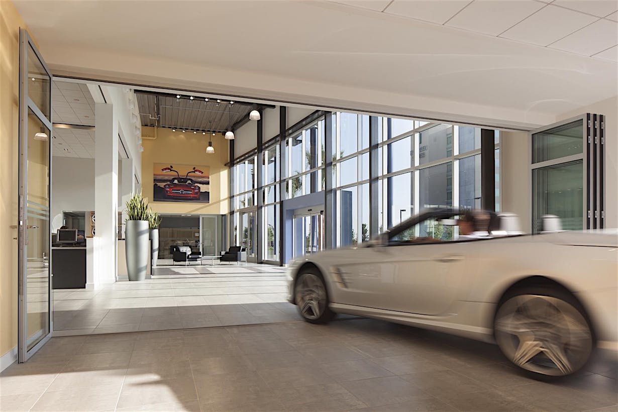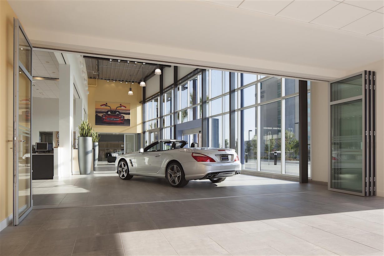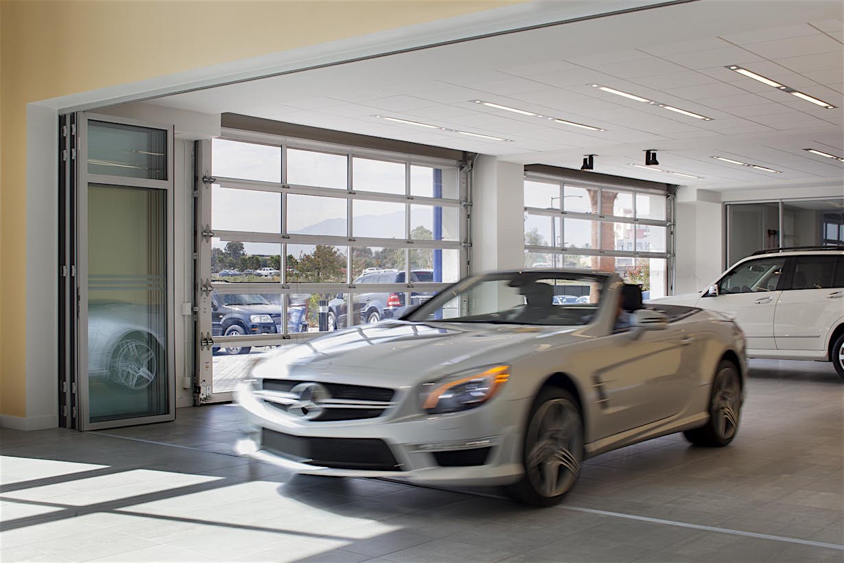 When designing a new auto showroom in Ontario CA, inventory access presented a unique challenge. As the architect discovered, there are few products which can provide a 9- to 12-foot clear width and still match the interior storefront design.