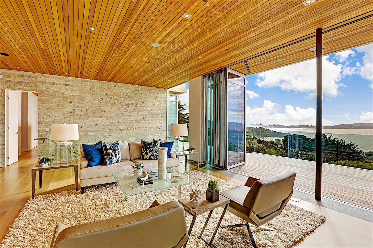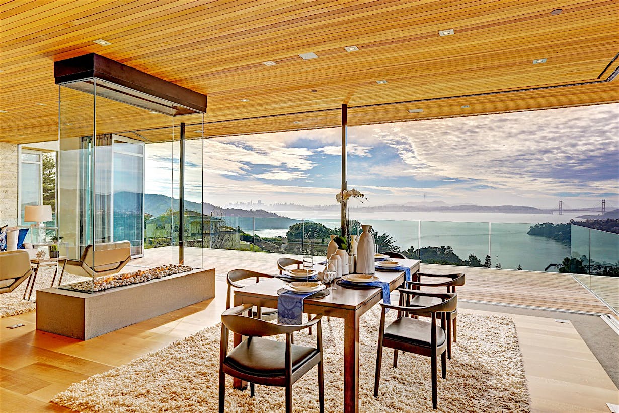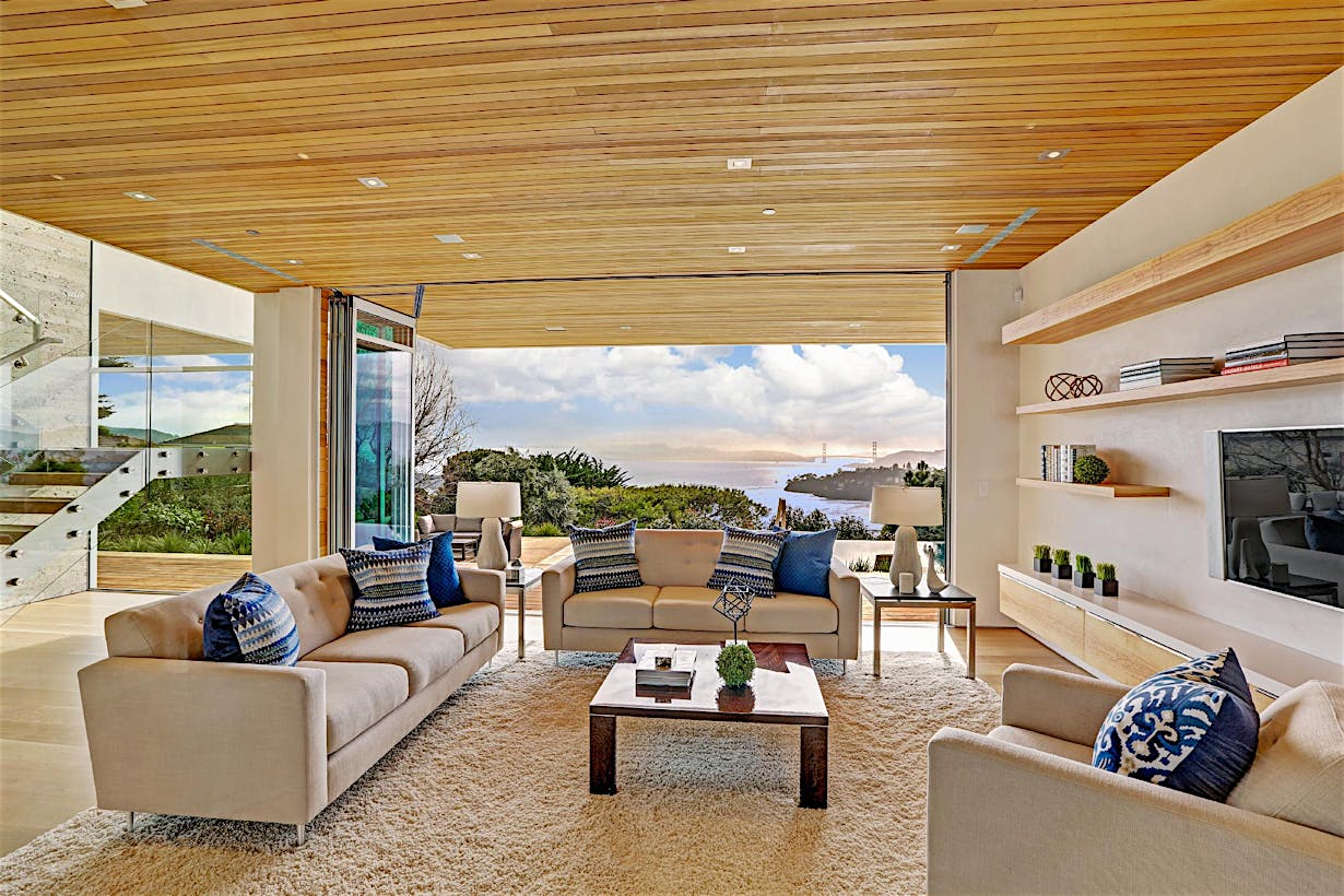 Large panel sliding glass walls offer an uninterrupted view of coastal mountains, lush greenery, and the ocean.