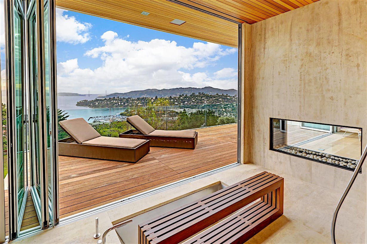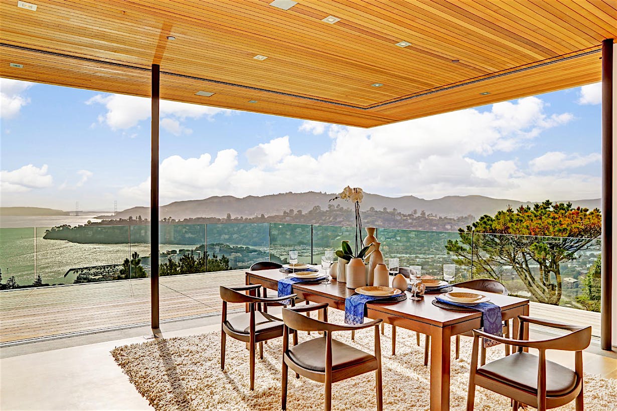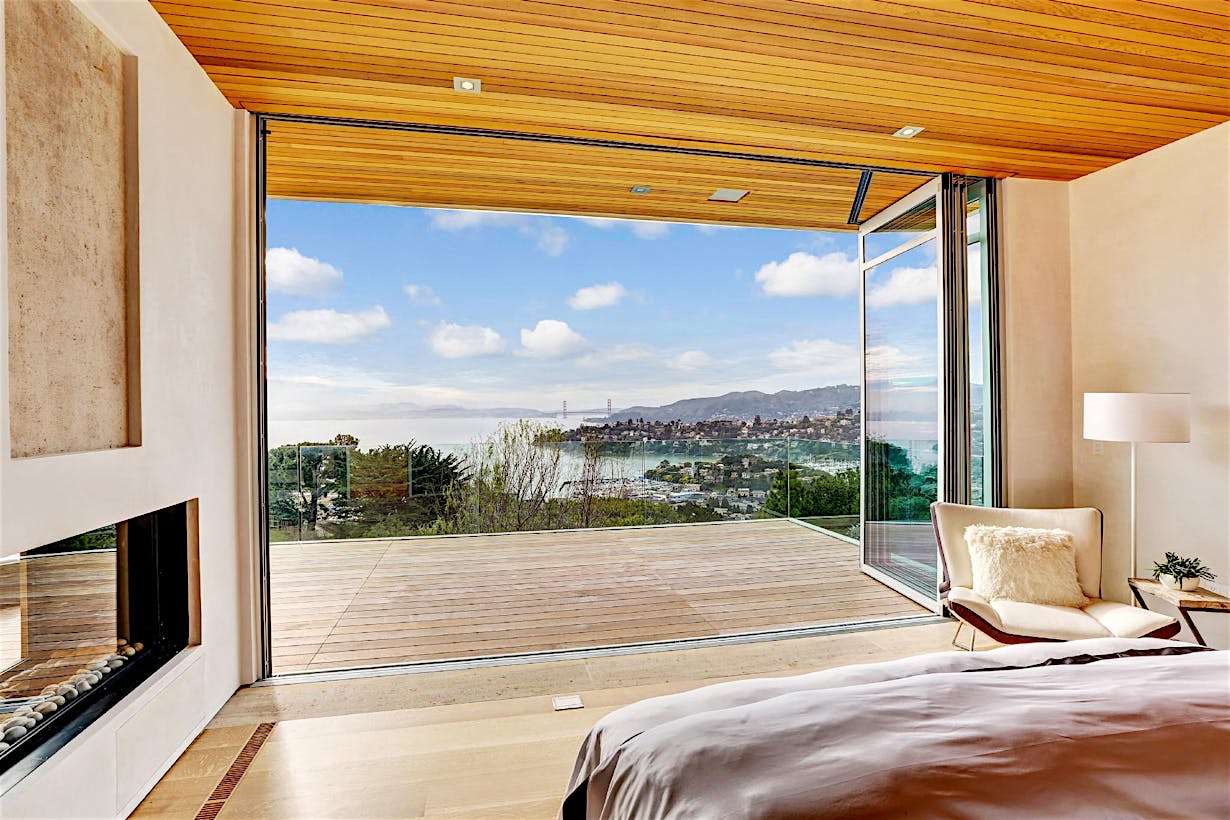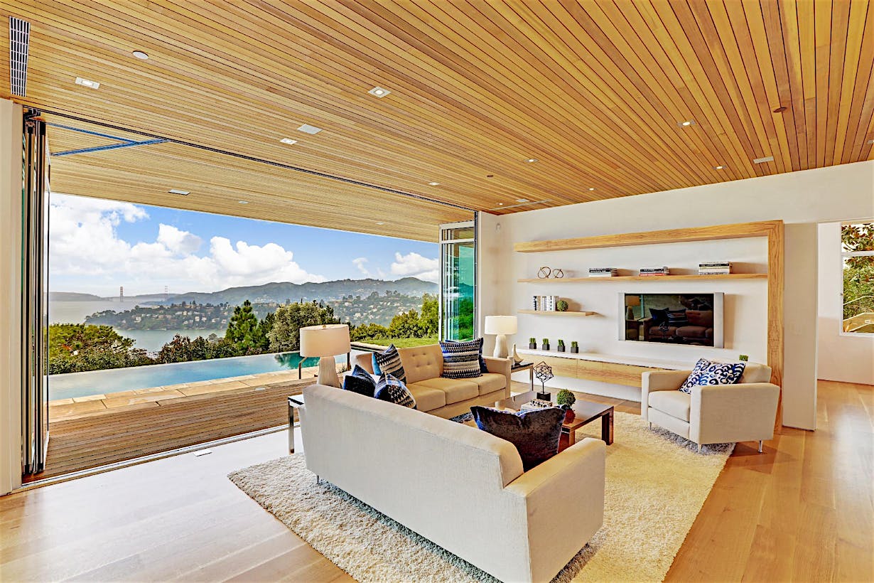 Large panel sliding glass walls offer an uninterrupted view of coastal mountains, lush greenery, and the ocean.