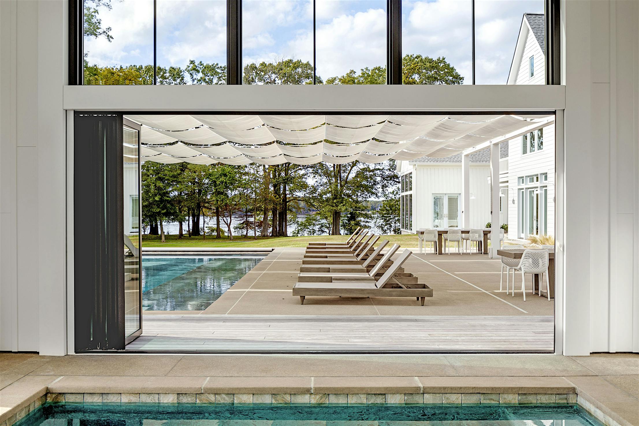 Narrow profiles maintain equal sightlines around each door panel. Water-rated Low Profile Saddle Sill provides a smooth, barefoot-safe transition between indoor and outdoor spaces. Configuration options include a daily access door without needing to open the entire system.