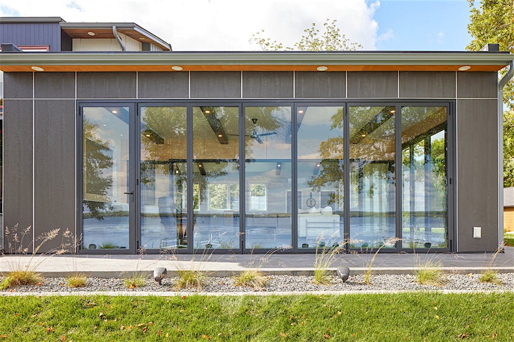 Each panel of the glass wall system is connected together along a single track and folds unto itself to create wide, unobstructed openings.