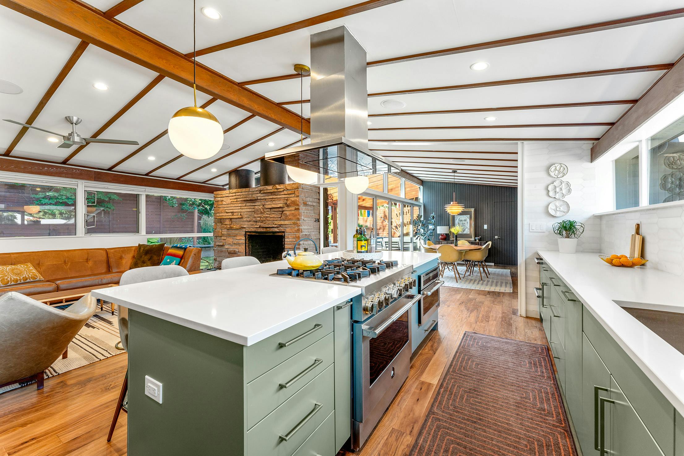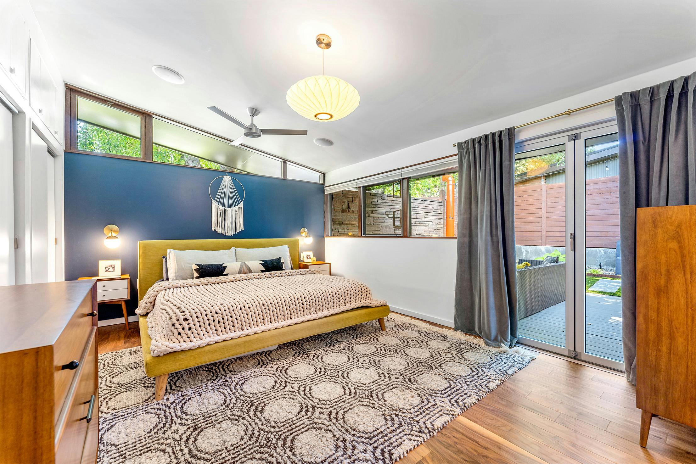 Whether in the bedrooms, living room or kitchen, the residents of this renovated home are now connected to the outdoors, Pacific breezes or the expansive pool.
