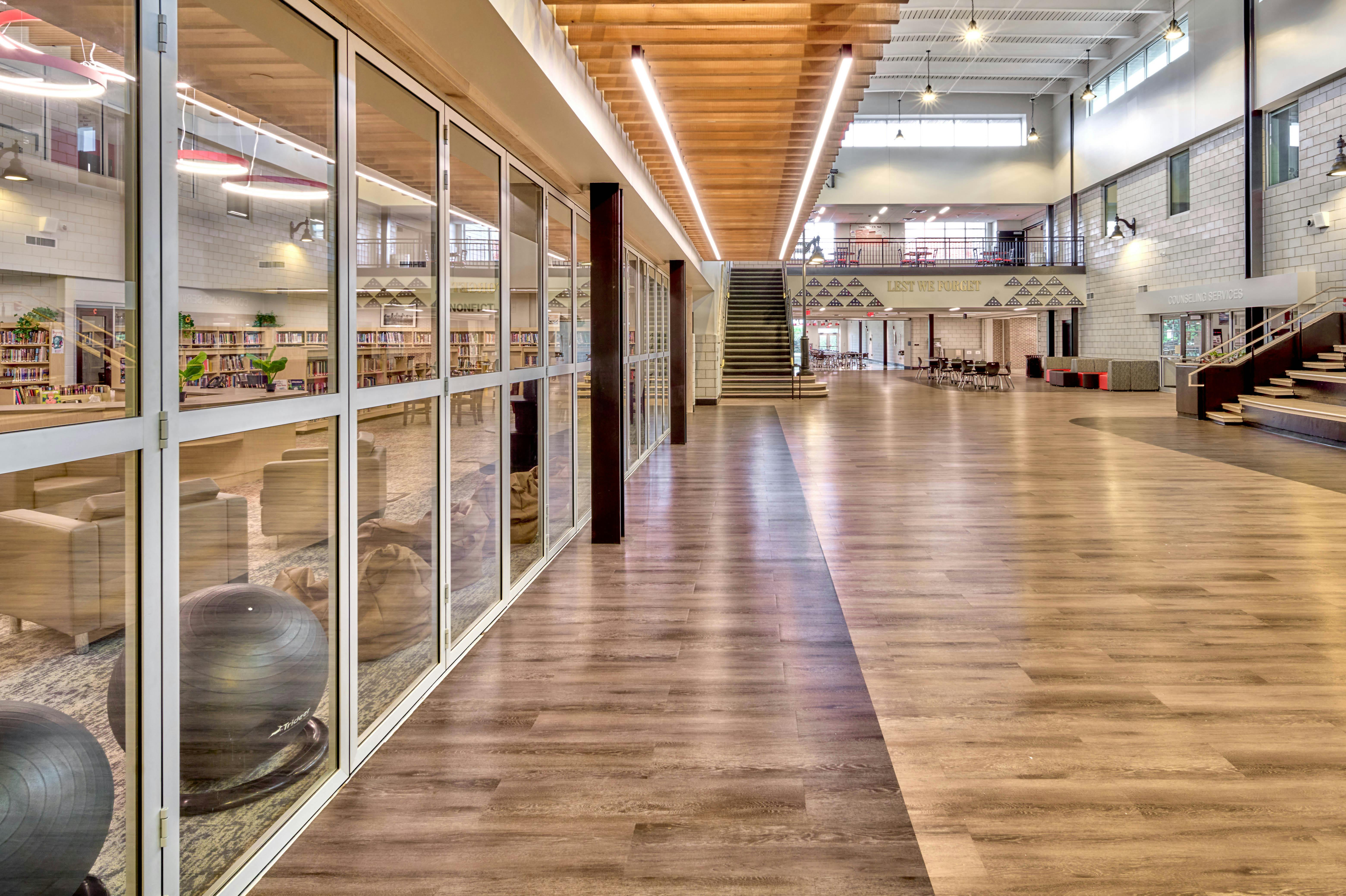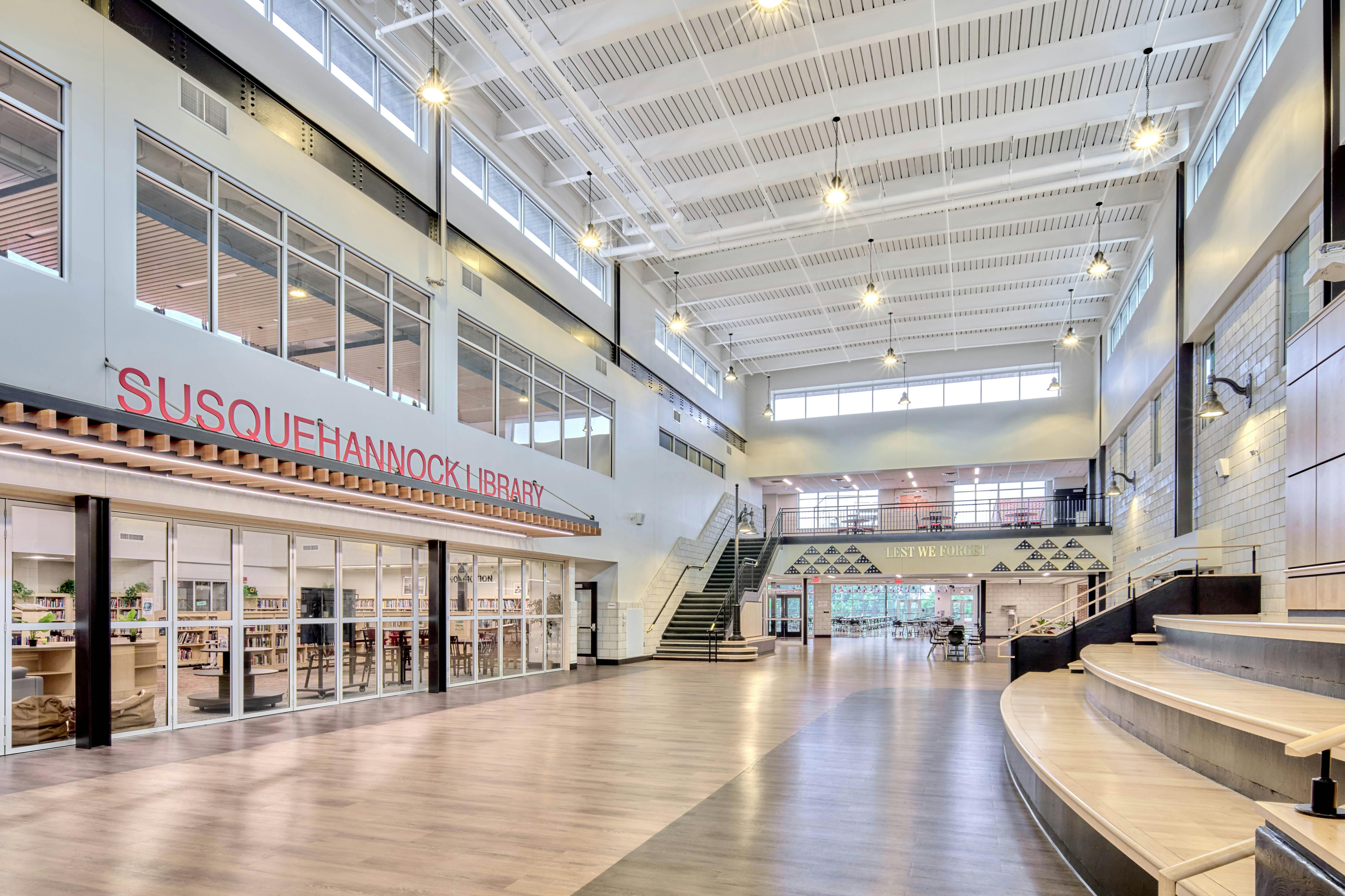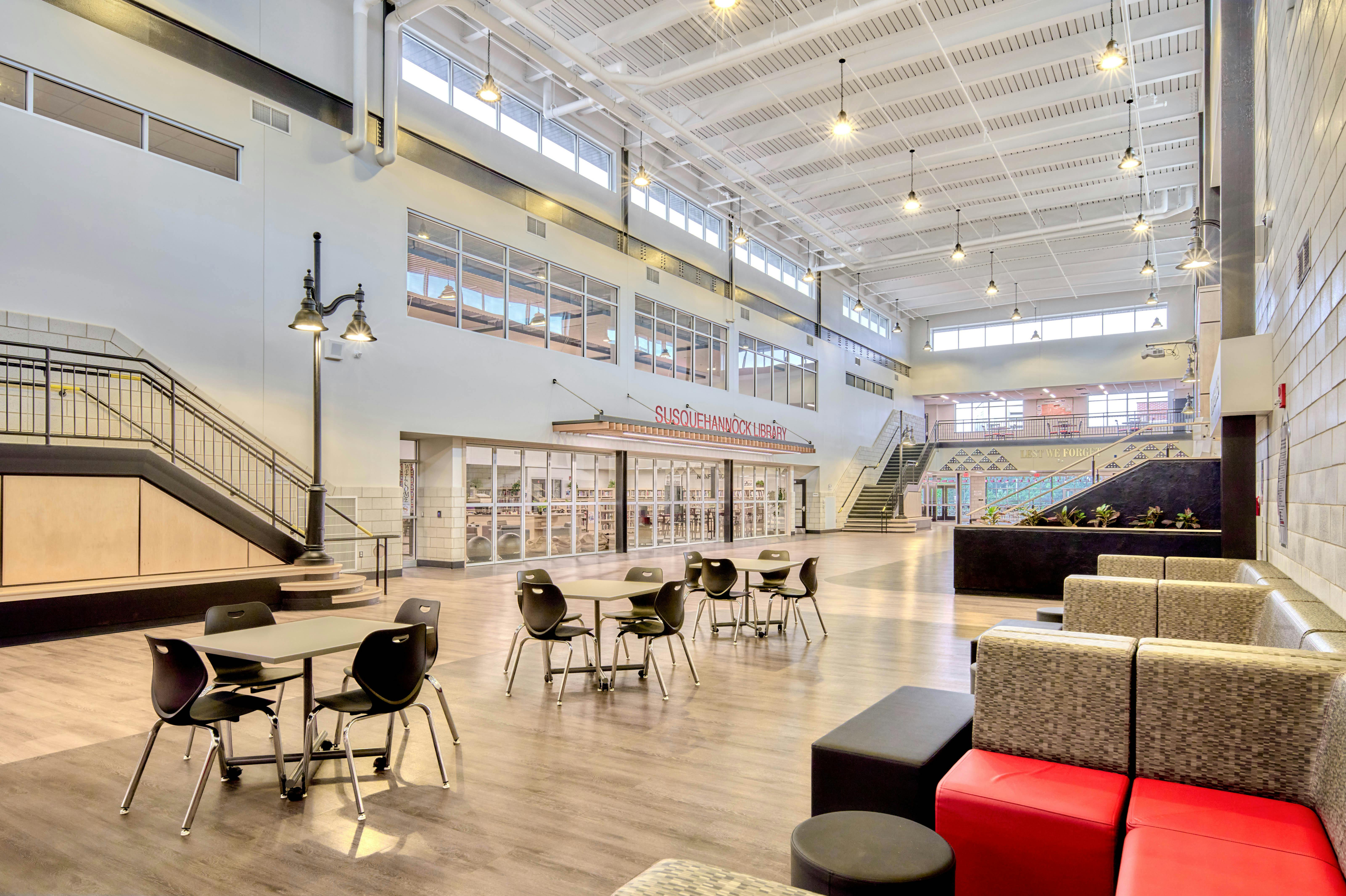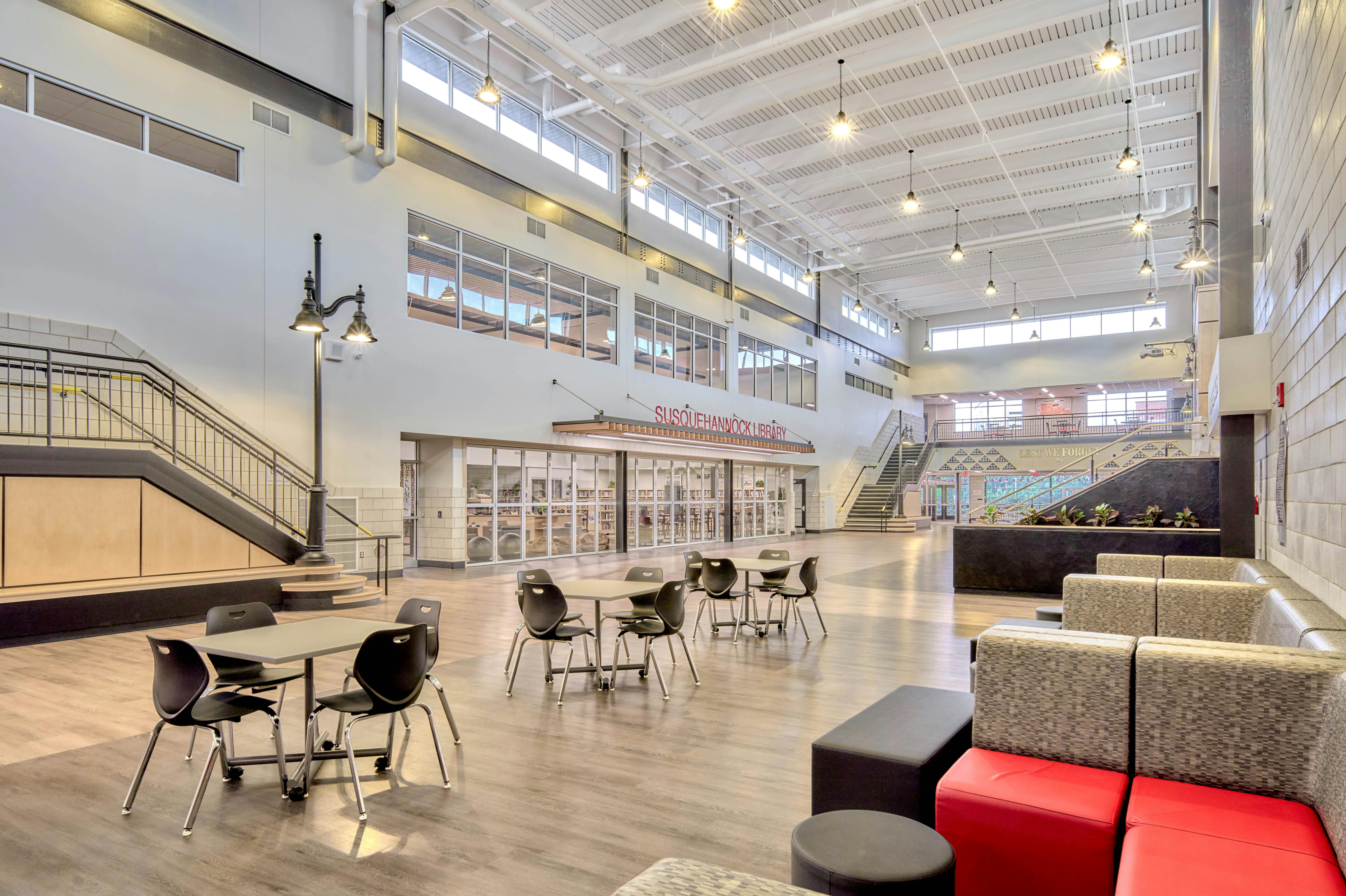 Beers + Hoffman Architecture designed the Commons Area as the heart of this Pennsylvania high school, using a folding glass door to create openness and clear sightlines into the media center.