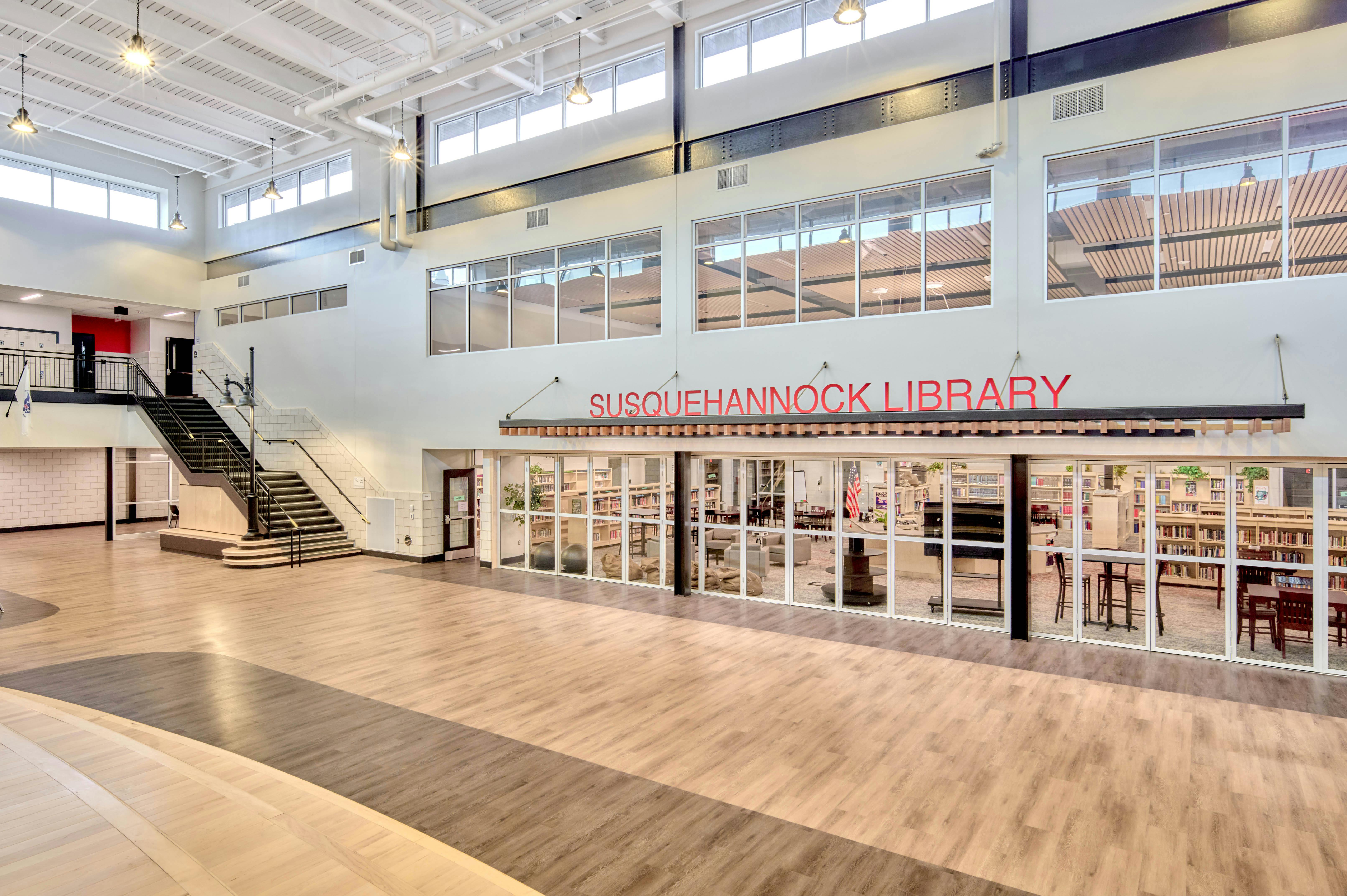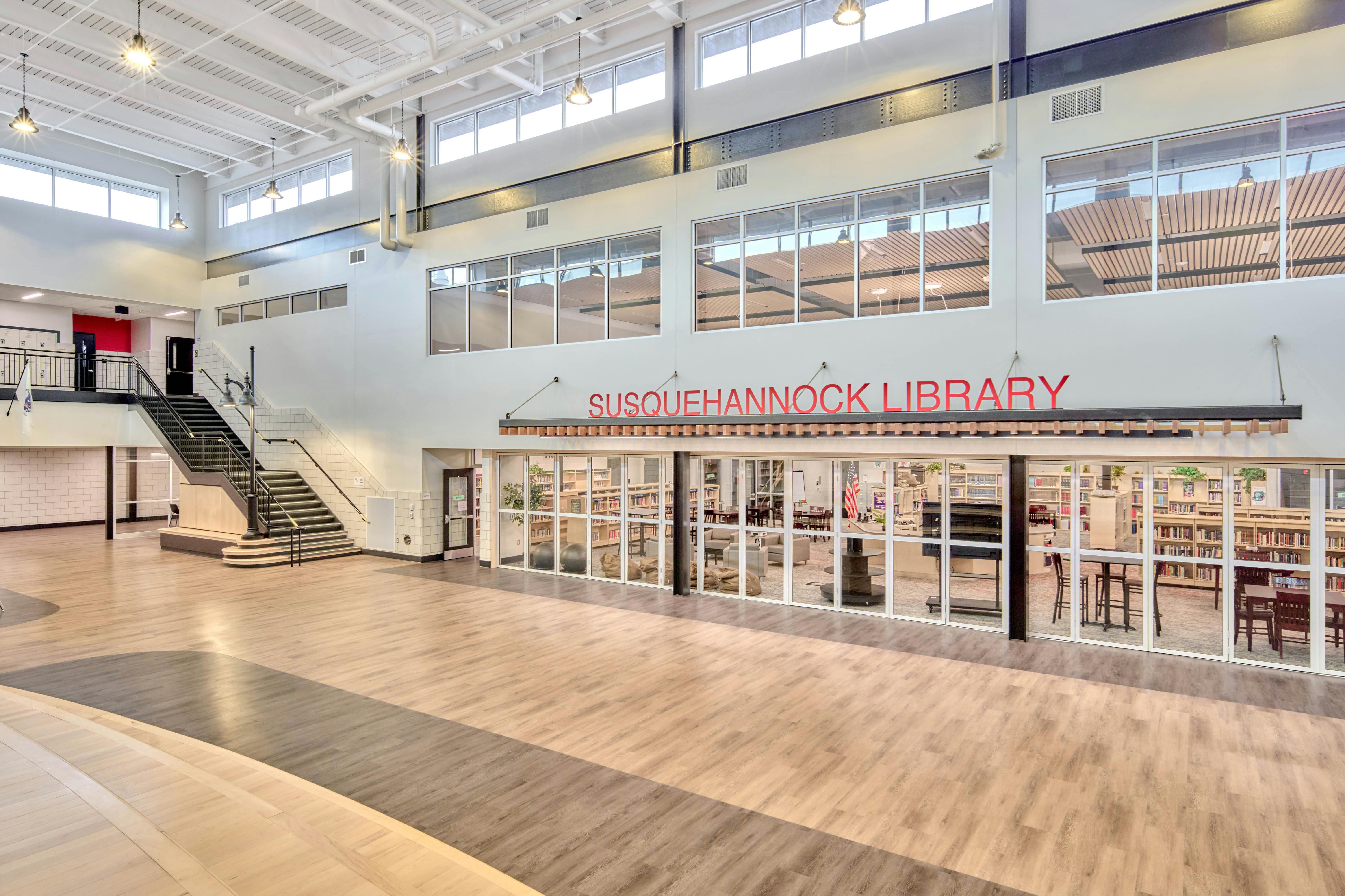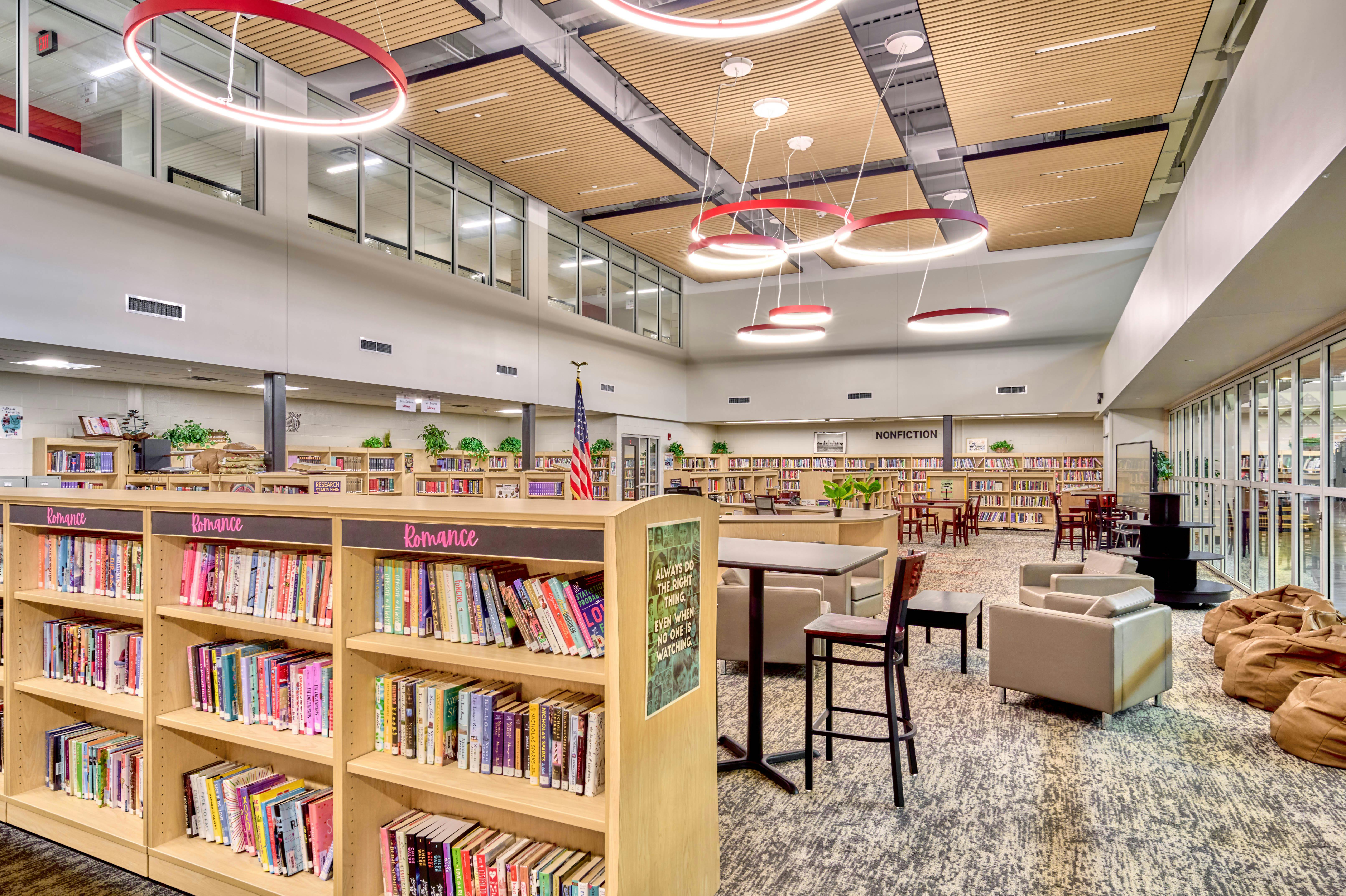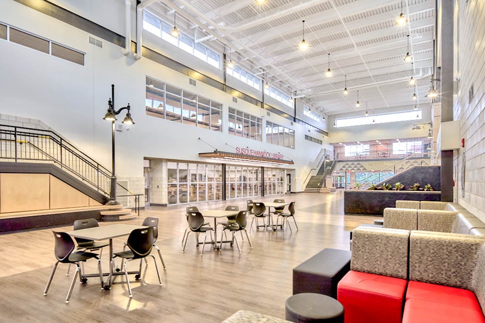 Beers + Hoffman Architecture designed the Commons Area as the heart of this Pennsylvania high school, using a folding glass door to create openness and clear sightlines into the media center.