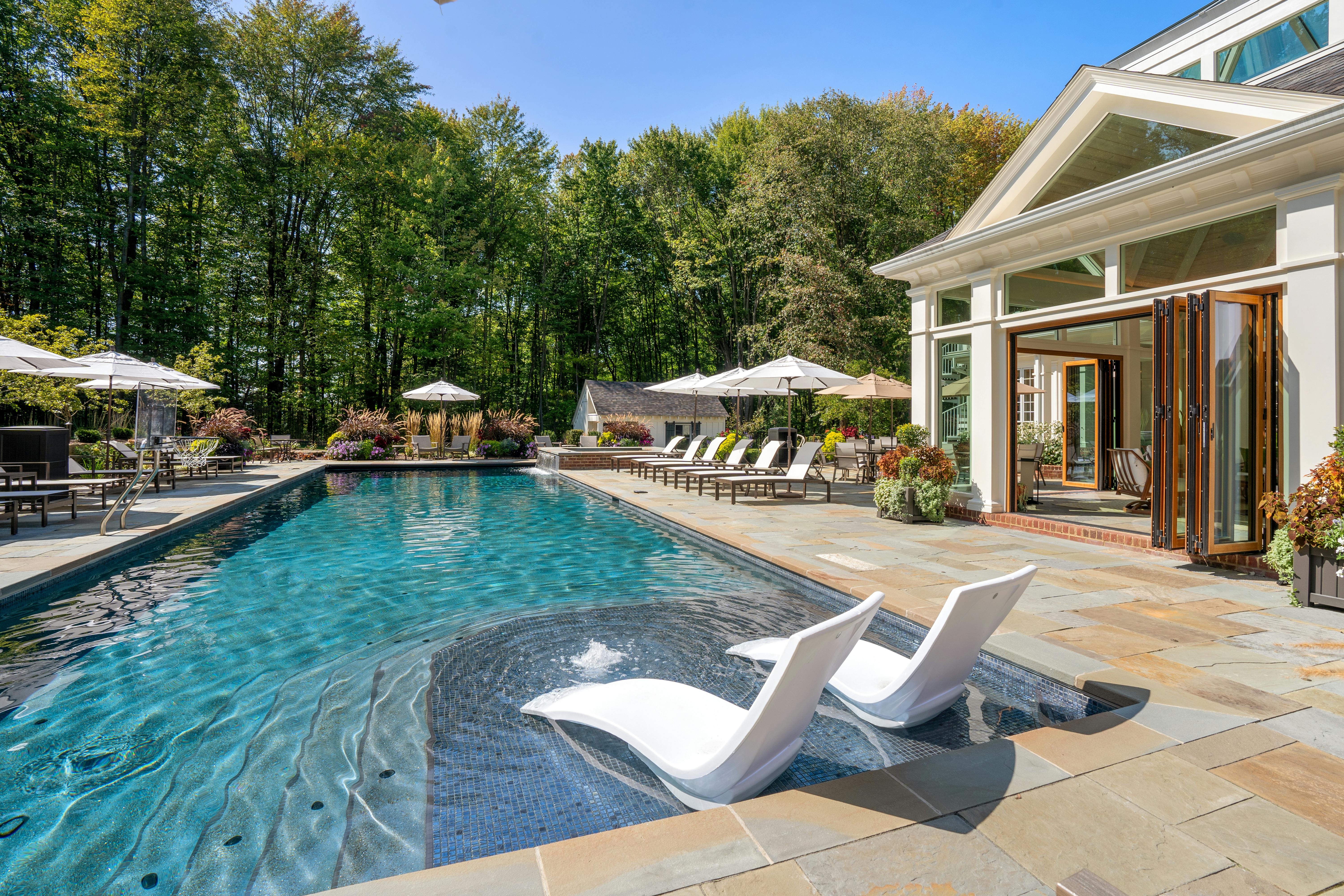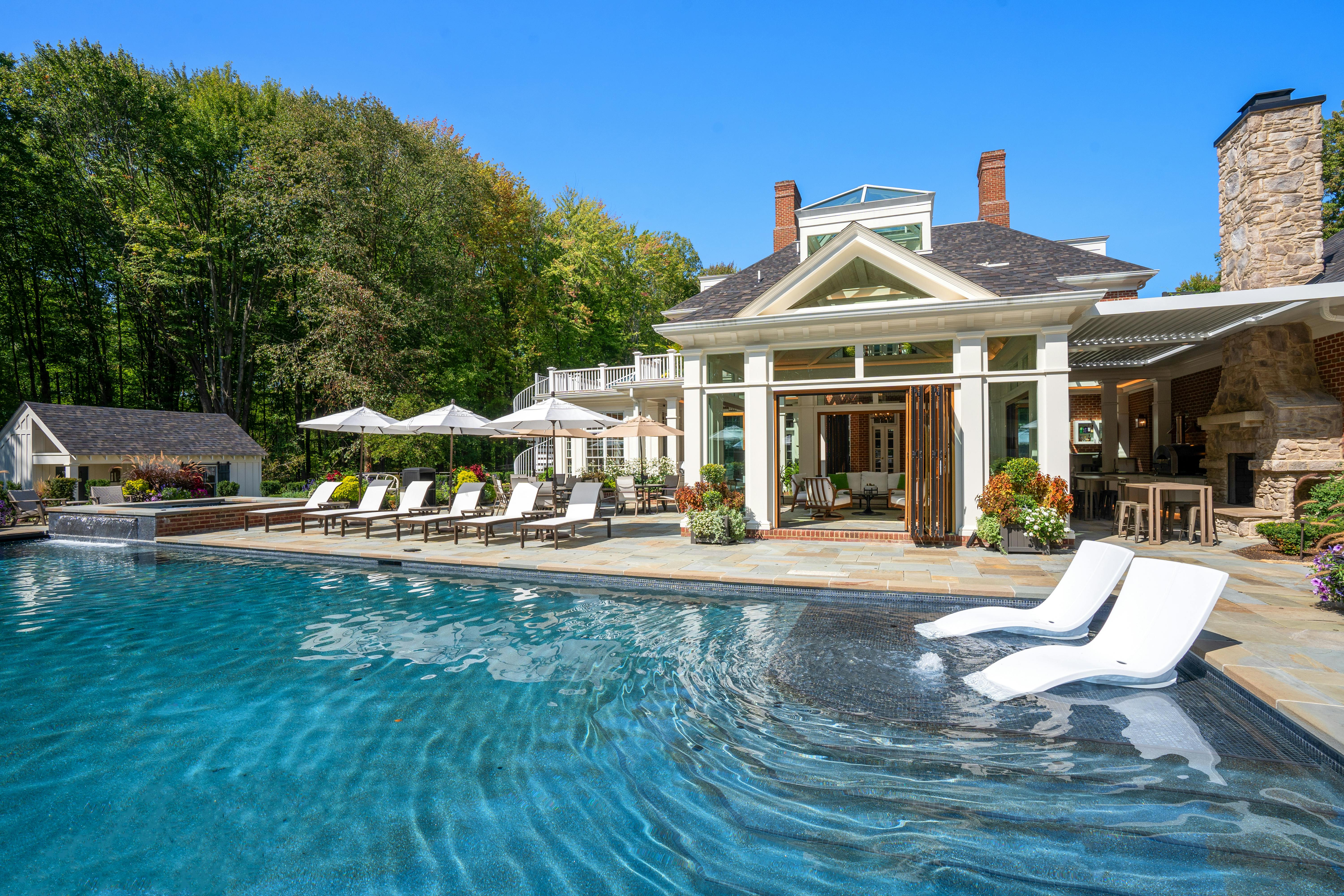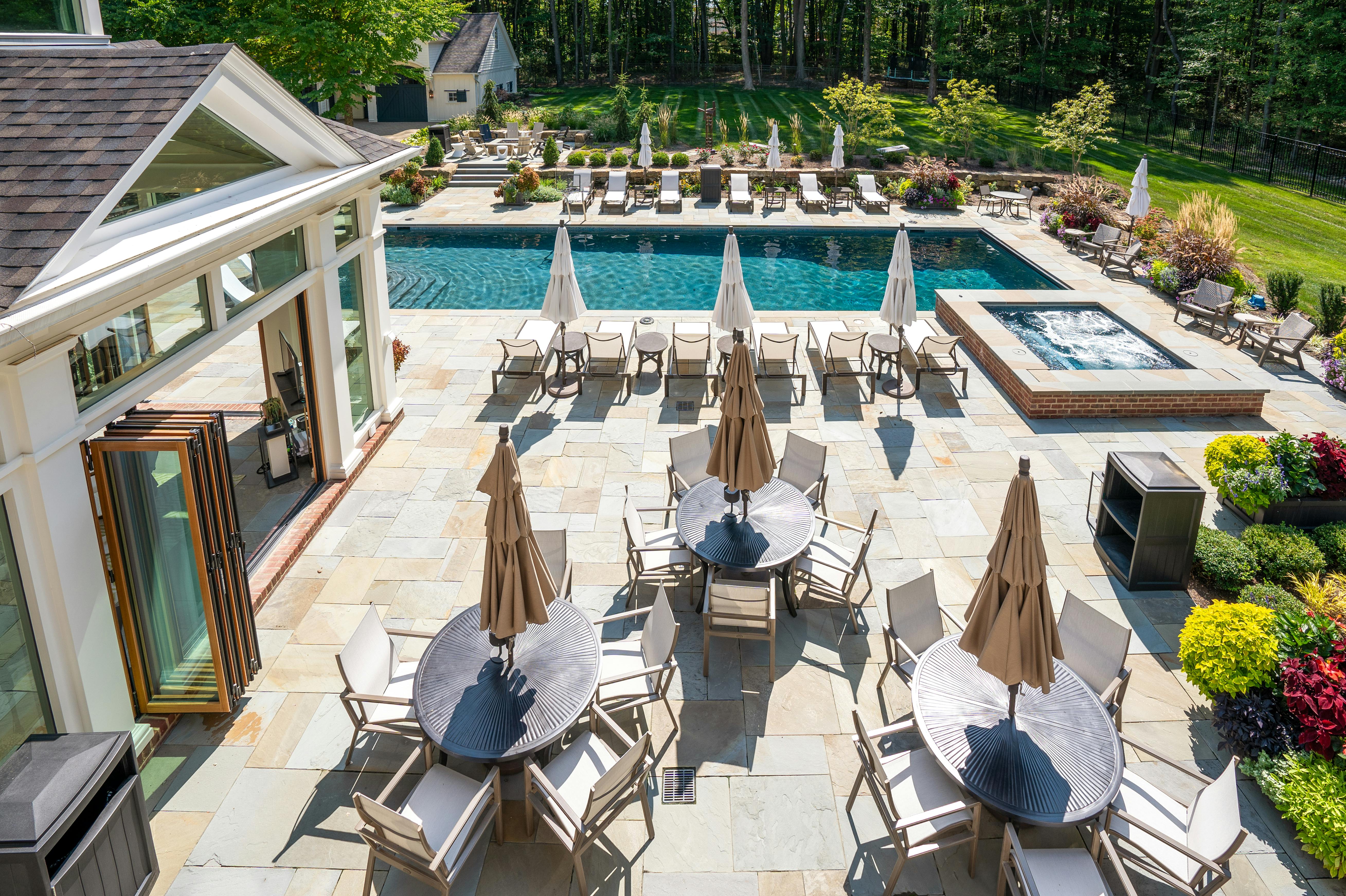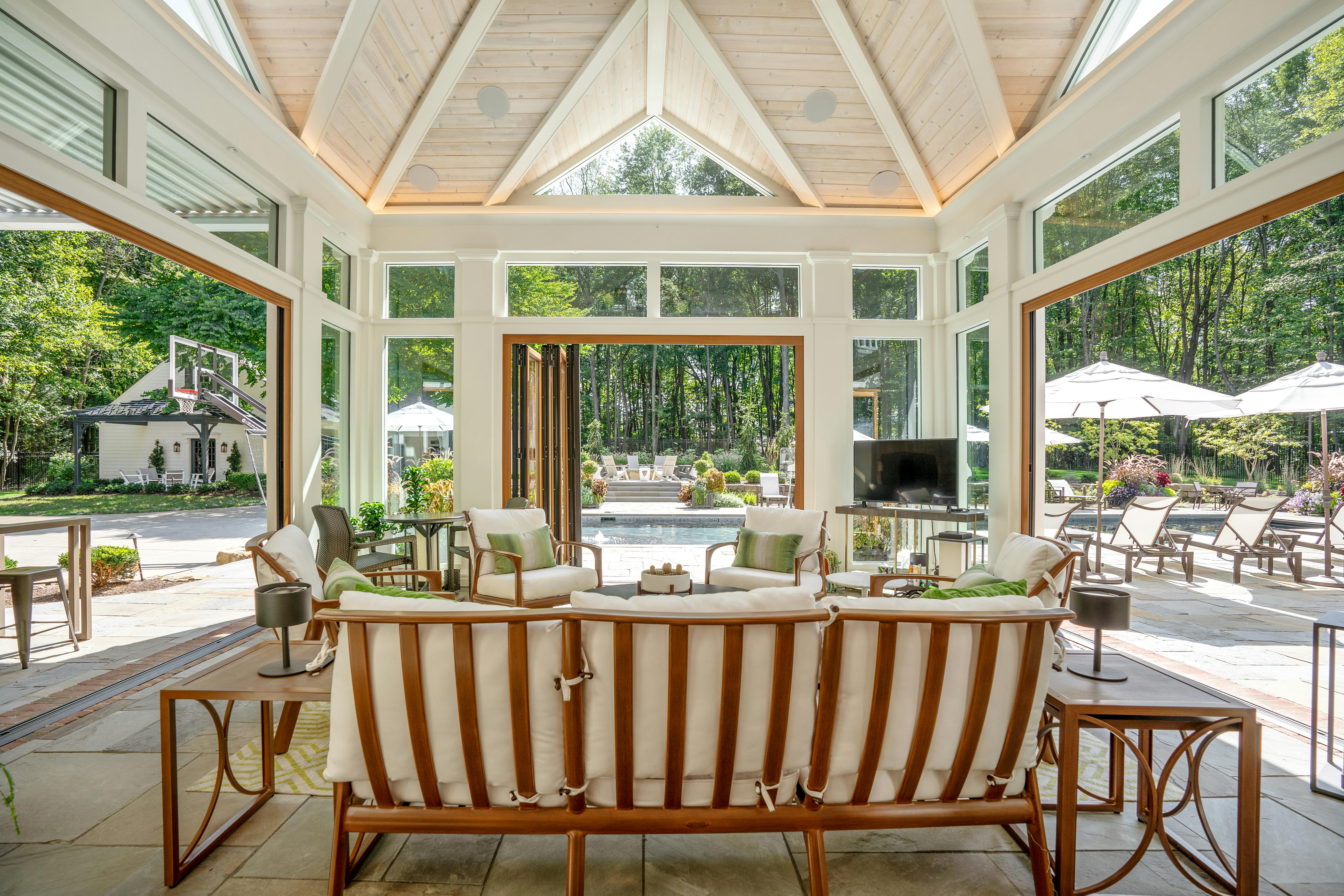 This Ohio pool house by The 4M Company opens fully with three folding glass doors, creating a four-season retreat with beautiful backyard views.