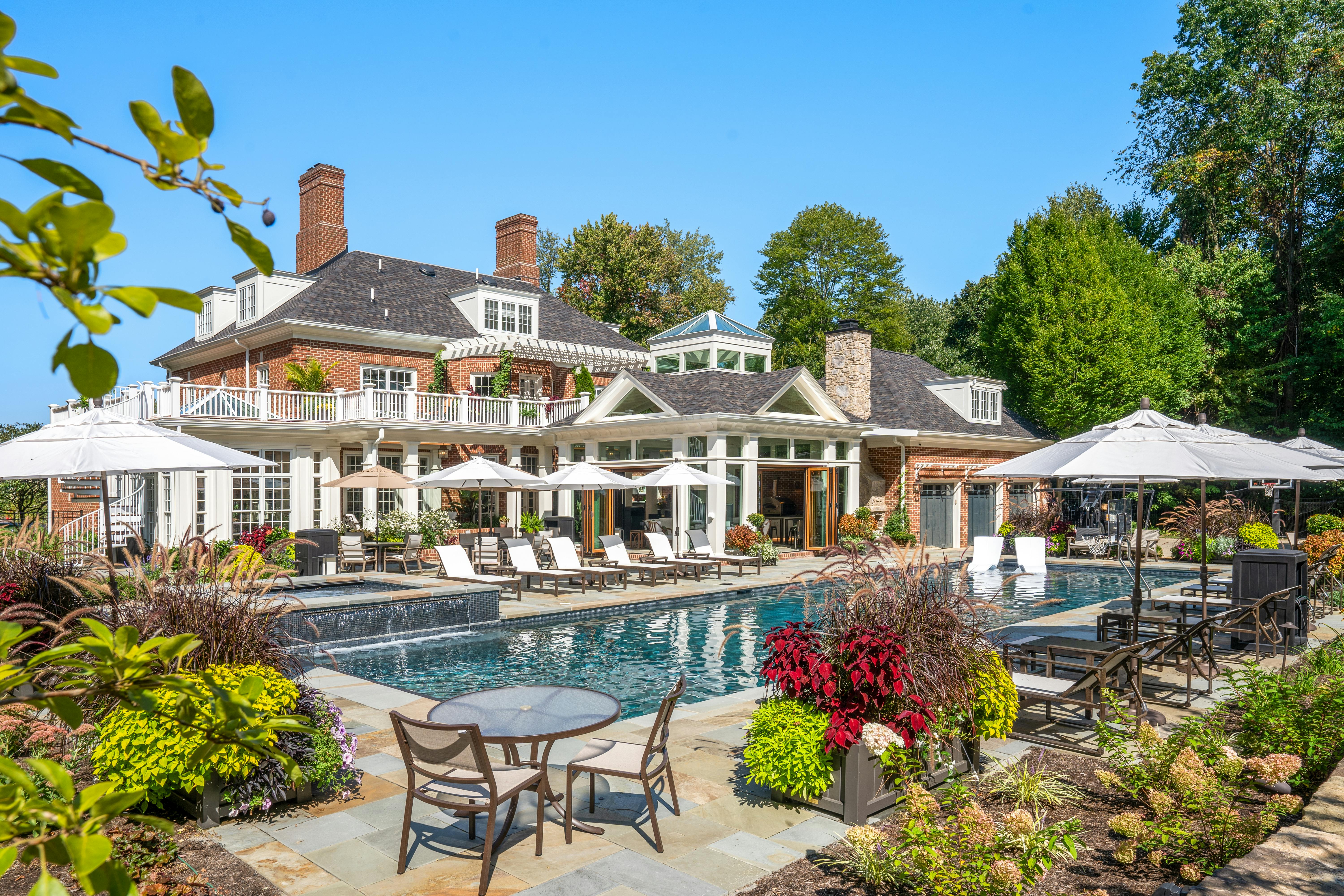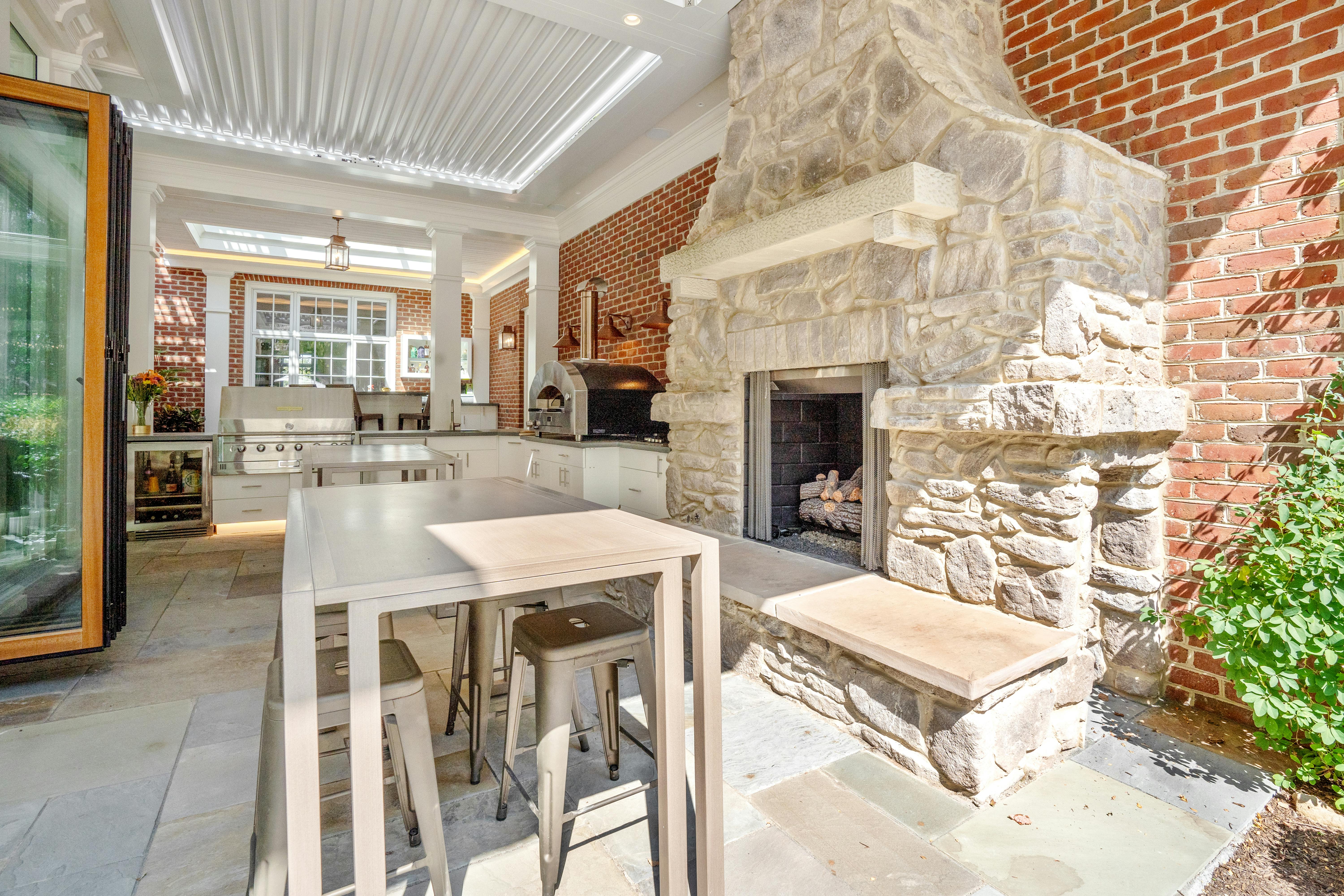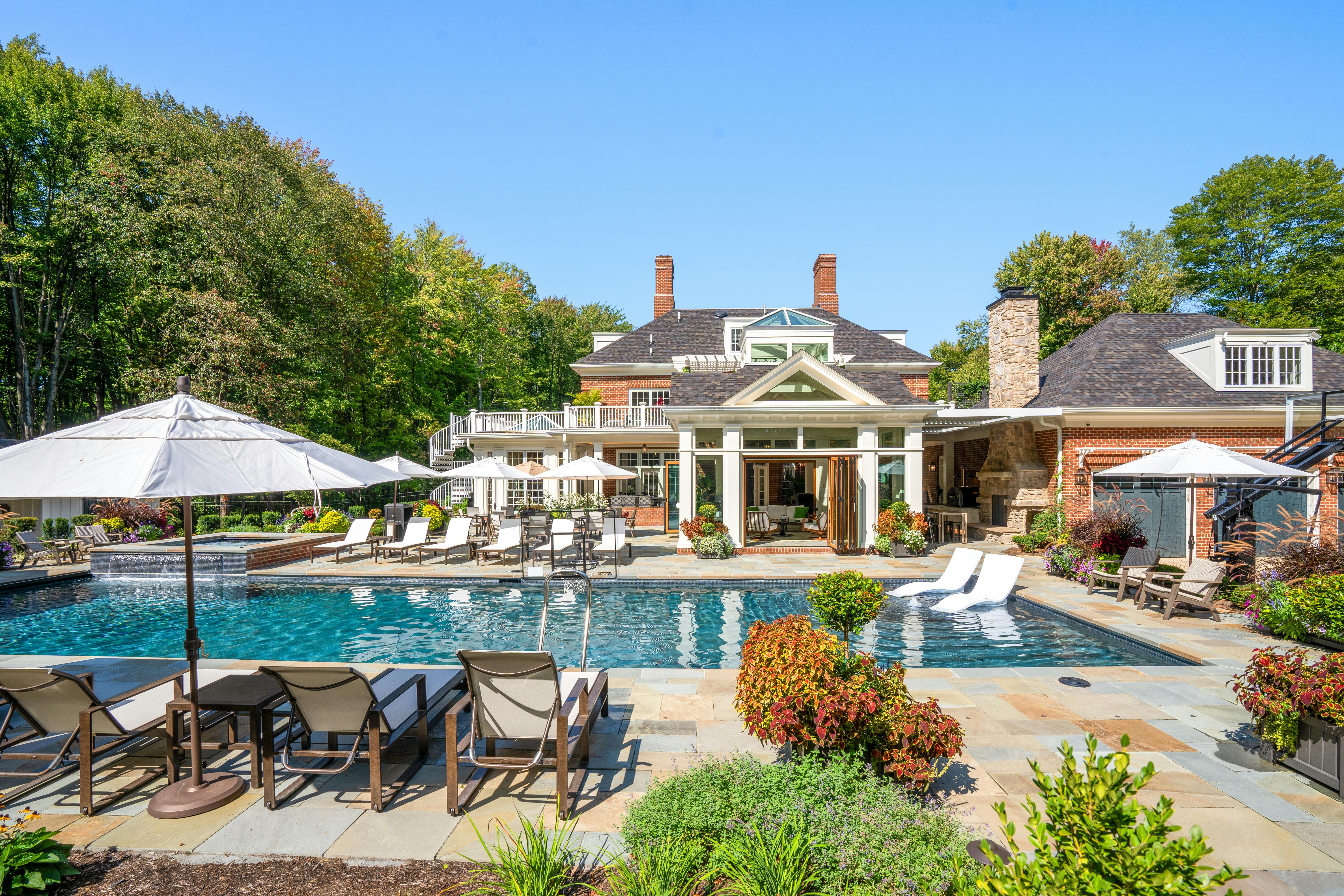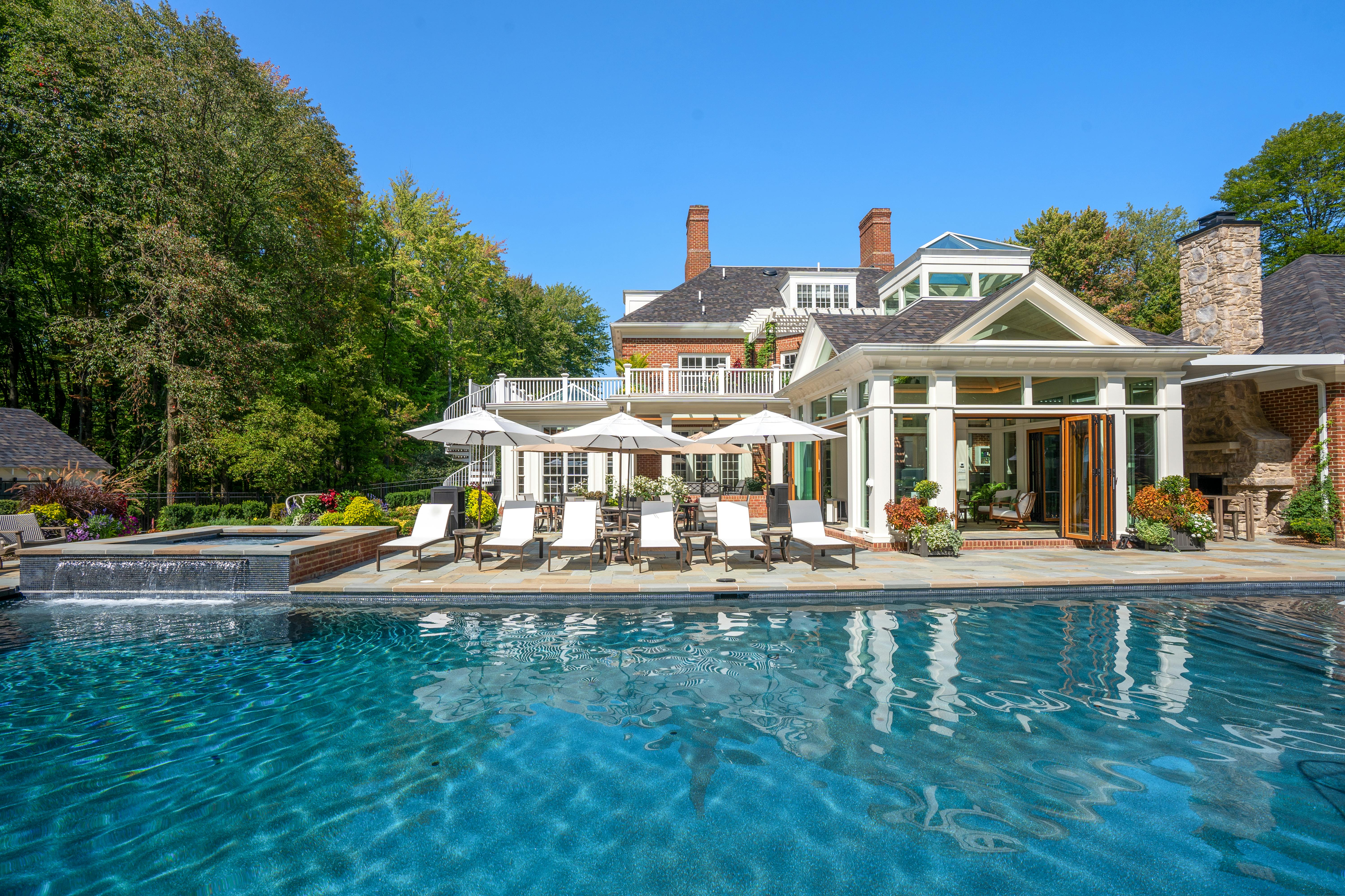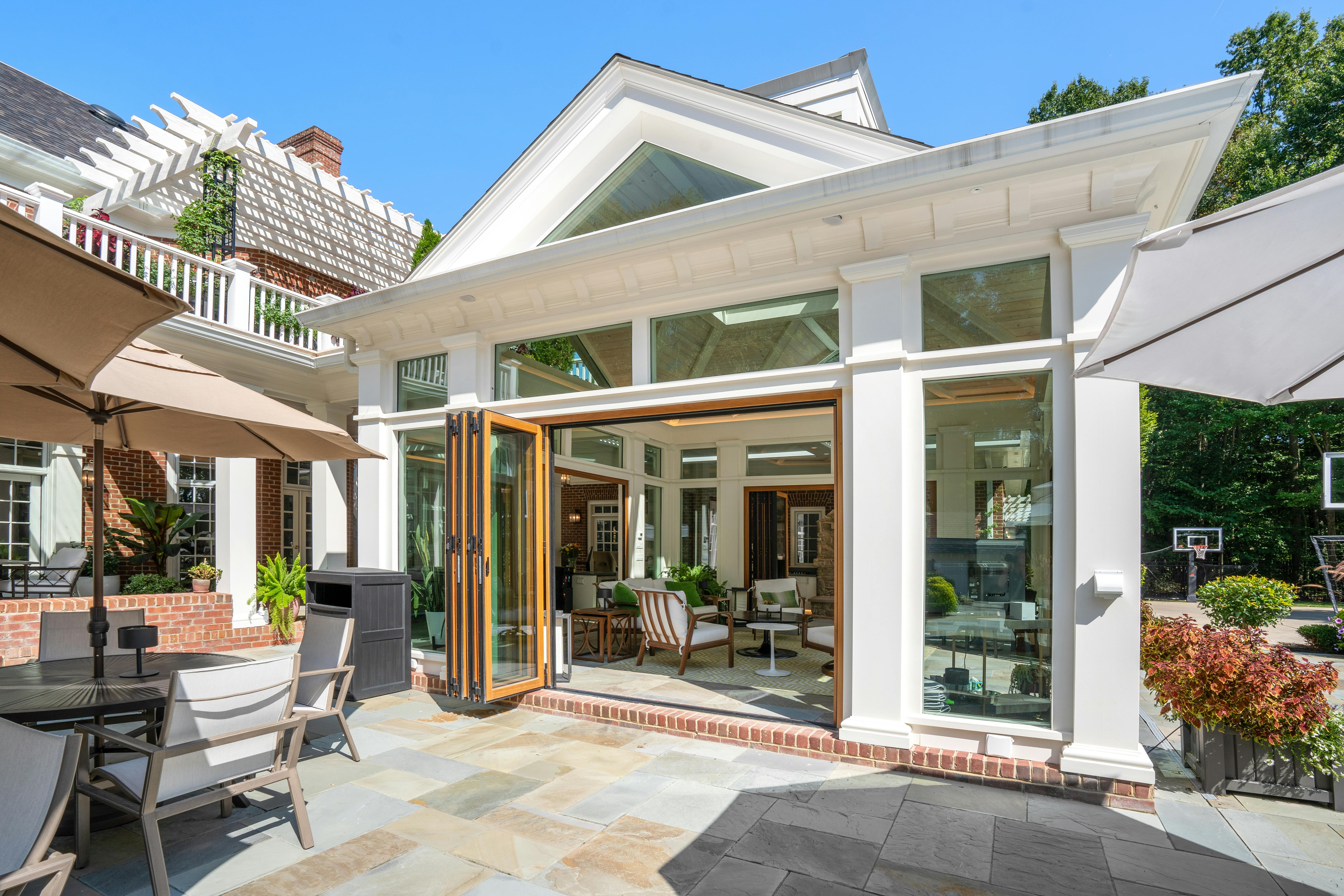 This Ohio pool house by The 4M Company opens fully with three folding glass doors, creating a four-season retreat with beautiful backyard views.