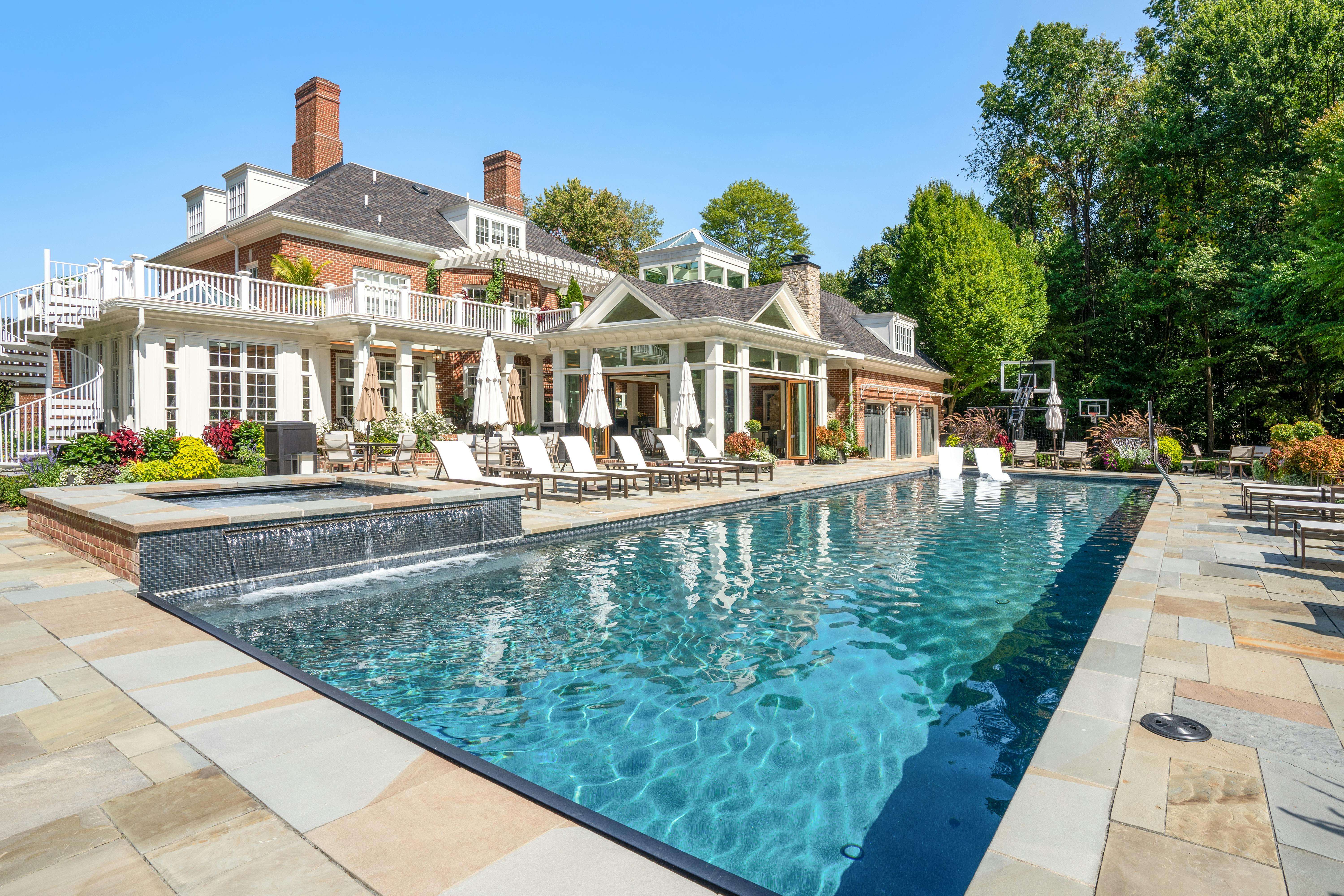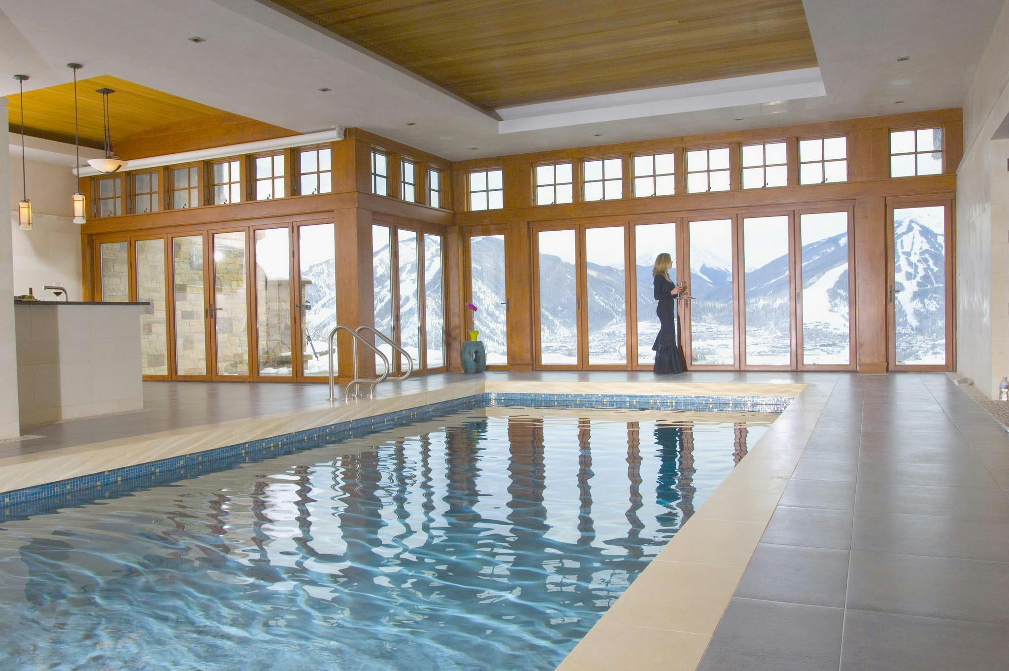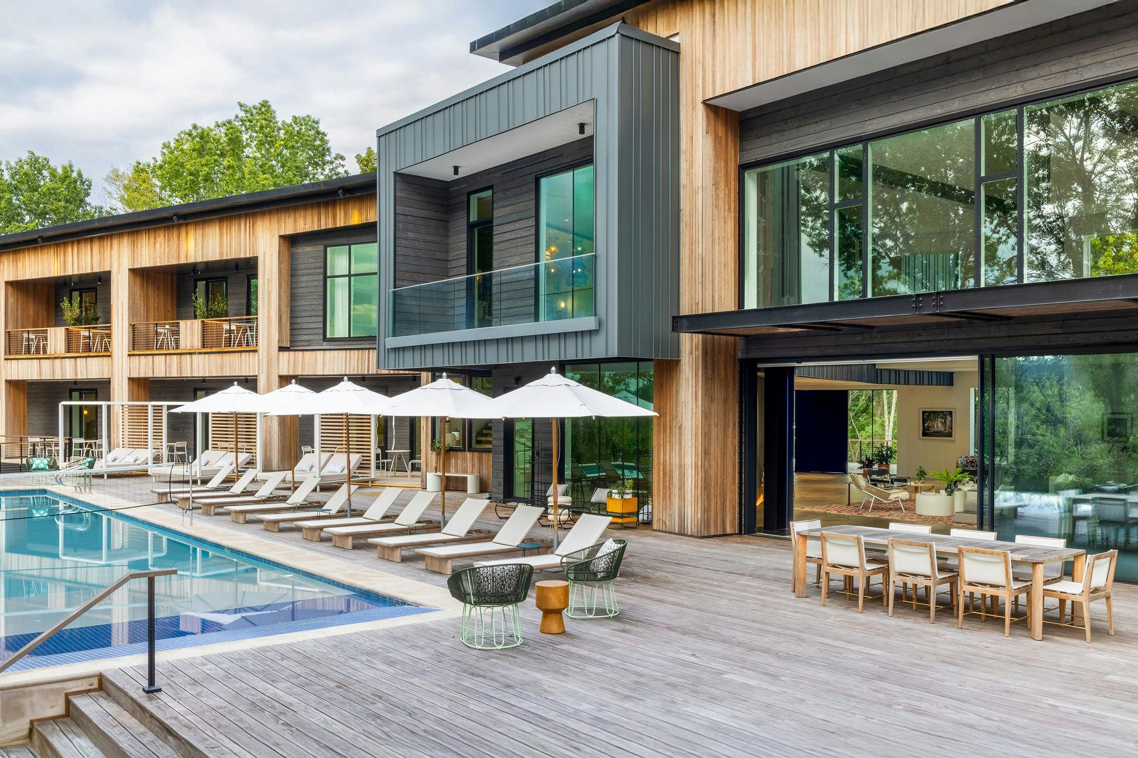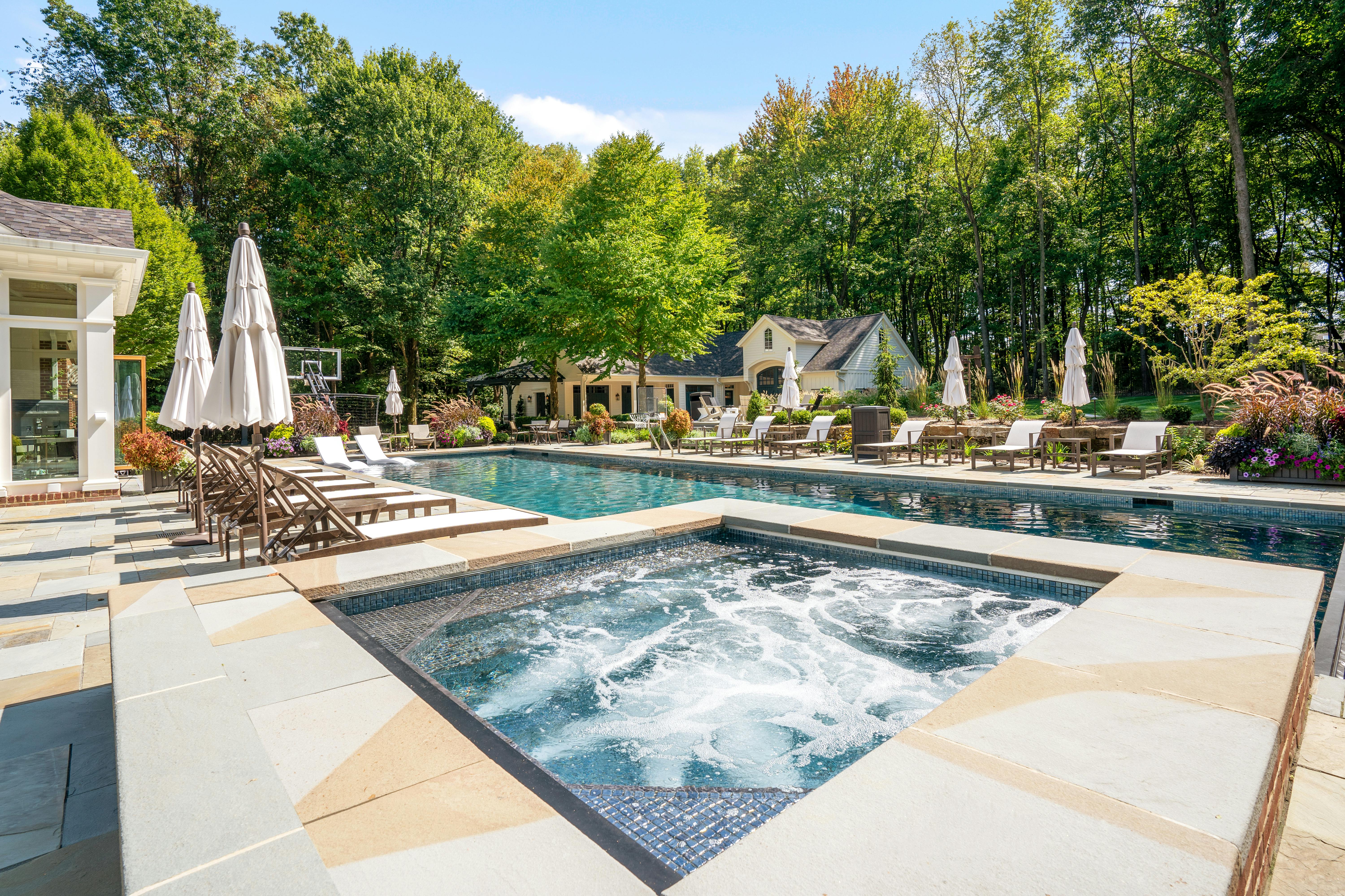 This Ohio pool house by The 4M Company opens fully with three folding glass doors, creating a four-season retreat with beautiful backyard views.