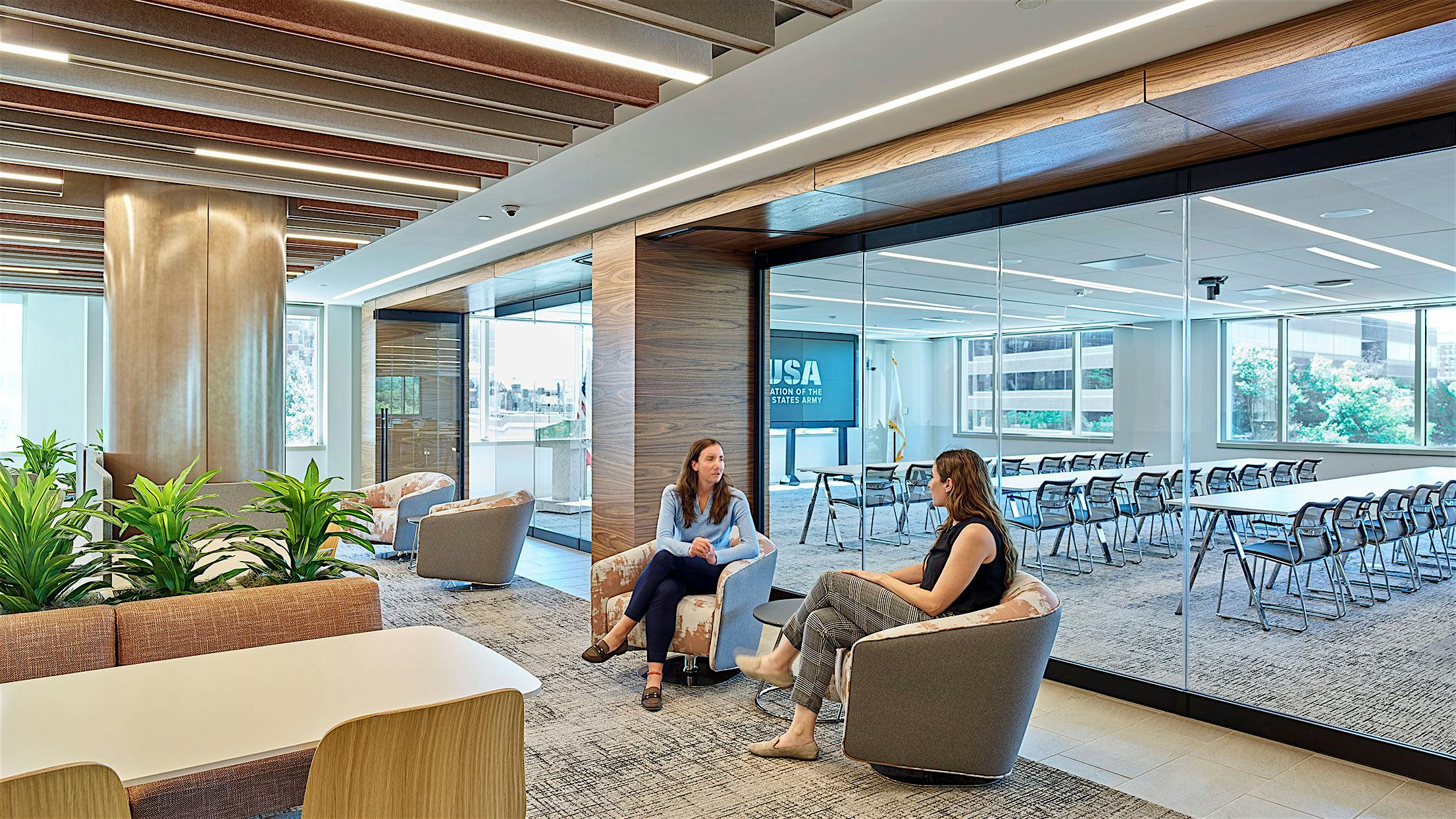 When faced with the complex challenge of delineating the Association of the United States Army’s (AUSA) sizable training area adjacent to a shared amenities space, architect and design firm, Interplan skillfully managed to meet the intricate demands of a client seeking a fusion of visual sophistication and acoustic precision. The task at hand was clearly defined: to establish a setting that seamlessly transitions between spaces while meeting the stringent acoustic isolation required for an establishment housing AUSA’s Office in Arlington, VA.
