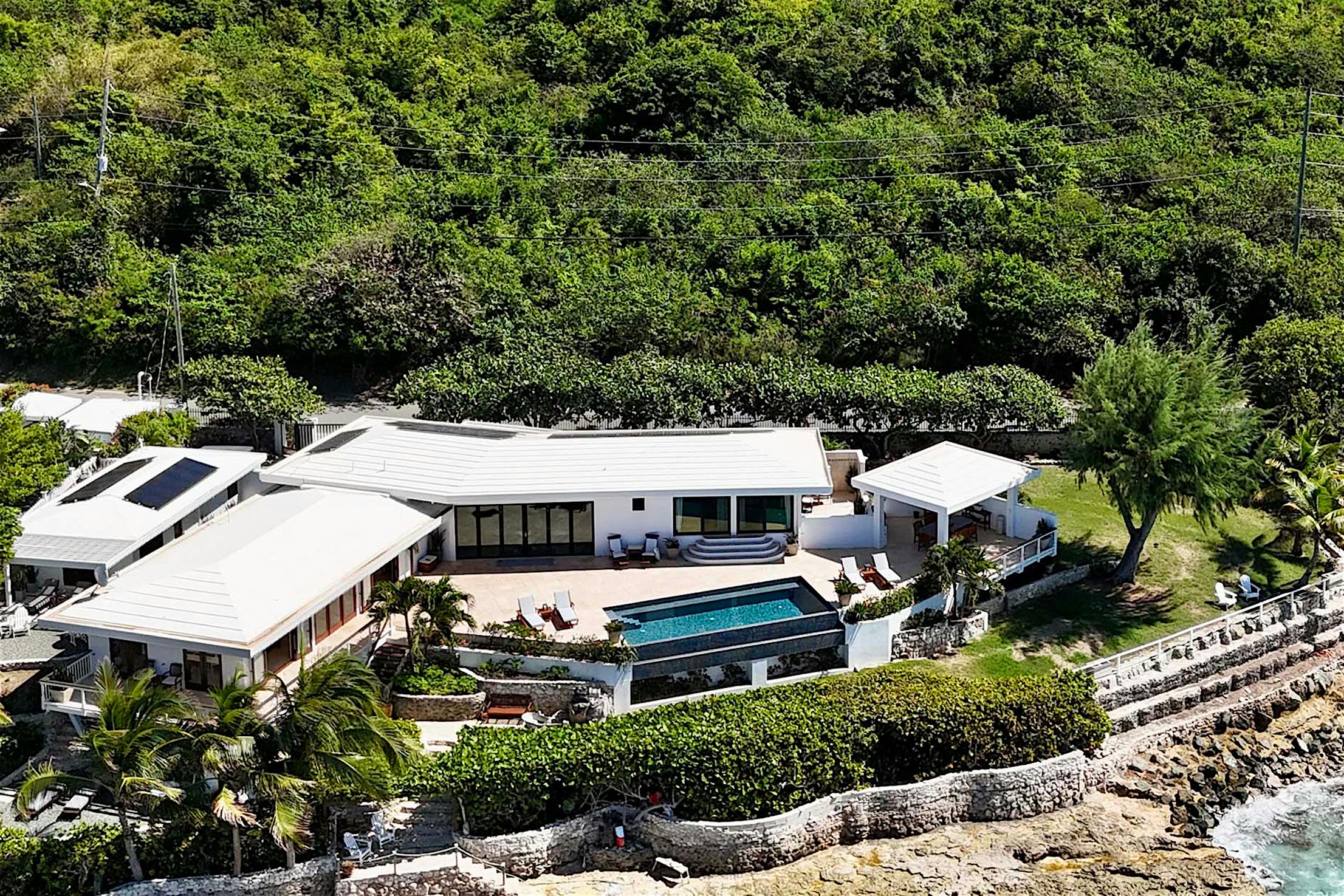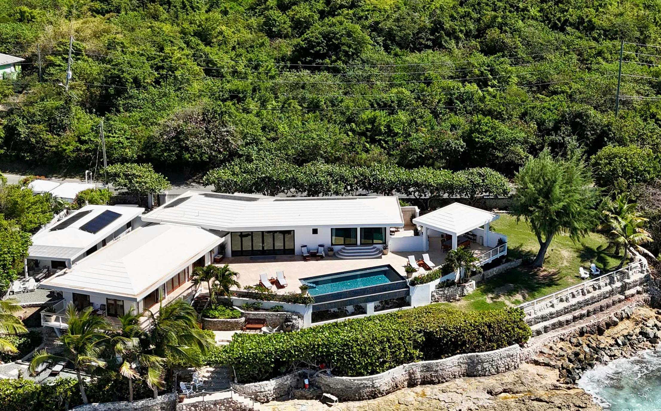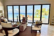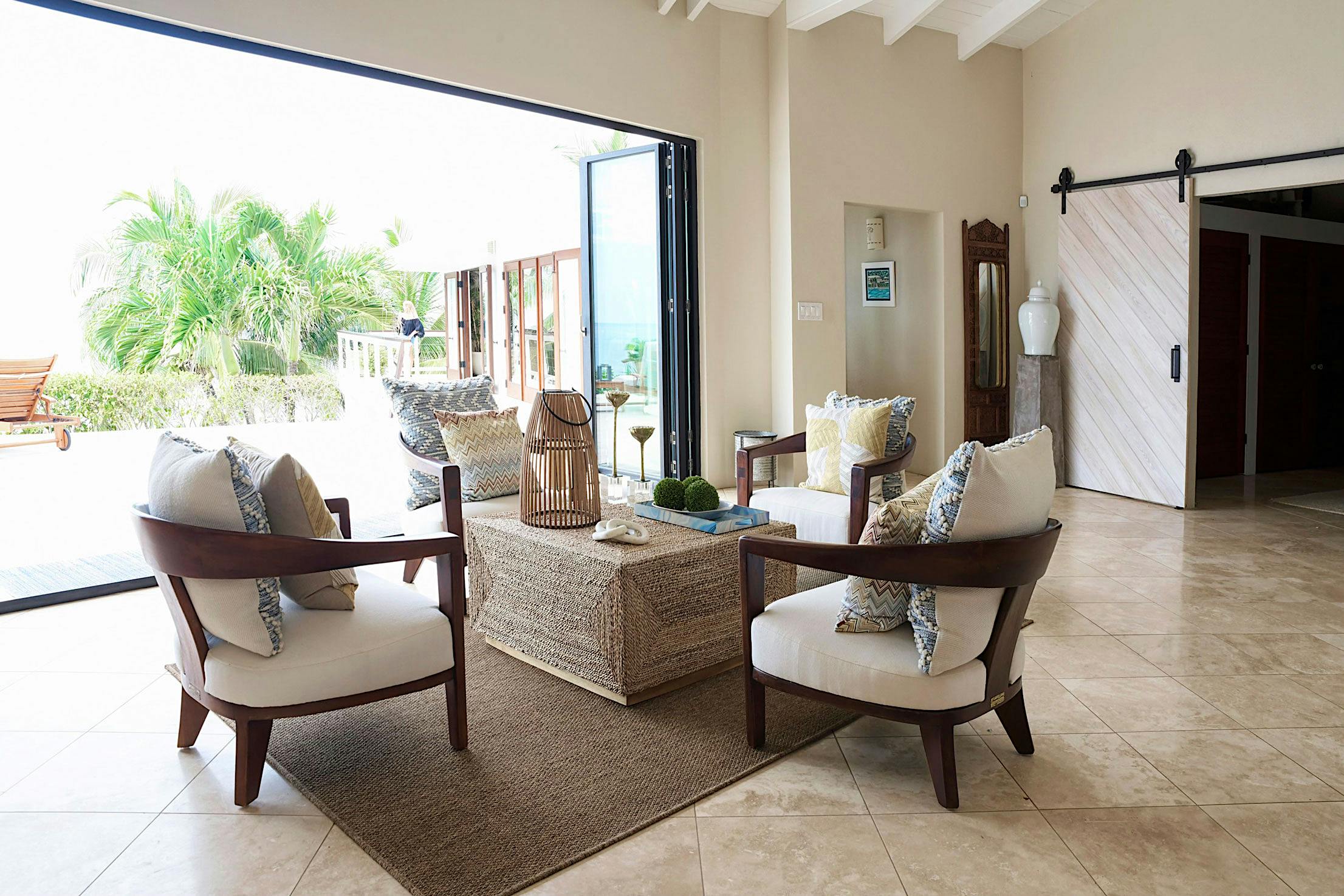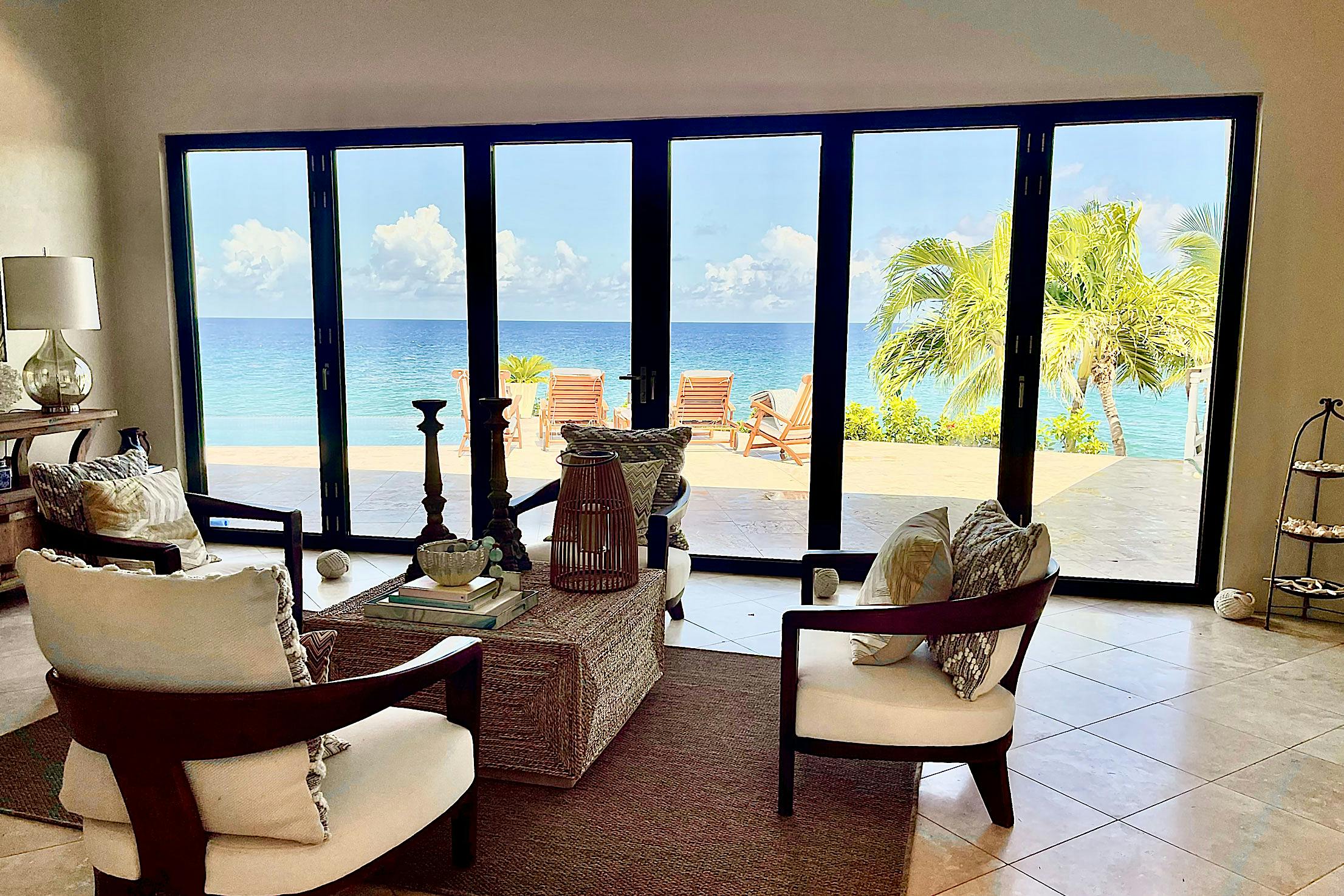 Framing the calming waters of the Caribbean Sea, a disappearing folding glass door opens this US Virgin Islands home to peaceful relaxation.