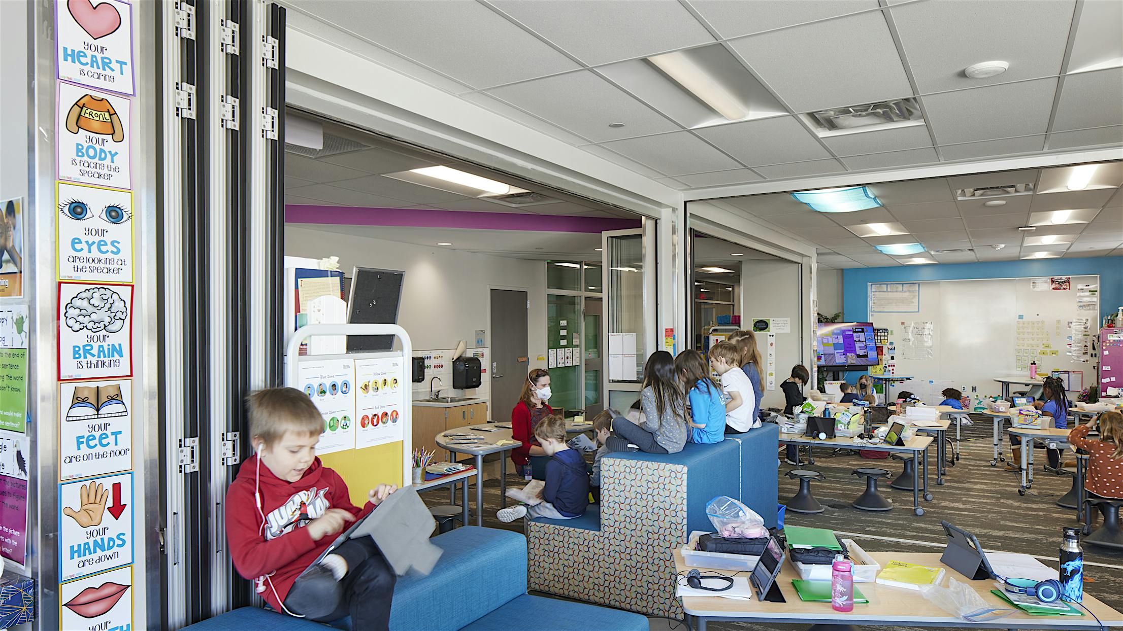 To eliminate distraction through the glass when the wall between paired rooms is closed, a translucent matte privacy interlayer, Artic Snow, was layered into the glass full height. Teachers can use these opaquer glass walls as an additional whiteboard for teaching. Glass opening into central common learning spaces have mullions at 3-foot height, with clear translucent acoustically rated glass on top and privacy-enhanced glass below, allowing passersby to see in (Learning on Display) but shielding seated students from getting too distracted.