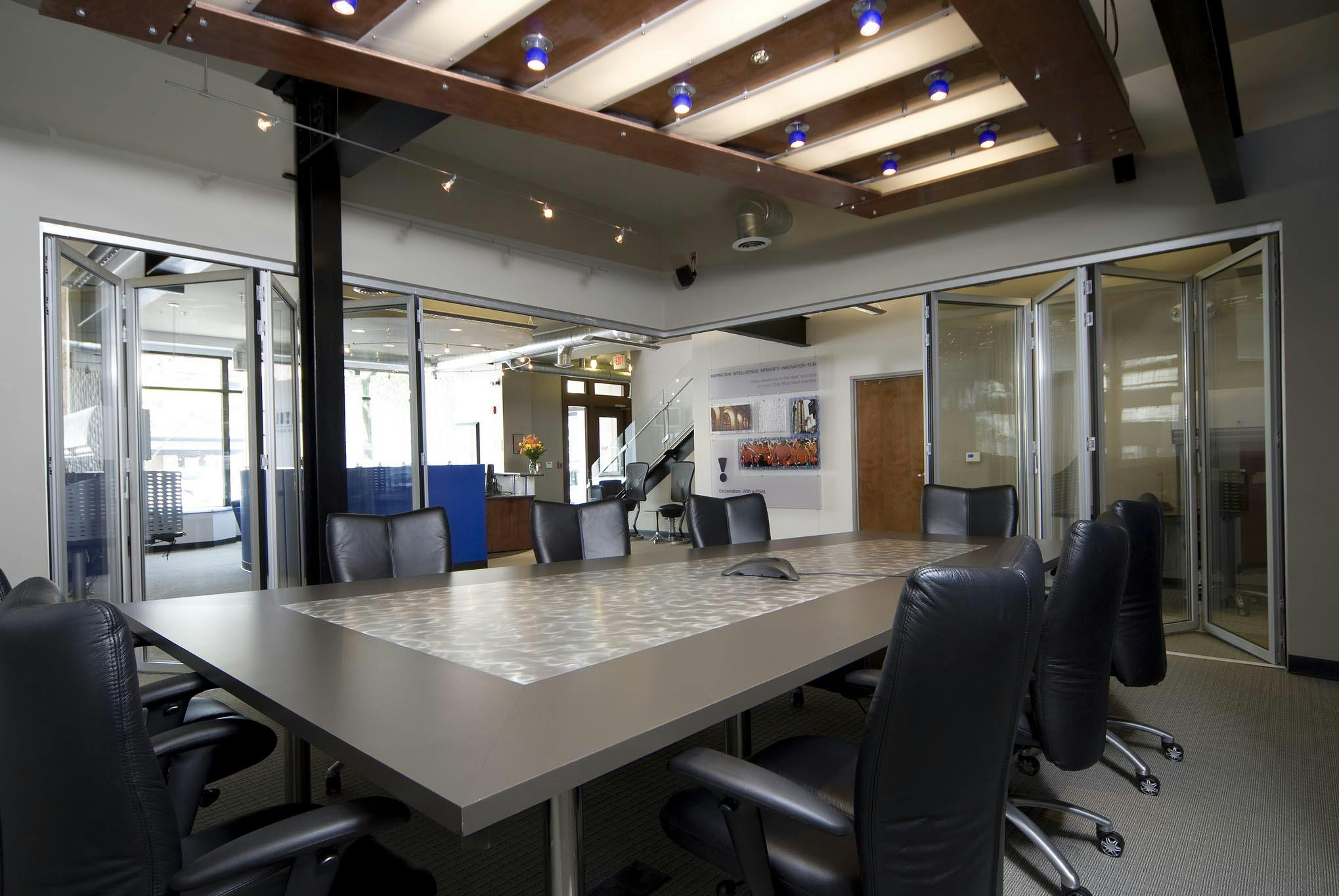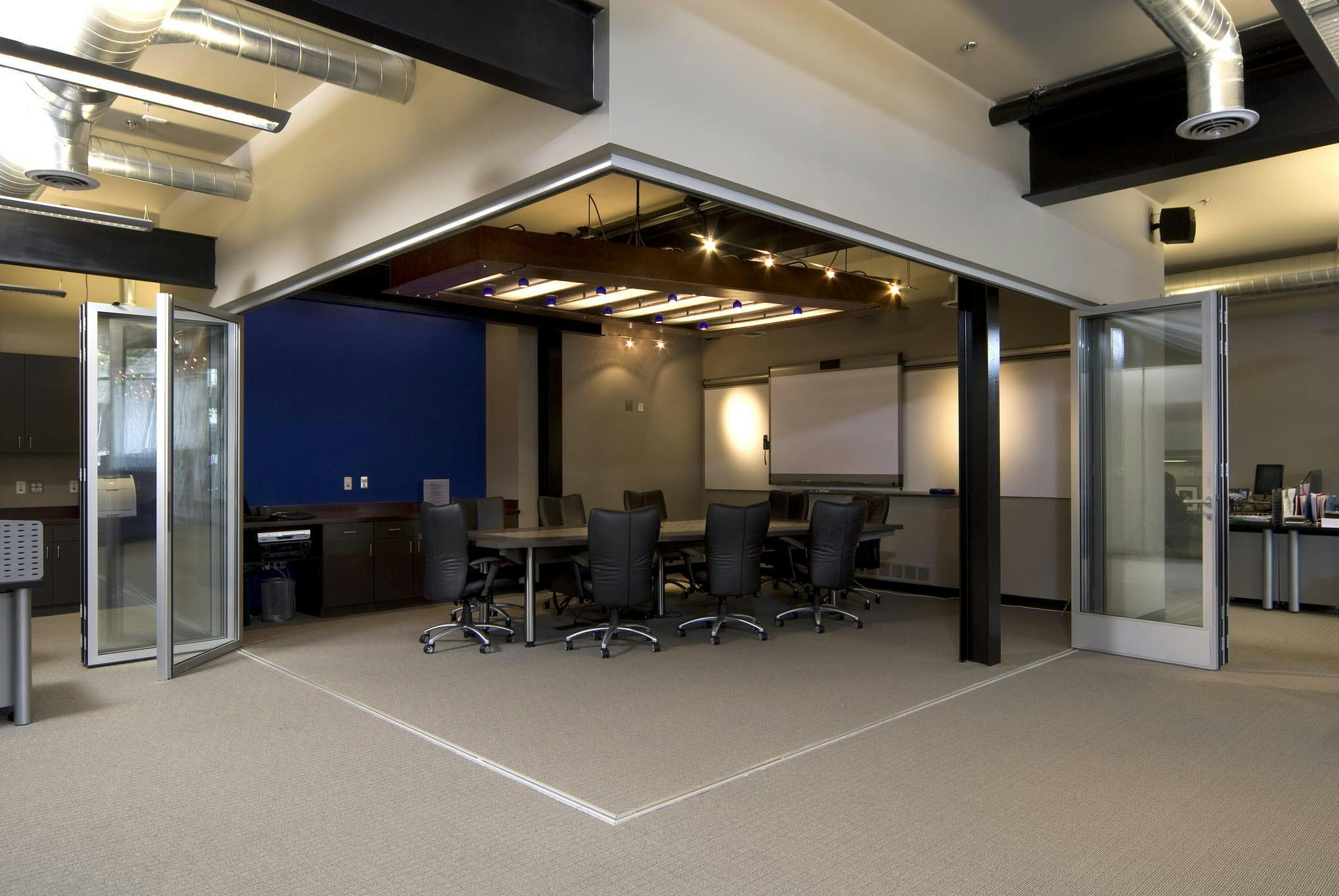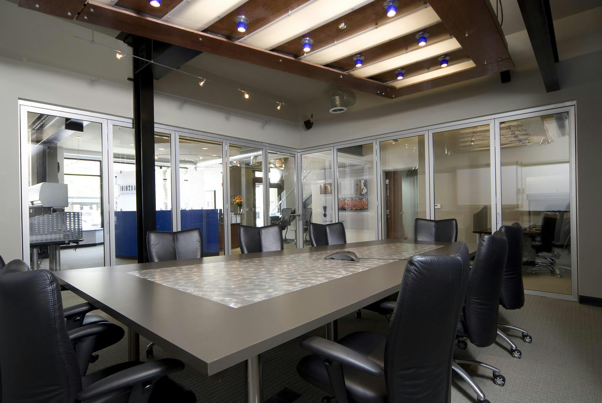 This office leveraged existing elevator lobby space to create a flexible, versatile public-facing conference room using a frameless opening glass door.