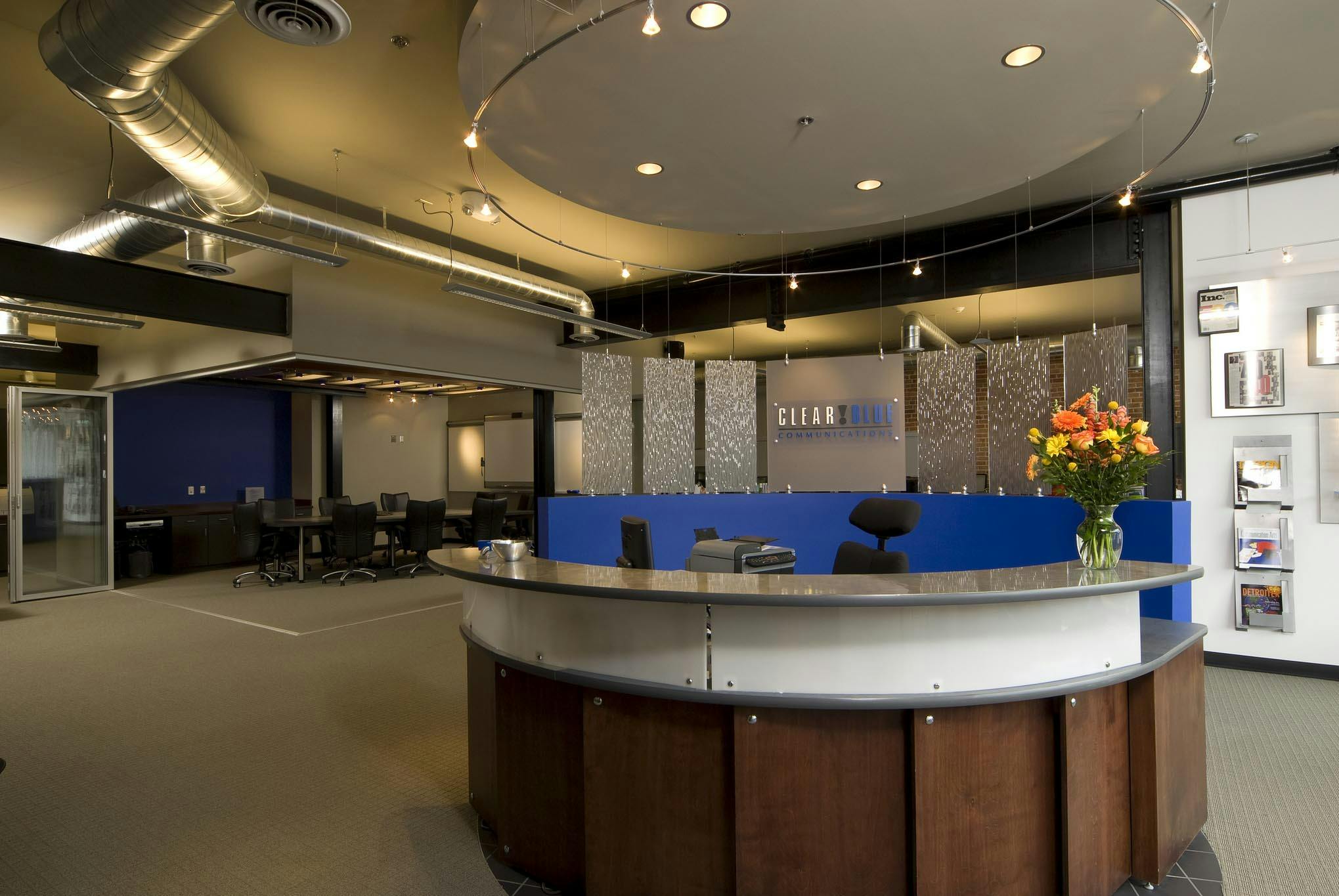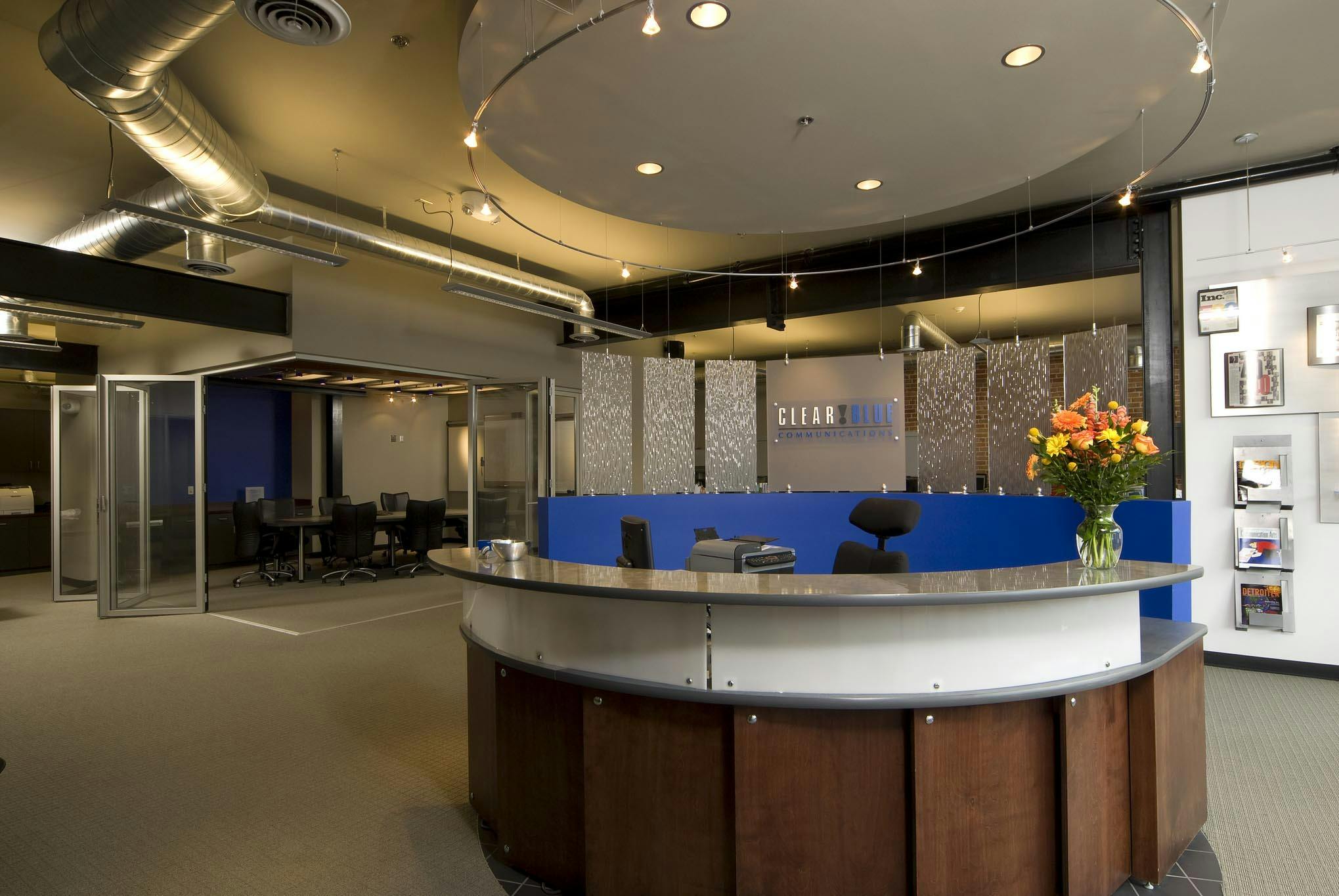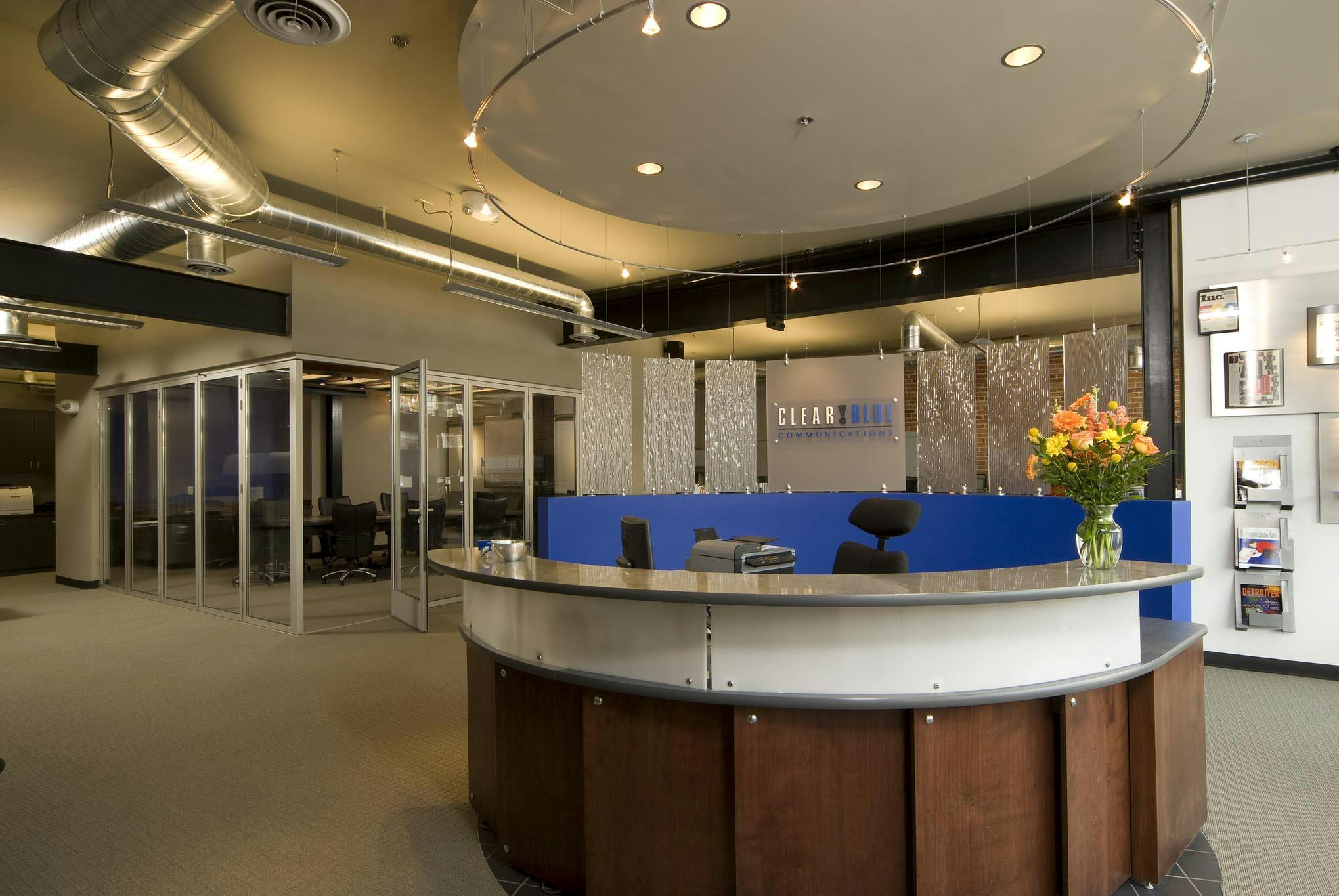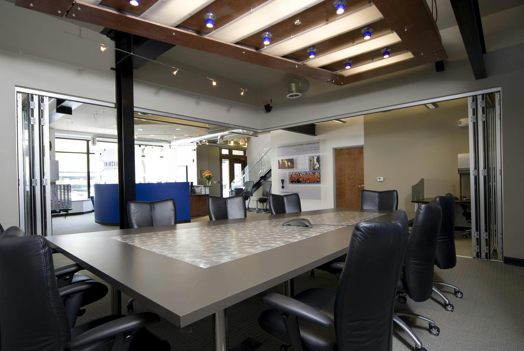 This office leveraged existing elevator lobby space to create a flexible, versatile public-facing conference room using a frameless opening glass door.