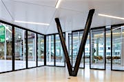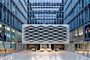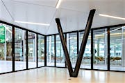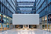 In addition to the new annex building, sop architects designed a truly captivating solution to the need of expanding the flexible footprint of usable space in the original headquarters building. Architect Jochen Solbach and the sop team created a kinetic-like sculptural pavilion within the convertible glass roofed atrium. Playing with the sense of translucency, nature, light, and air, now sits a floating “Cloud”.