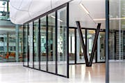 When needed, the closed system’s thermally broken panel design and insulated laminated glass provide not only a warm barrier but also the acoustical buffering needed in this office environment—all while reinforcing the overall translucent design intended by the architects. For traffic flow and convenience, the system is outfitted with four integrated swing doors that glide out of the way with the rest of the panels when the system is opened. The engineering of the self-guided wheel technology makes the panels easy to move with a single hand.