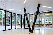 To achieve the levitating appearance of the “Cloud”, V-shaped structural supports are used and the need for structural columns at the corners was negated. This recessed V-support system truly gives the illusion of flotation to the covered conference room as if it were a “Cloud”. Moreover, this is further enhanced by the product chosen to enclose the flexible break room space on the ground floor, an HSW60 single track stacking glass door system. The manufacturer of the glass wall system, Solarlux, is the German partner of USA-based NanaWall Systems.