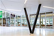 Completed in 2018, the newly redesigned open space serves as an open or closed event and break room for the employees of DEG. The convertible glass roof is opened on a regular basis in pleasant weather and transforms the atrium into an airy courtyard. Yet, in order to gain flexible sheltered space for the workforce, the architectural firm embraced a room-within-a-room concept to add the much-needed year-round functional space. "Our idea was to extend the existing cafeteria with another room in the atrium, with a dividable conference room [built overhead] - all integrated into an object that looks like a sculpture in the surroundings," says architect Solbach.