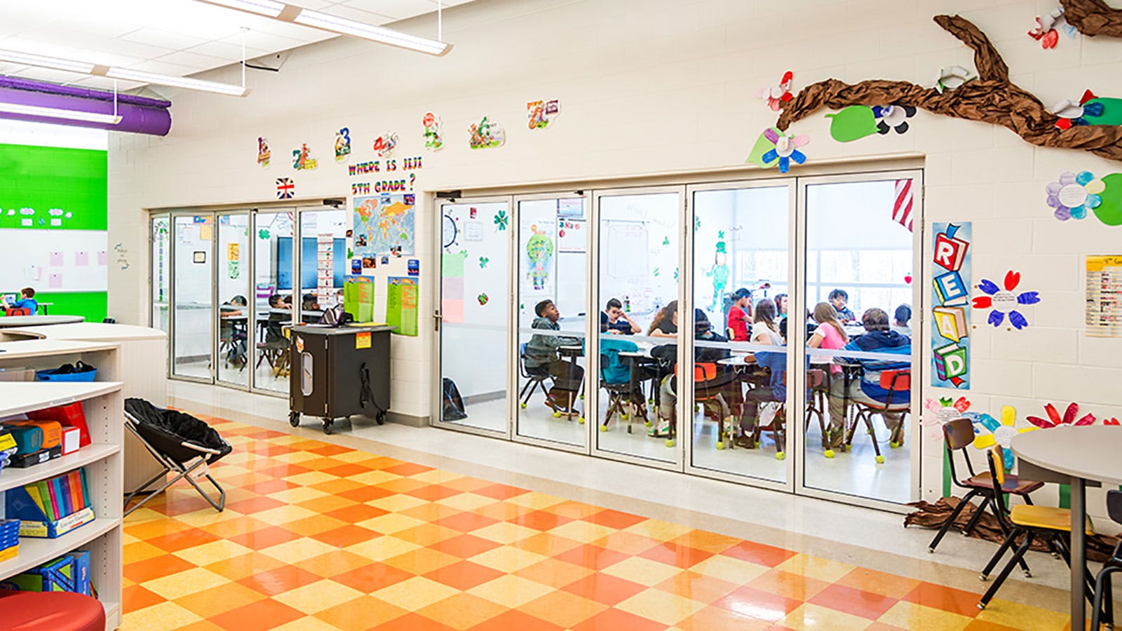 Although the school’s original vision included fixed metal and glass walls that would form two separate classrooms, the architect proposed a more dynamic design with acoustic glass wall systems to provide maximum flexibility of space.