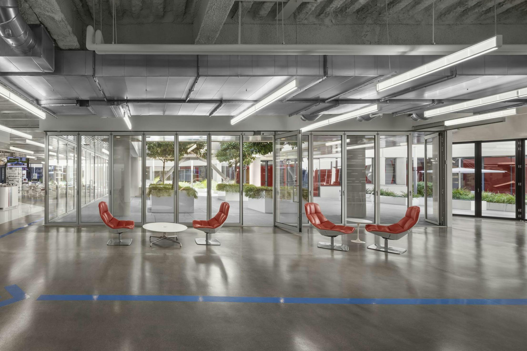 To maximize flexibility for larger gatherings, NanaWall SL45 folding glass walls are also installed in two of the biggest conference rooms on the first floor. “They open into the central area, doubling or tripling the rooms’ effective size for larger groups. But when closed, they provide acoustical privacy,” Mitchell elaborates. The opening glass wall systems have flush bottom sills, making the space transition seamless.