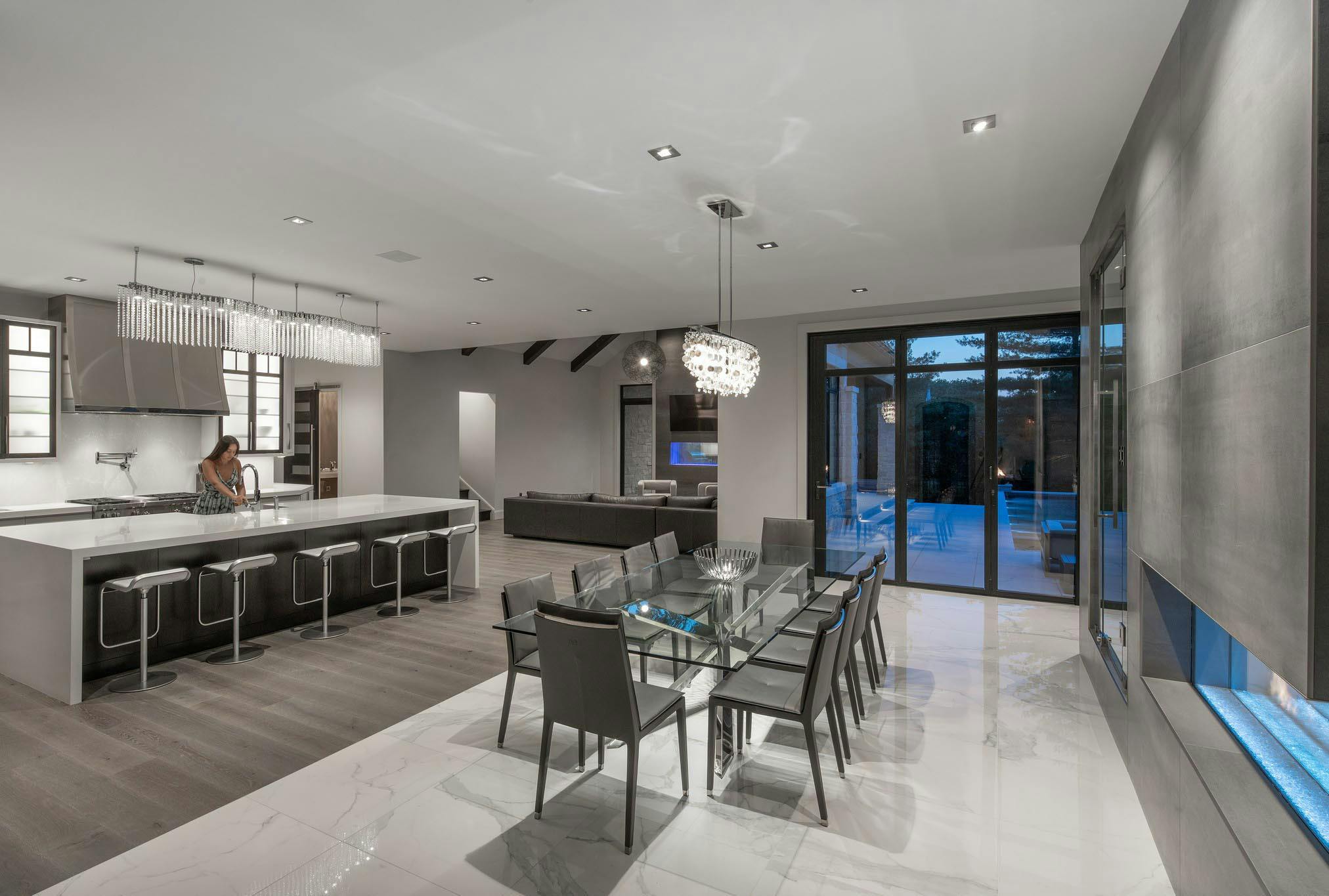 The Mesnick Residence uses a 15-foot NanaWall folding glass wall to create a bright, open indoor-outdoor living space that expands the home’s main living area into a covered patio and backyard.