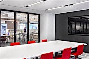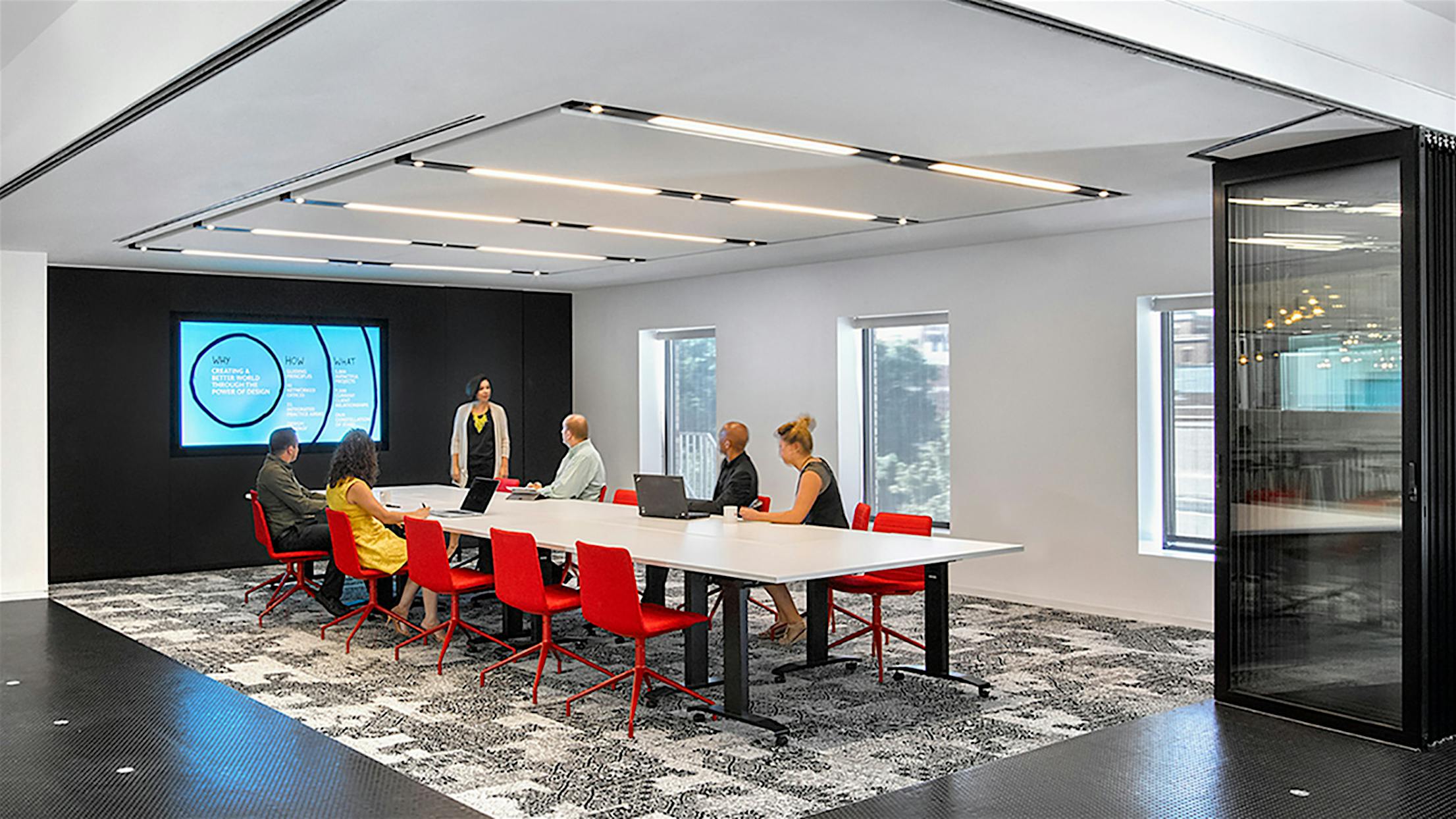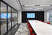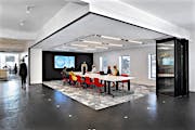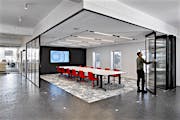To allow multiple functions within limited square footage, Gensler utilized a NanaWall operable wall system. A medium-sized conference space at an intersection of two traffic paths is walled on two sides by a NanaWall HSW60 single track sliding glass wall system. In its closed state, the room is an energetic environment, a conference room that seats 12 people in bright red chairs around a large white table and features a presentation screen on the fixed end-wall. The wall system is supported entirely by a single over-head track, locked to the floor by small, discreet latching points. The 13 dark-framed panels give the space visual definition while still offering a sense of transparency and provide acoustic privacy and sound isolation from noise generated by staffers in the nearby coffee bar and other activities.
