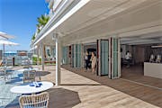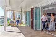 NanaWall opening glass wall systems are tailored to the needs of every commercial project. At The Del, each system was customized with two different powder coats to complement the building’s existing aesthetics. A Brick Red coating on the outside reflects the hotel’s iconic red color and existing window frames while a Bone White interior blends in with the white walls inside. When opened, the bifold glass walls appear as if they have always been part of the architecture, working in tandem to maximize functionality while preserving the hotel’s historic architecture and design.