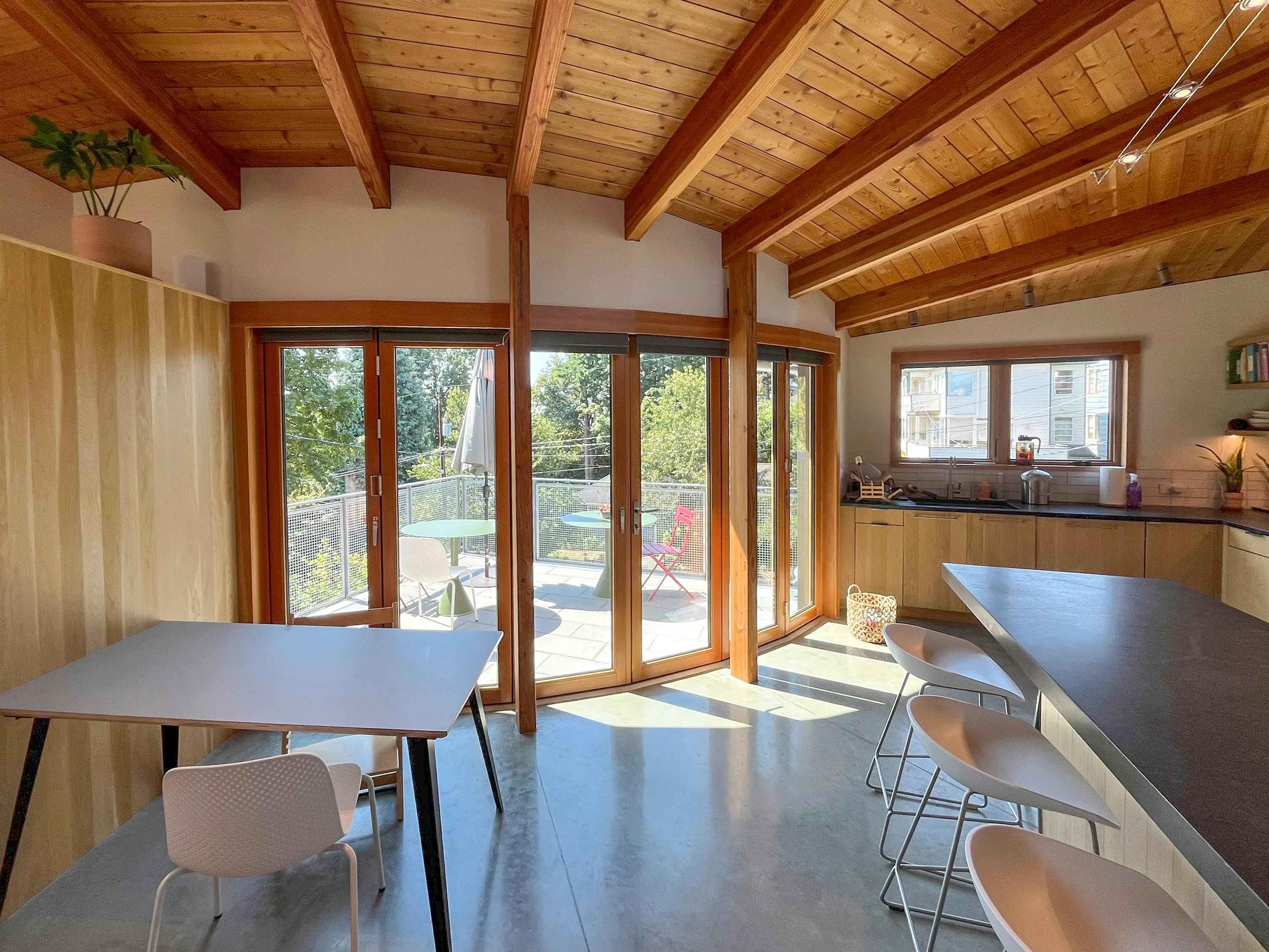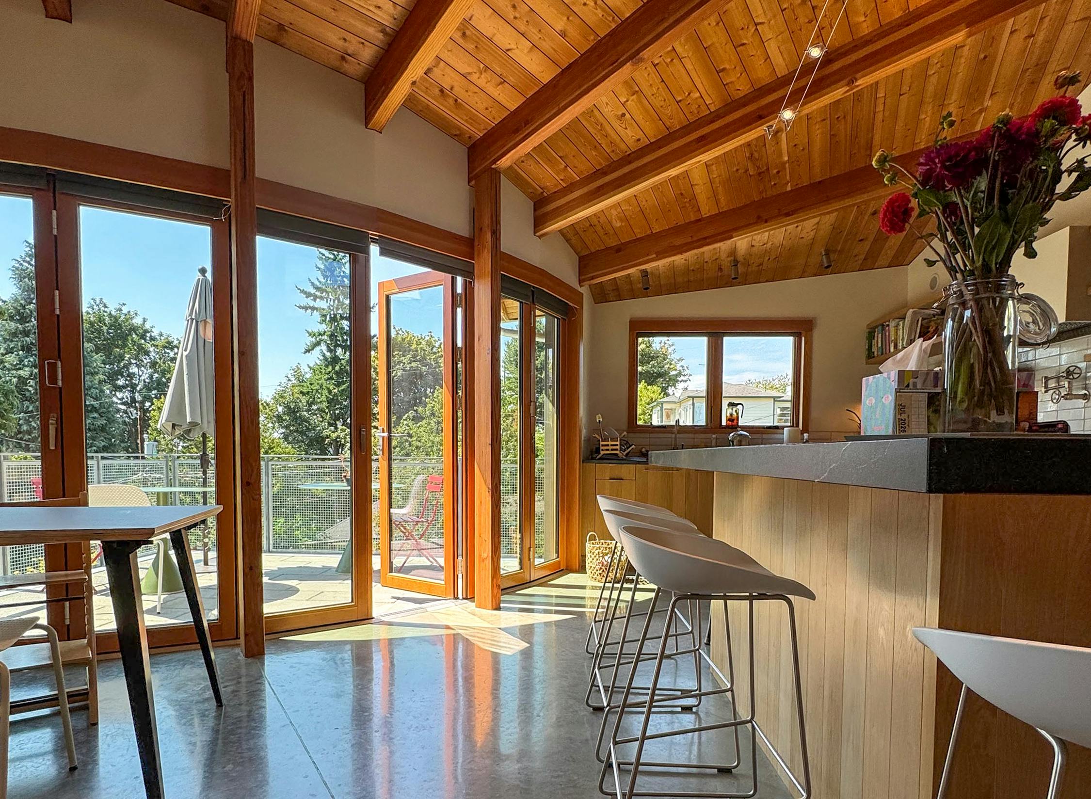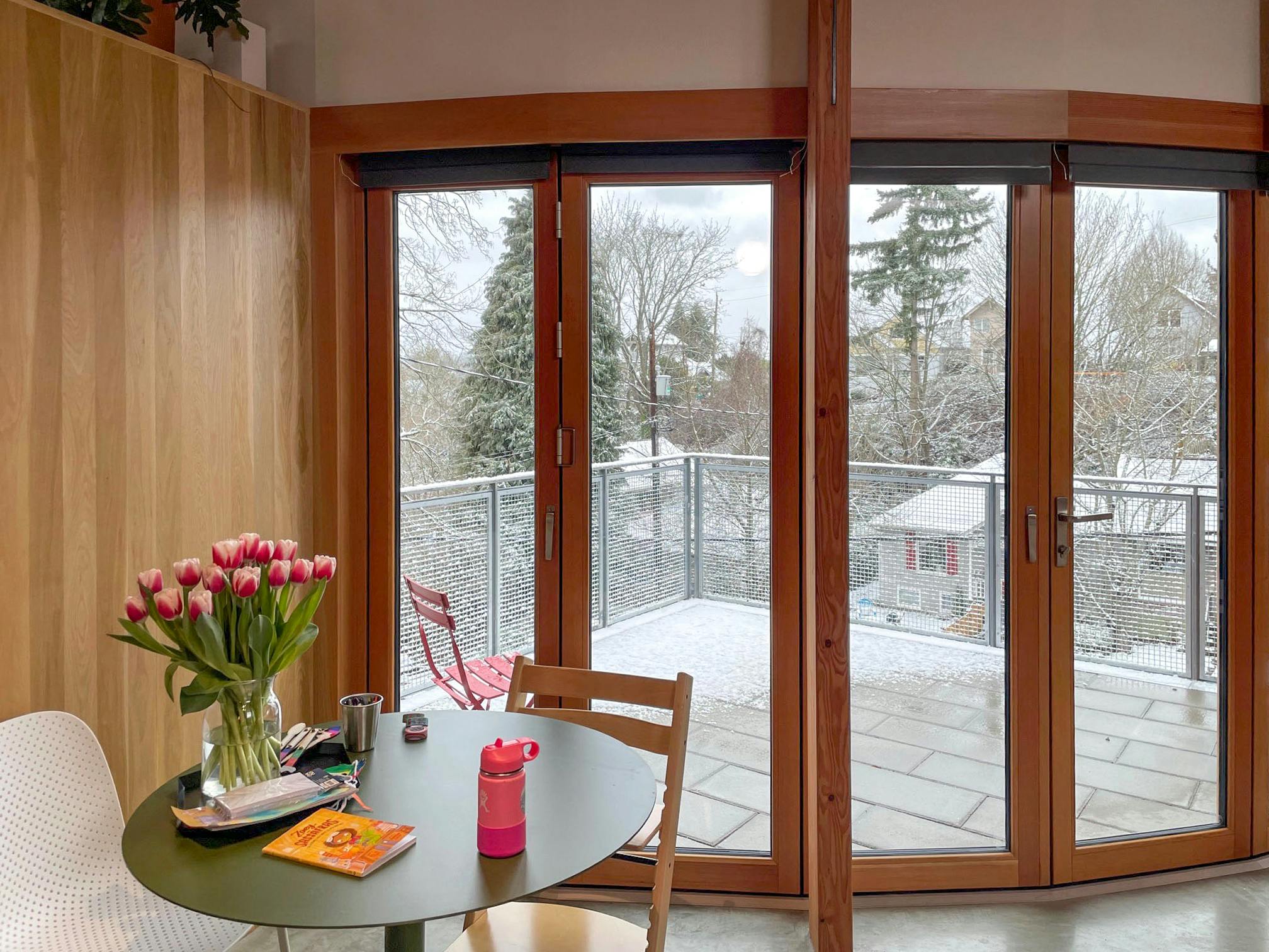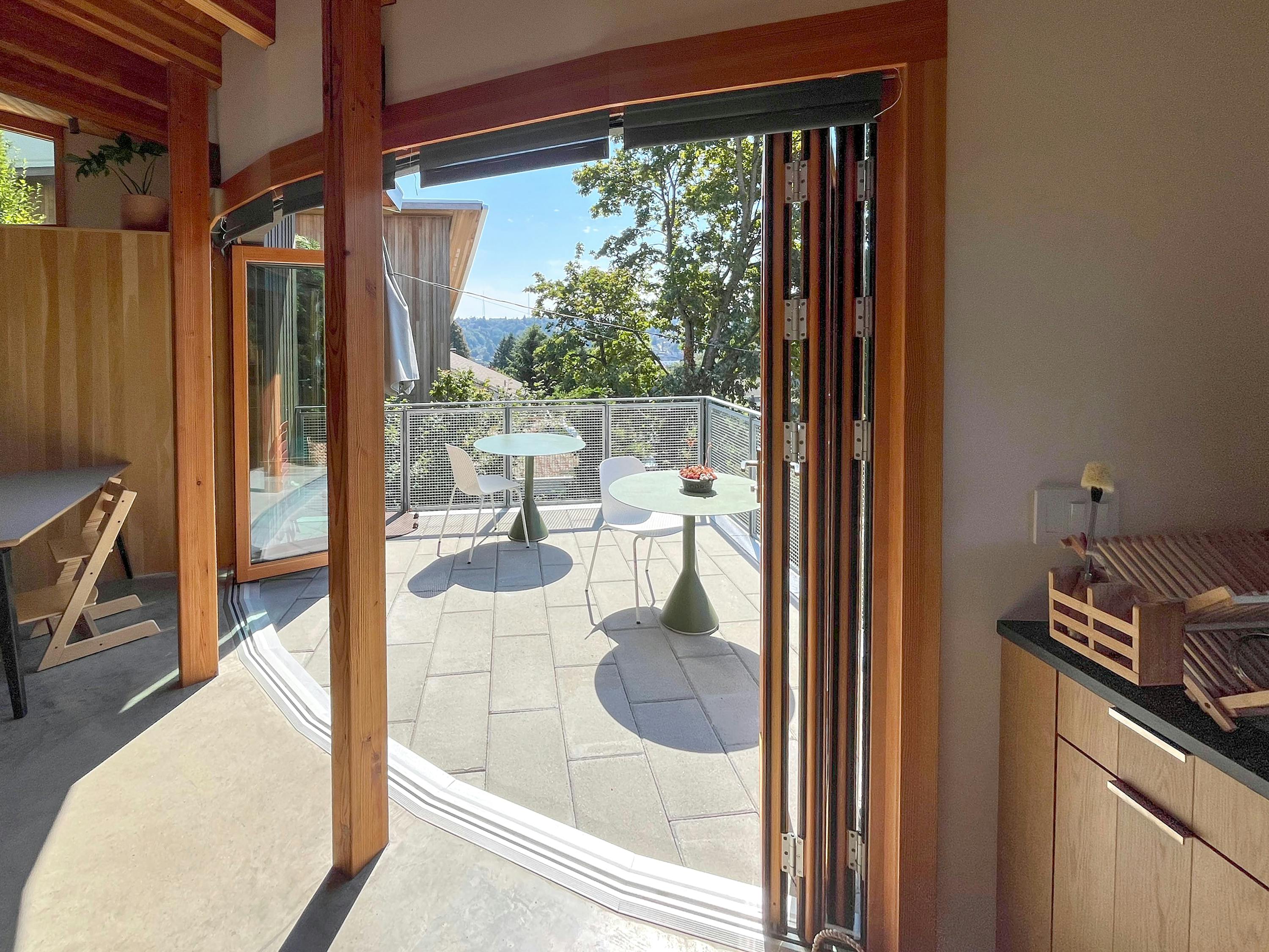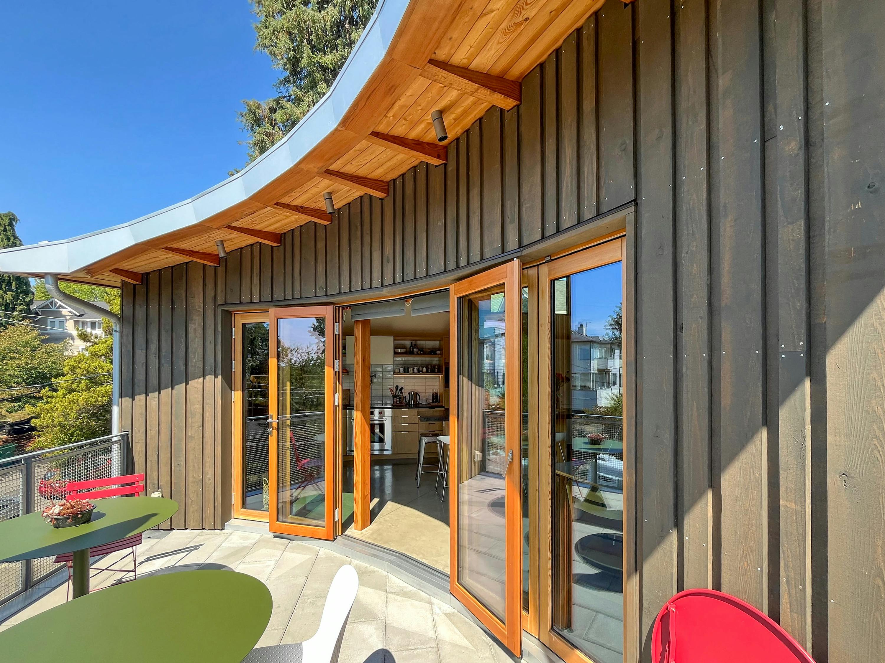 At this Washington home, the deck was designed by Odd Lot Design to be an extension of the kitchen with a striking, curved wood framed folding glass door. Despite its small footprint, the kitchen now feels larger and more connected to the outdoor.