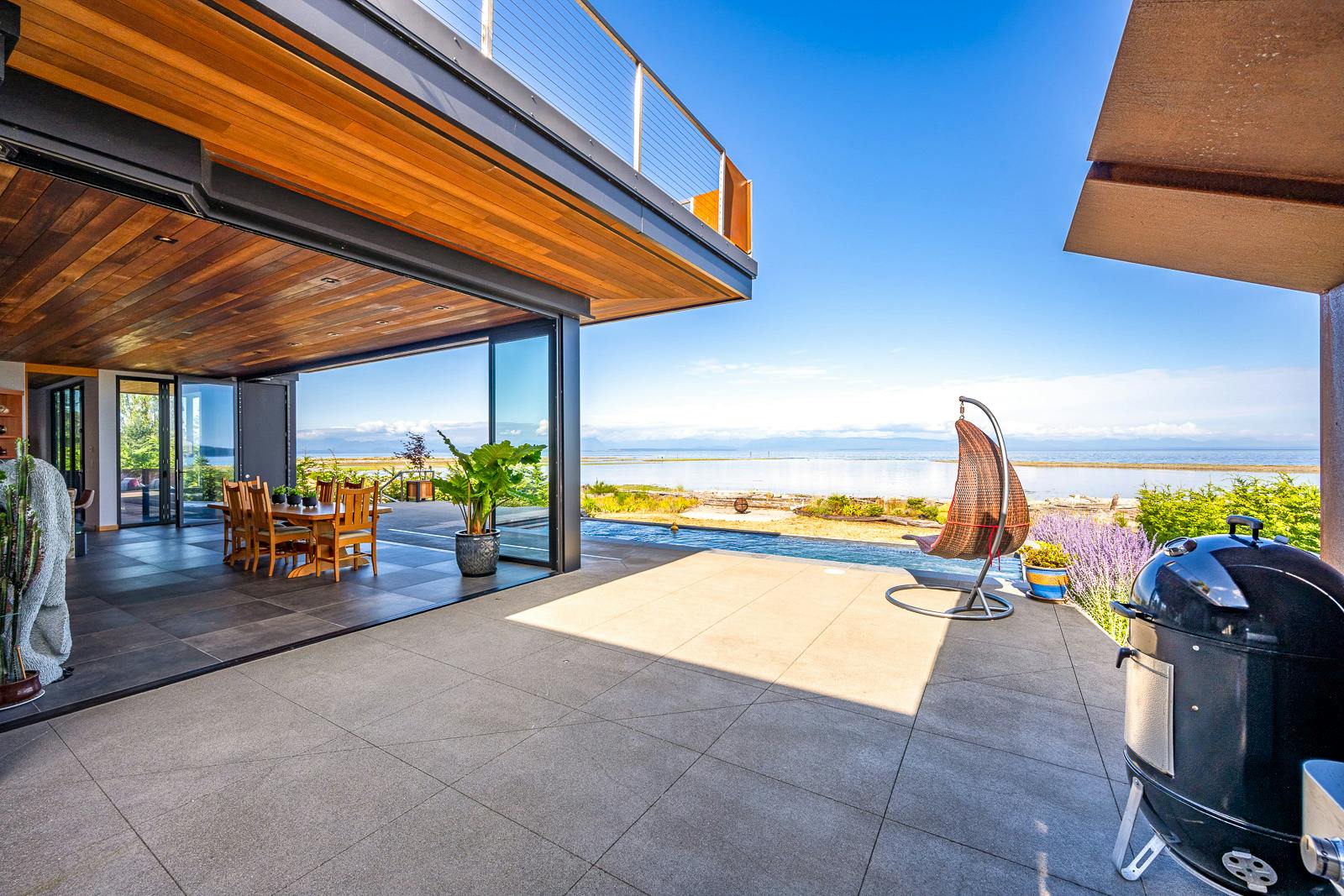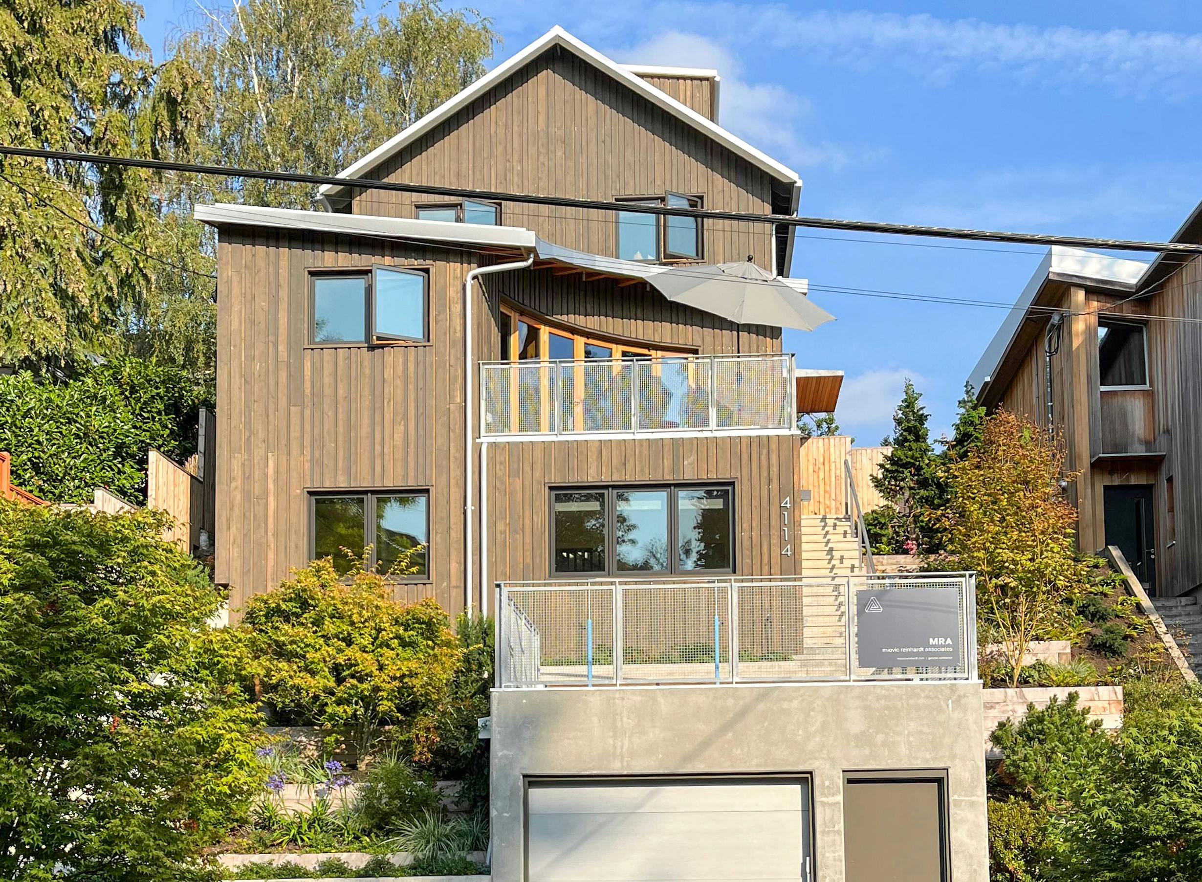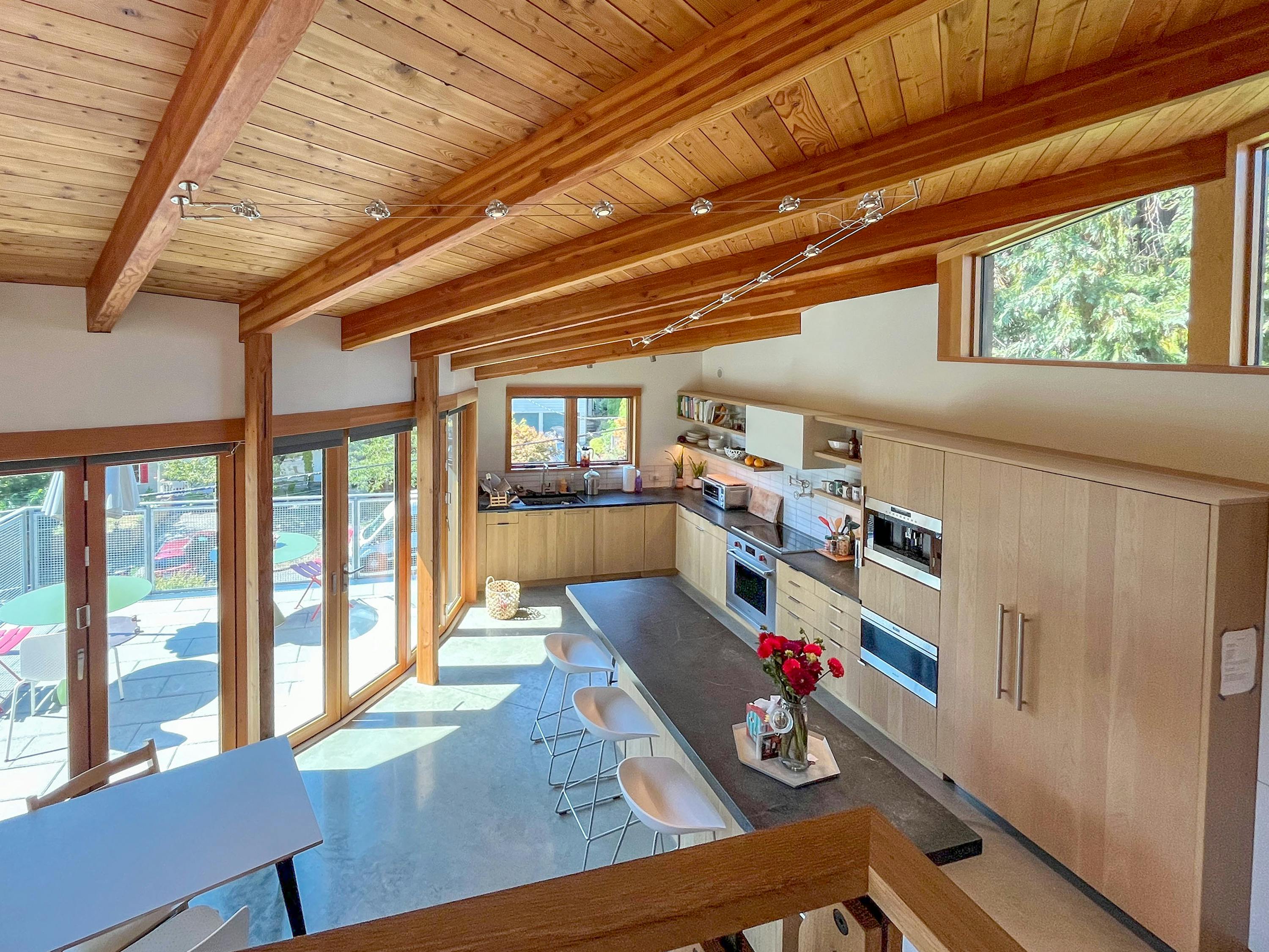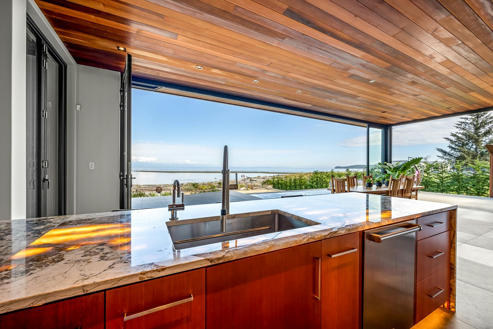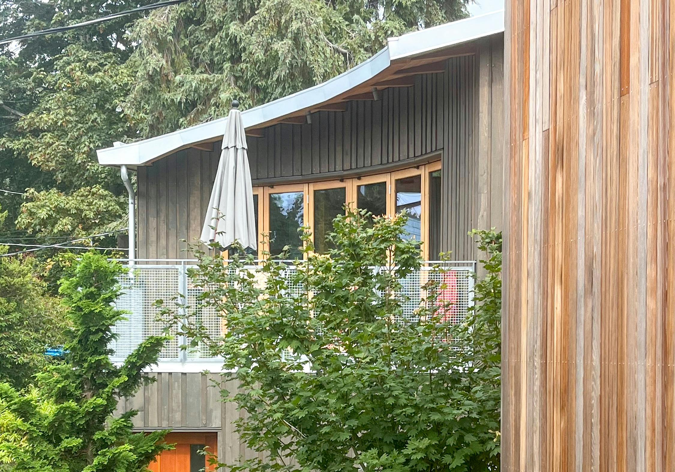At this Washington home, the deck was designed by Odd Lot Design to be an extension of the kitchen with a striking, curved wood framed folding glass door. Despite its small footprint, the kitchen now feels larger and more connected to the outdoor.
